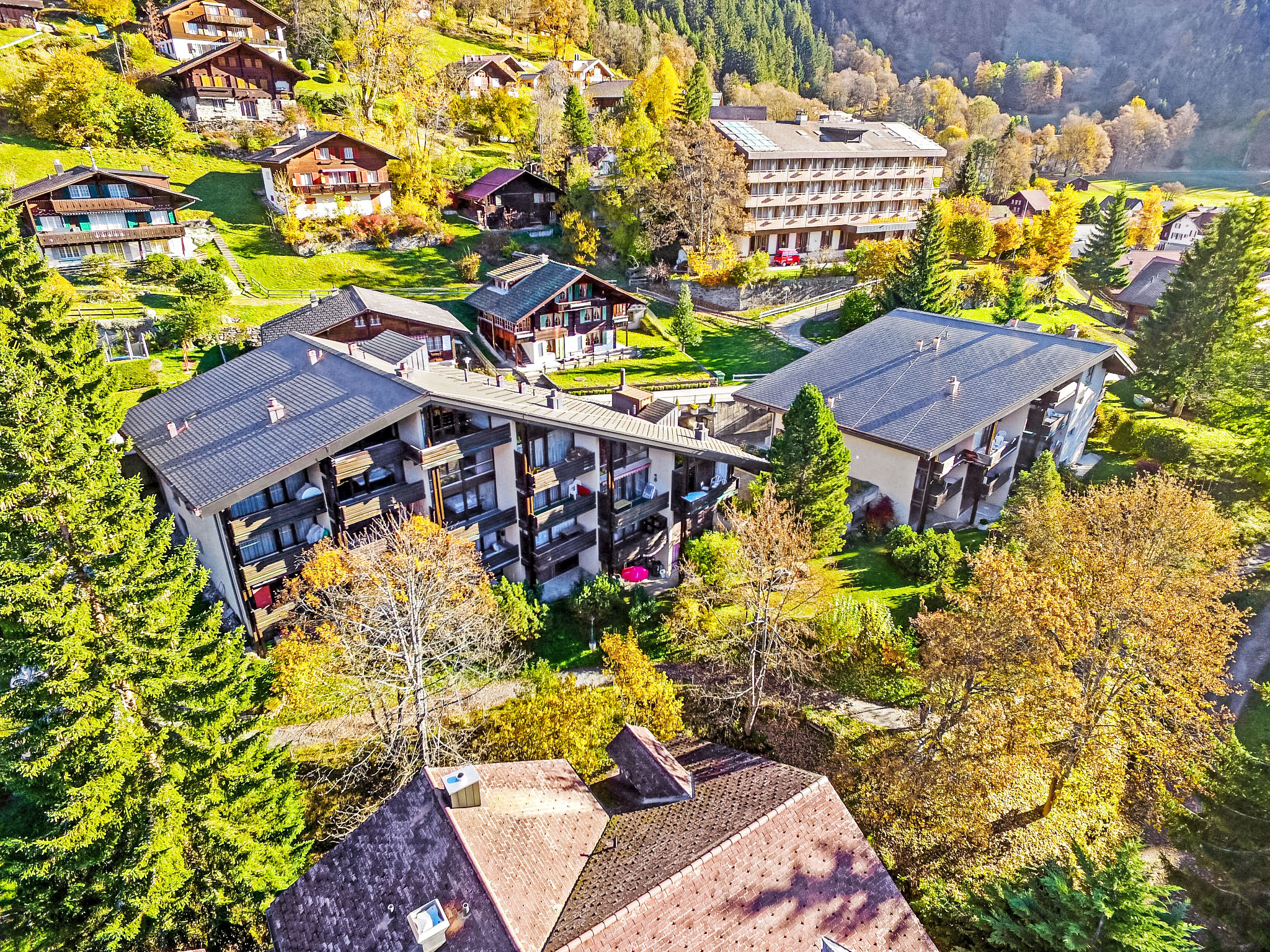 Appartementhaus "Im Gruebi". Im Ort, 300 m vom Zentrum von Wengen, zentrale, ruhige Lage. Im Hause: Sauna (extra). Waschmaschine, Wäschetrockner (zur Mitbenutzung, extra). Einkaufsservice vor Anreise möglich. Einkaufsgeschäft, Lebensmittelgeschäft, Supermarkt 300 m, Restaurant 100 m, Bäckerei 300 m, Zentrum zu Fuss in 4 Minuten erreichbar, Bahnstation "Wengen" 350 m, Freibad 600 m. Luftseilbahn, Skisportanlagen 300 m. Bitte beachten: autofreie Ferienanlage. Geeignet für Familien. Die Anreise erfolgt mit der Bergbahn. Die Anreise ist nur mit dem Zug ab Lauterbrunnen möglich – 14 Min. Fahrzeit.