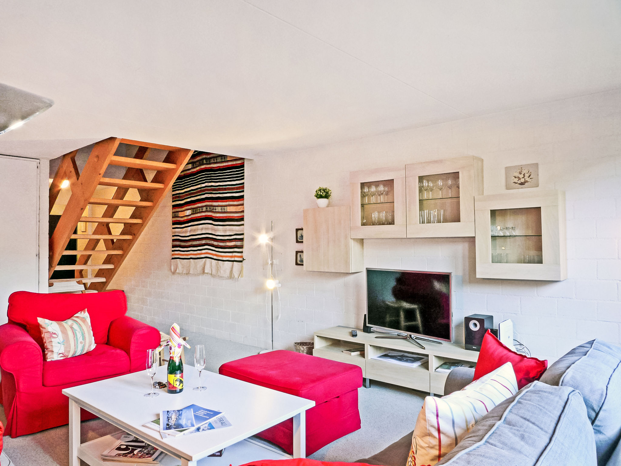 "Im Gruebi No. 10", 3-Zimmer-Wohnung 96 m2 auf 2 Stockwerken im 2. Stock. Geräumig und hell, teilweise abgeschrägt, komfortabel und gemütlich eingerichtet: Wohnzimmer mit Kabel-TV, Flachbildschirm und Radio. Ausgang zum Balkon. Wohnküche (Backofen, Geschirrspüler, 4 Induktionskochplatten, Toaster, Wasserkocher, elektrische Kaffeemaschine, Kapseln für die Kaffeemaschine (Nespresso) extra, Fondue Set (Käse)). Obergeschoss: 1 Zimmer mit 1 Doppelbett (180 cm, Länge 200 cm). 1 Zimmer mit 3 Betten (90 cm, Länge 200 cm). Bad, sep. WC. Balkon, Südlage. Balkonmöbel. Schöne Sicht auf die Berge. Zur Verfügung: Haartrockner. Internet (Wireless LAN, gratis). Bitte beachten: geeignet für Familien. Nichtraucher-Unterkunft. Eigener Eingang.