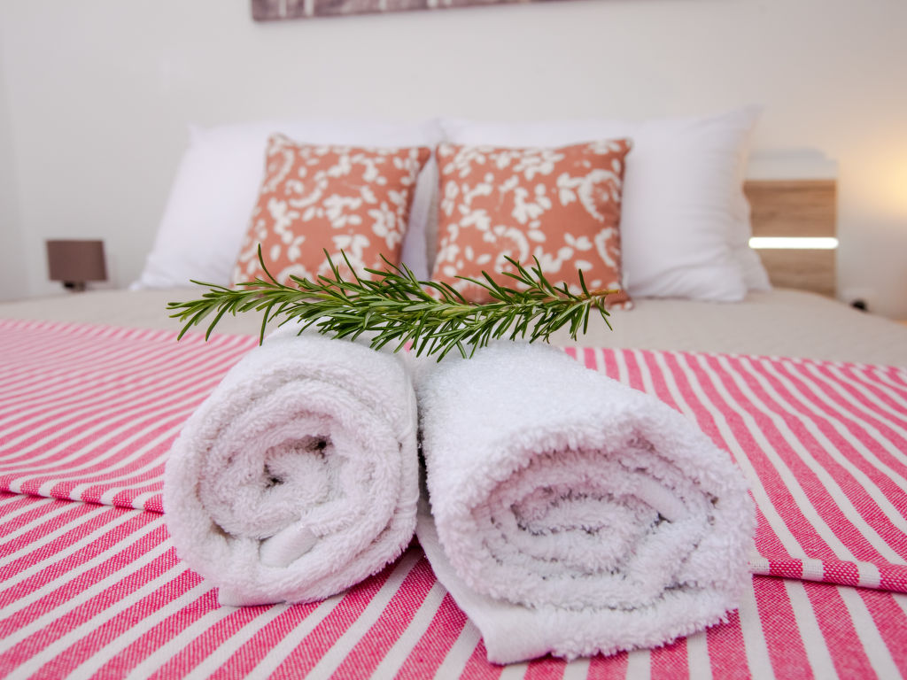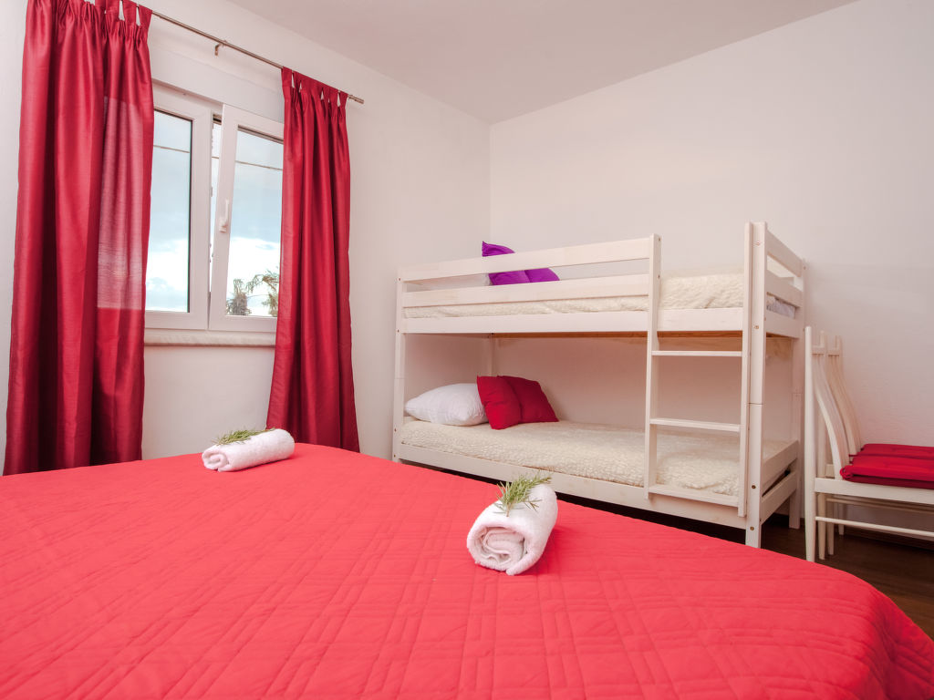 4-Zimmer-Doppelhaushälfte 75 m2, Südwestlage. Wohn-/Esszimmer 18 m2 mit TV (Flachbildschirm). 1 Zimmer mit 1 x 2 Etagenbetten (90 cm, Länge 200 cm), 1 franz. Bett (180 cm, Länge 200 cm), Ventilator. 1 Zimmer mit 1 Bett (90 cm, Länge 200 cm), 1 Doppelbett (2 x 90 cm, Länge 190 cm), Dusche/WC und Klimaanlage. 1 Zimmer mit 1 Doppelbett (2 x 90 cm, Länge 200 cm), Klimaanlage. Offene Küche (Backofen, Geschirrspüler, 4 Glaskeramikherd Platten, Tiefkühler, elektrische Kaffeemaschine). Dusche/Bidet/WC. Terrasse 30 m2. Terrassenmöbel, Liegestühle. Sicht auf das Schwimmbad. Zur Verfügung: Internet (Wireless LAN, gratis). 1 kleines Haustier/Hund erlaubt.