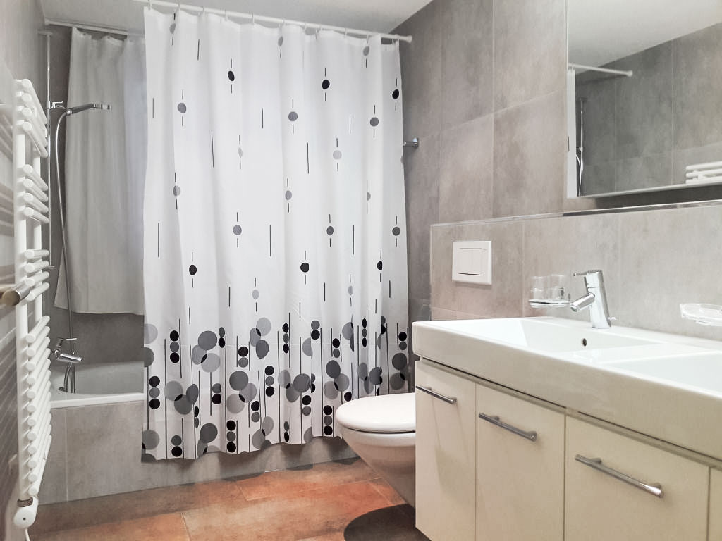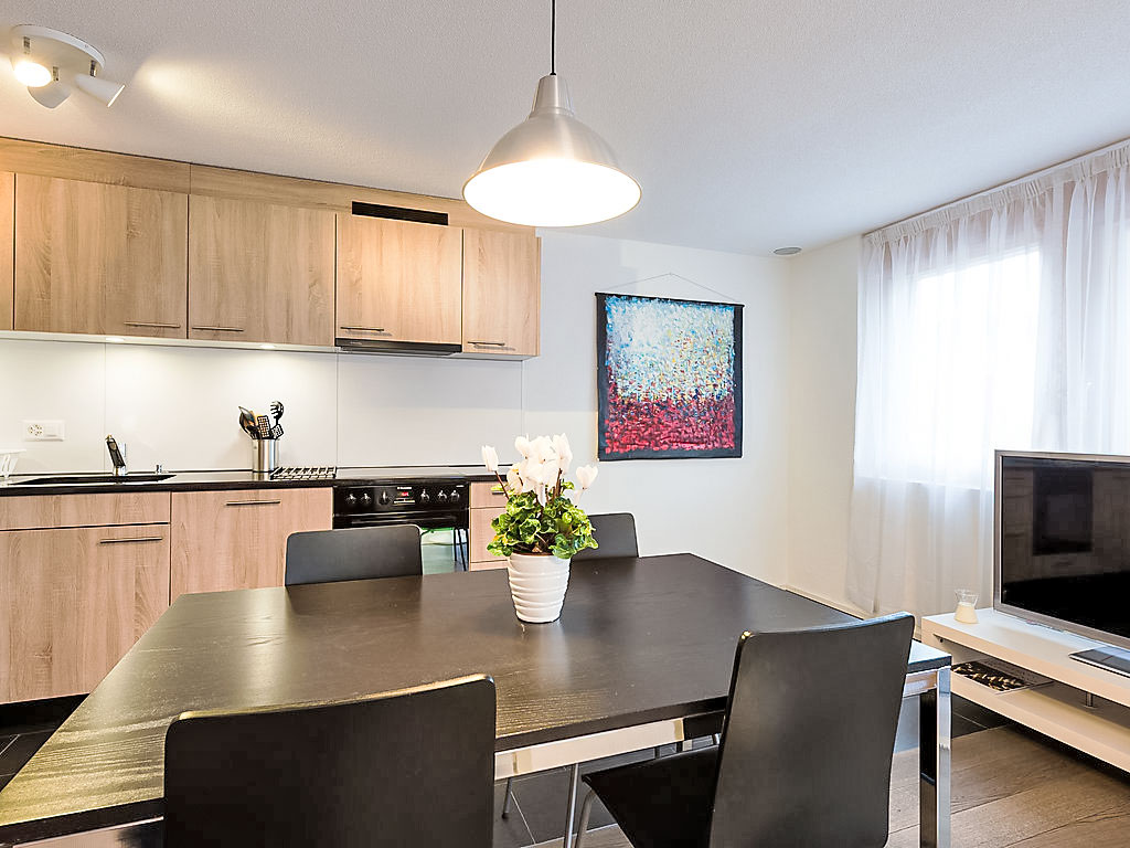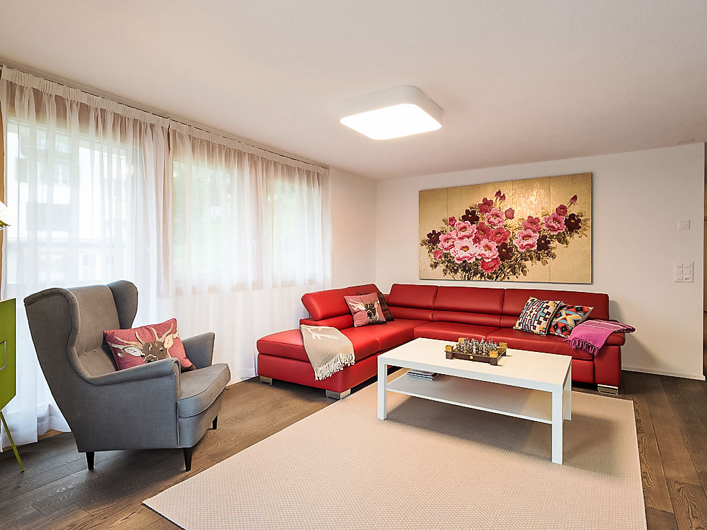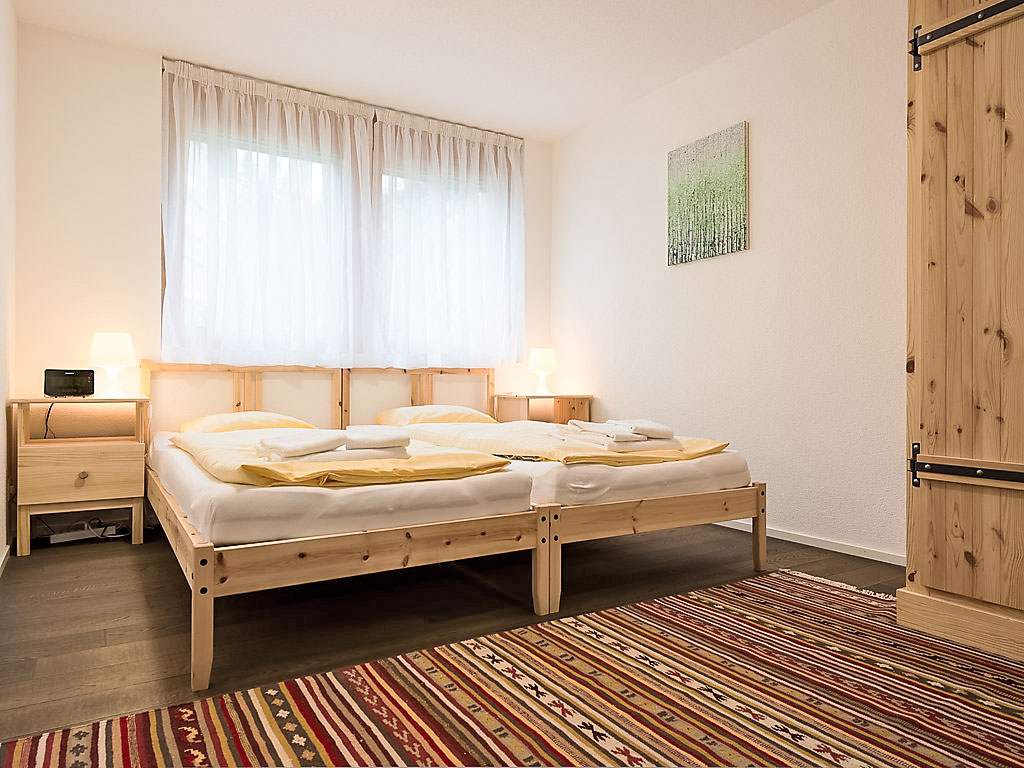 "Apt. 2", 3-Zimmer-Wohnung 100 m2 im 2. Stock. Geräumig und hell, modern und geschmackvoll eingerichtet: Wohnzimmer mit Kabel-TV und Stereoanlage. 2 Zimmer, jedes Zimmer mit 2 Betten (90 cm, Länge 200 cm), Radio. Offene Küche (Backofen, Geschirrspüler, 4 Glaskeramikherd Platten, Toaster, Wasserkocher, elektrische Kaffeemaschine, Kapseln für die Kaffeemaschine (Nespresso) extra, Fondue Set (Käse)). Dusche/WC, Bad/Dusche/WC. Grosse Terrasse. Terrassenmöbel. Sehr schöne Panoramasicht auf die Berge. Zur Verfügung: Haartrockner. Internet (Wireless LAN, gratis). Bitte beachten: Nichtraucher-Unterkunft.
