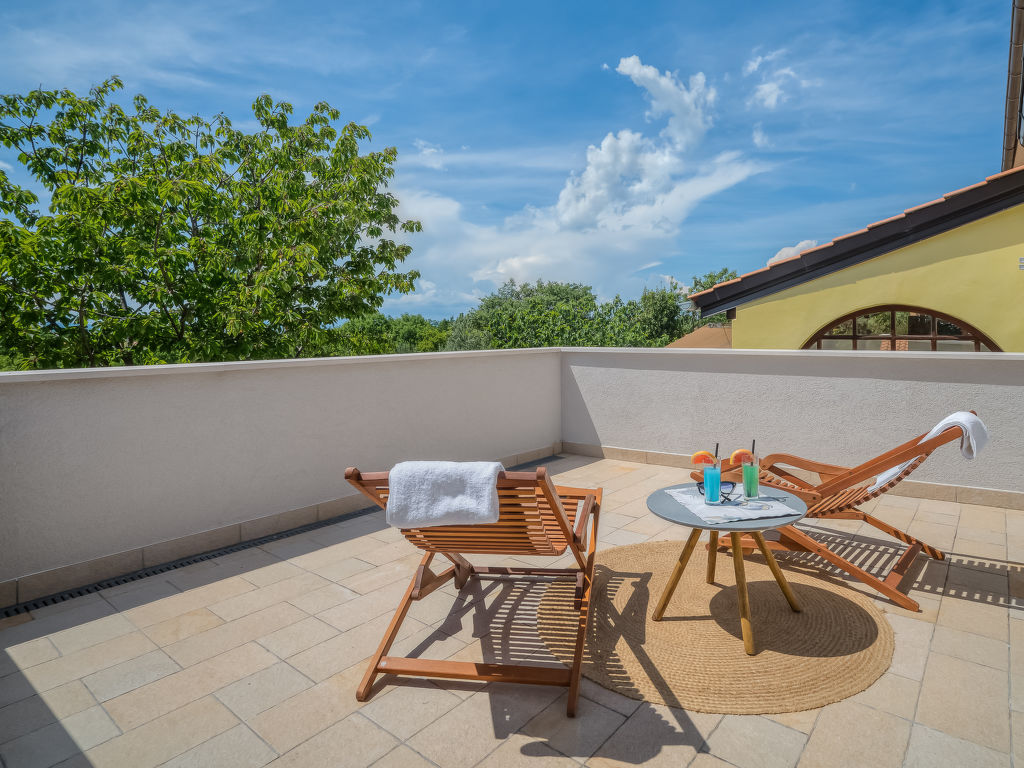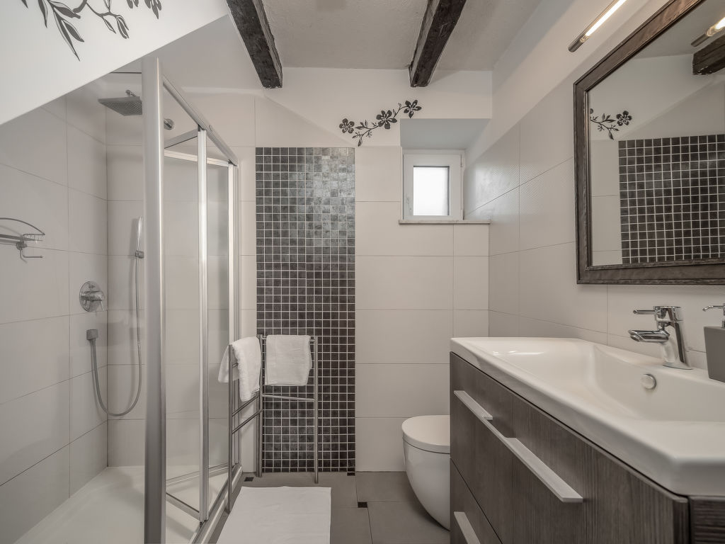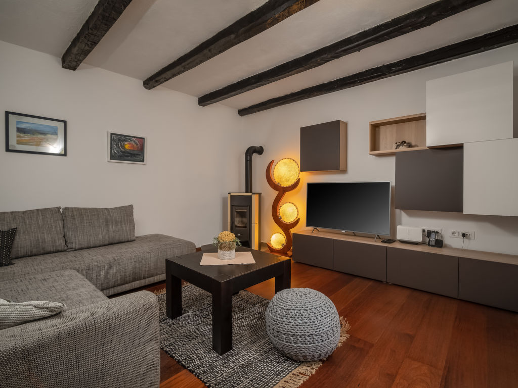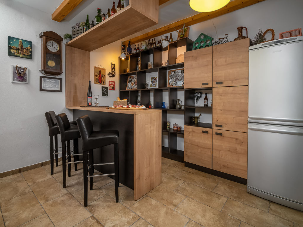 3-Zimmer-Doppelhaushälfte 130 m2 auf 2 Stockwerken, Südlage. Schön und rustikal eingerichtet: Wohnzimmer mit 1 Doppeldiwanbett (140 cm, Länge 210 cm), Sat-TV (Flachbildschirm). Esszimmer 20 m2. Küche (Backofen, Geschirrspüler, 4 Glaskeramikherd Platten, Tiefkühler, elektrische Kaffeemaschine) mit Esstisch. Dusche/WC. Obergeschoss: 1 Zimmer mit 1 franz. Bett (160 cm, Länge 200 cm). 1 Zimmer mit 1 Doppelbett (2 x 90 cm, Länge 200 cm), Klimaanlage. Terrasse 20 m2. Gartengrill (mobil), Liegestühle. Zur Verfügung: Internet (Wireless LAN, gratis). 1 Haustier/Hund erlaubt. Der Speisesaal im Erdgeschoss ist als rustikale Taverne eingerichtet.