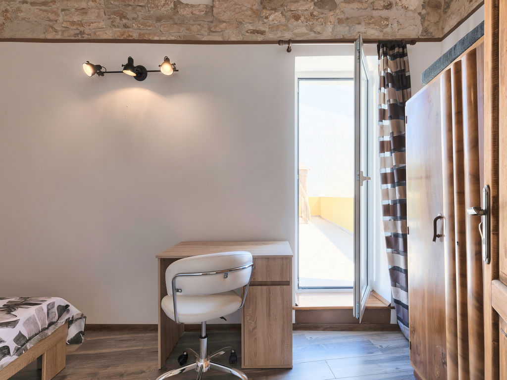4-Zimmer-Reihenhaus 130 m2 auf 2 Stockwerken. Wohn-/Esszimmer mit Sat-TV (Flachbildschirm), Klimaanlage. 1 Zimmer mit 1 franz. Bett (160 cm, Länge 200 cm), Dusche/WC. Offene Küche (Backofen, 4 Glaskeramikherd Platten, Tiefkühler, elektrische Kaffeemaschine). Bad/WC. Obergeschoss: Eingang mit Klimaanlage. 1 Zimmer mit 1 Doppelbett (2 x 90 cm, Länge 200 cm). 1 Zimmer mit 1 franz. Bett (140 cm, Länge 200 cm). Ausgang zur Terrasse. Terrasse 70 m2. Terrassenmöbel, Gartengrill (mobil), Liegestühle. Zur Verfügung: Safe, Haartrockner. Internet (Wireless LAN, gratis). 1 kleines Haustier/Hund erlaubt.