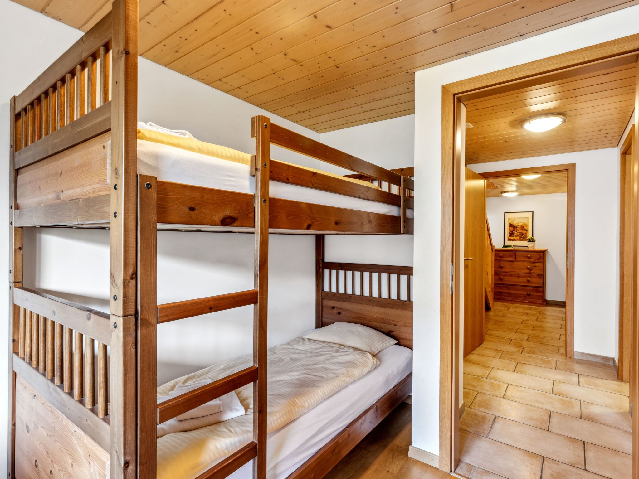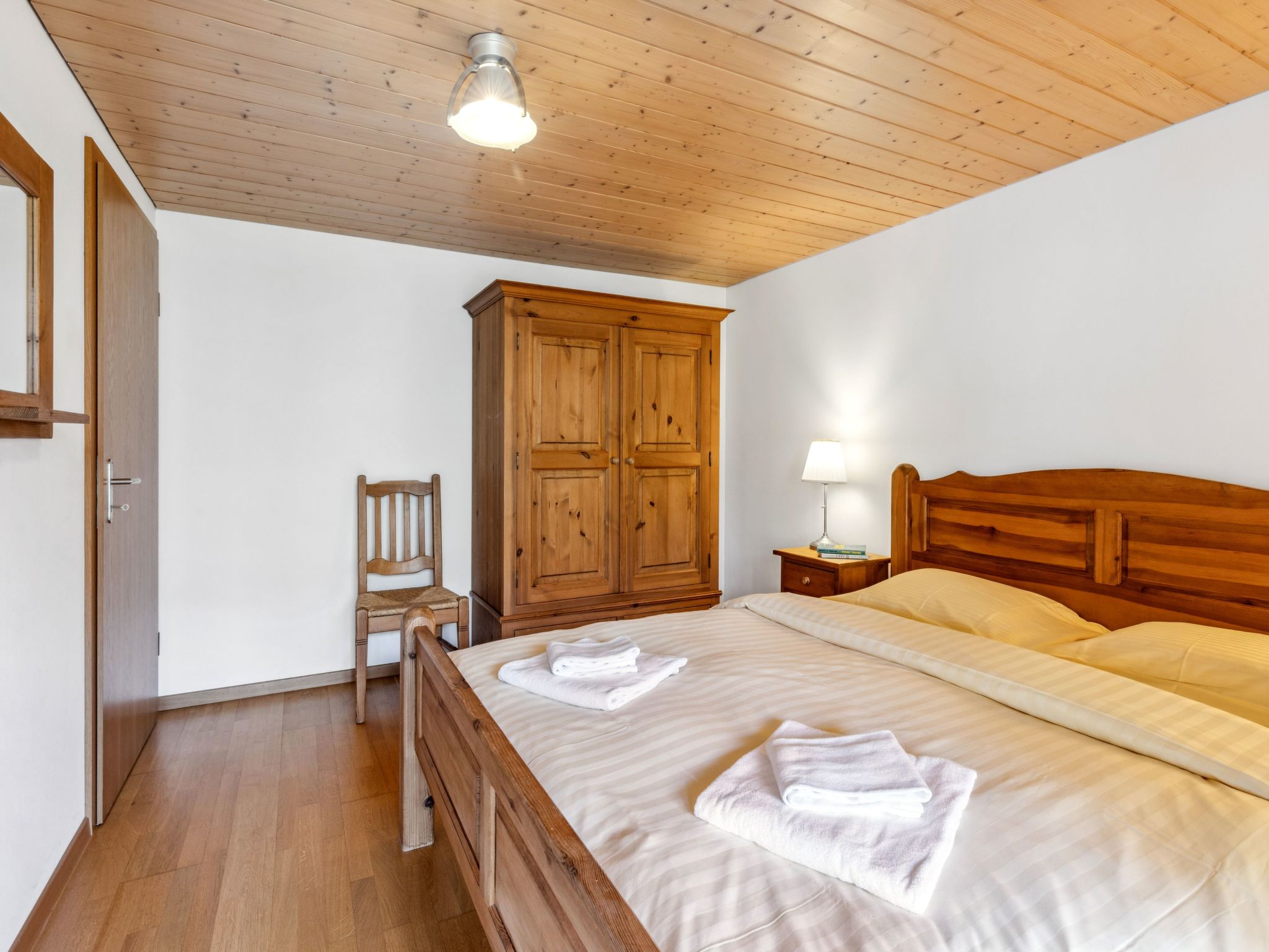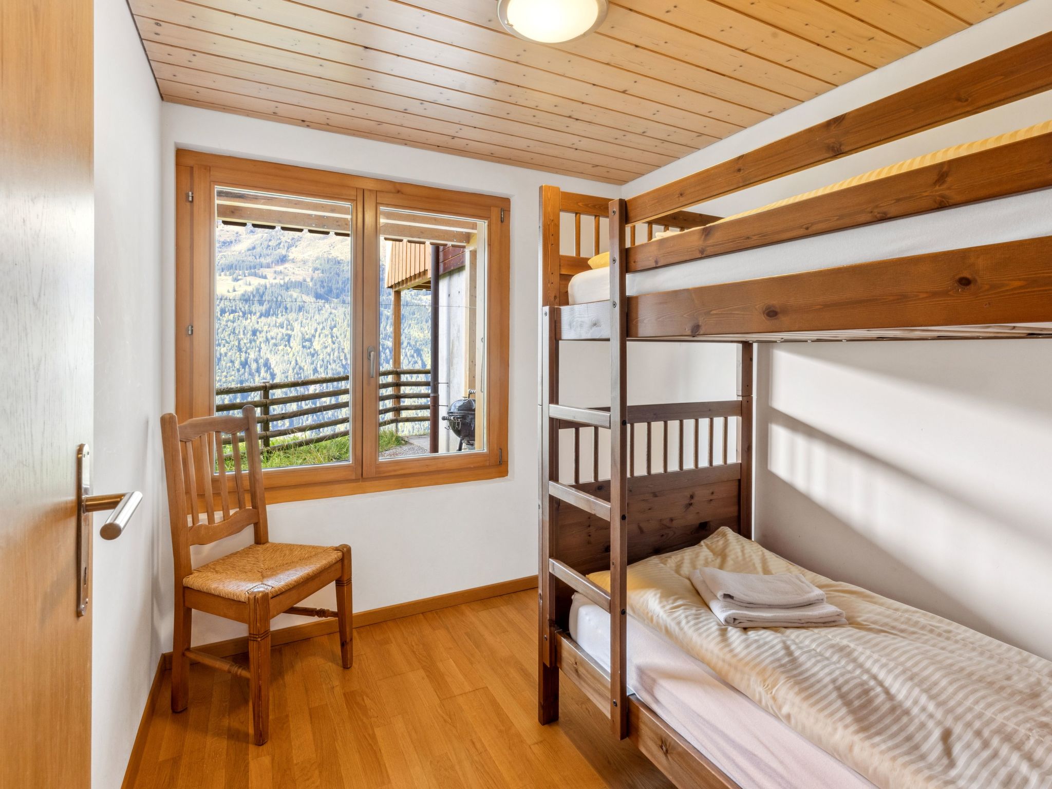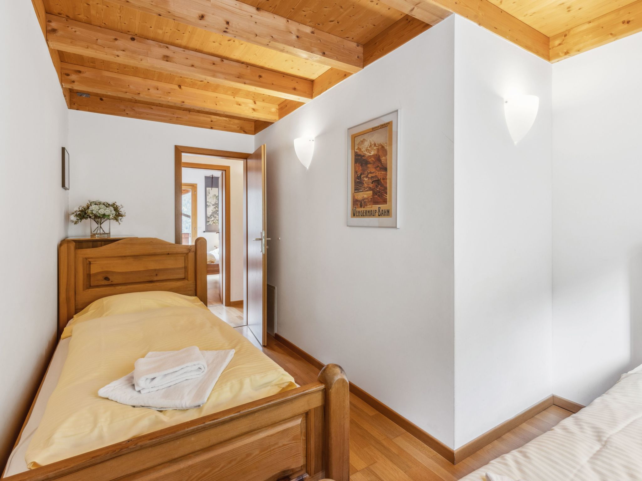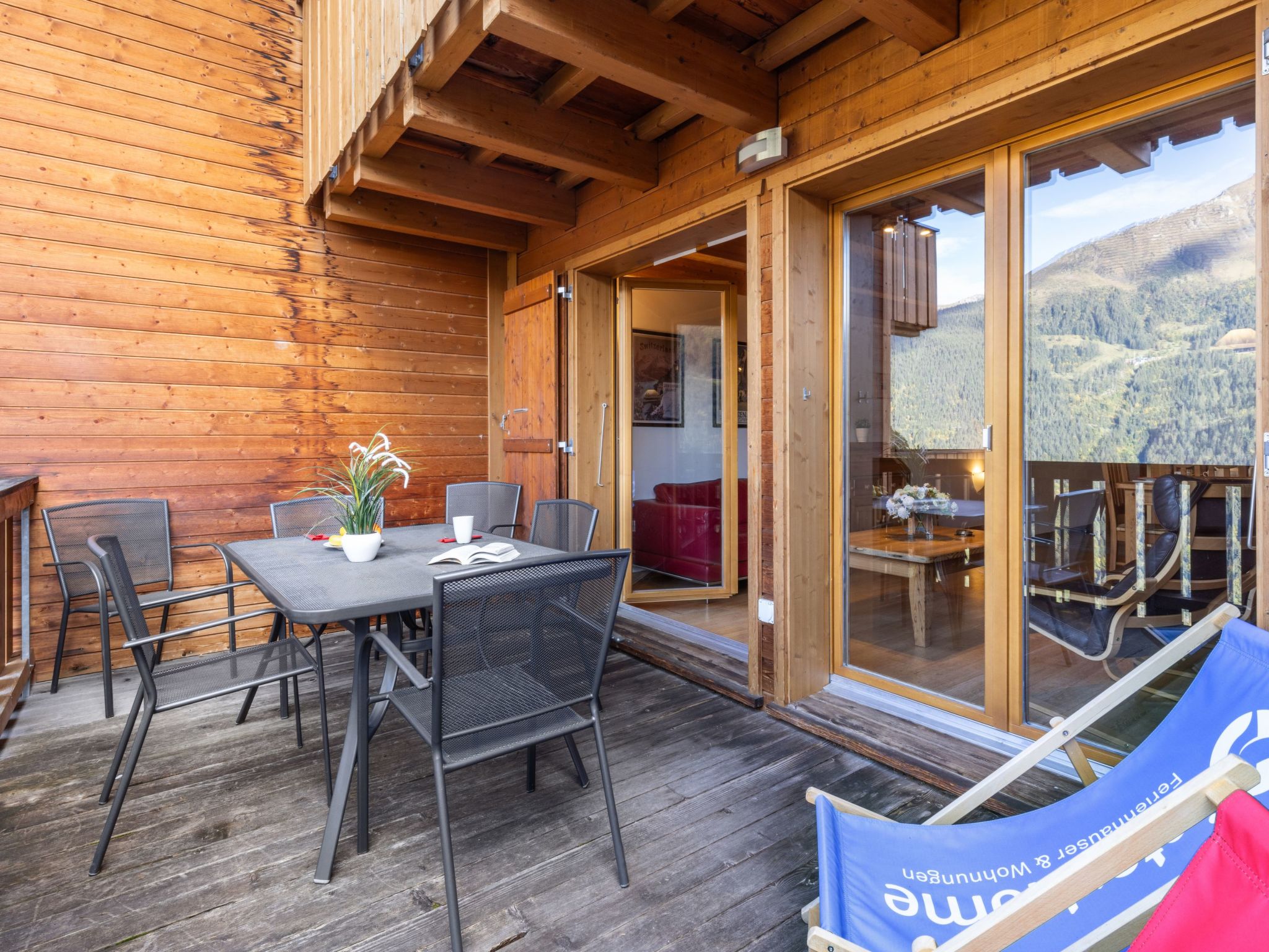 "Apt. No.07", 5-Zimmer-Wohnung 140 m2 auf 3 Stockwerken. Geräumig und hell, modern und geschmackvoll eingerichtet: Wohn-/Esszimmer mit Schwedenofen, Esstisch, Radio und CD. Grosse, offene Küche (Backofen, Geschirrspüler, 4 Glaskeramikherd Platten, Toaster, Wasserkocher, elektrische Kaffeemaschine, Kapseln für die Kaffeemaschine (Nespresso) extra, Racletteofen, Fondue Set (Käse)). Sep. WC. Unteres Geschoss: 1 Zimmer mit 1 Doppelbett (1 x 160 cm, Länge 200 cm). 1 Zimmer mit 1 x 2 Etagenbetten (90 cm, Länge 200 cm). Dusche/WC, Sauna. Obergeschoss: 1 Zimmer mit 1 Doppelbett (1 x 160 cm, Länge 200 cm), Bad/Dusche/WC. 1 Zimmer mit 2 Betten (90 cm, Länge 200 cm), Dusche/WC. 2 Balkone, Westlage. Balkonmöbel. Sehr schöne Sicht auf die Berge und das Tal. Zur Verfügung: Waschmaschine, Wäschetrockner, Haartrockner, Holz (extra). Internet (Wireless LAN, gratis). Bitte beachten: Nichtraucher-Unterkunft. Kein TV.