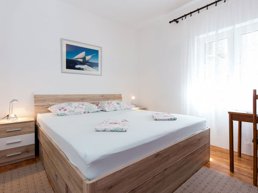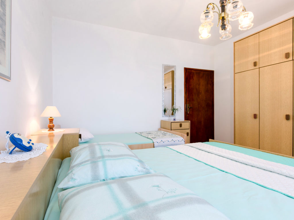 3-Zimmer-Wohnung 70 m2 im 1. Stock. Wohn-/Esszimmer mit Sat-TV und Klimaanlage. Ausgang zum Balkon. 1 Zimmer mit 1 Doppelbett (2 x 90 cm, Länge 200 cm). 1 Zimmer mit 1 Bett (90 cm, Länge 190 cm), 1 Doppelbett (2 x 90 cm, Länge 190 cm). Ausgang zum Balkon. Offene Küche (4 Induktionskochplatten, Toaster, Wasserkocher, Tiefkühler, elektrische Kaffeemaschine). Bad/WC. Klimaanlage (extra). Parkettböden. Balkon 12 m2. Balkonmöbel, Liegestühle (2). Sicht auf das Meer. Zur Verfügung: Waschmaschine, Bügeleisen. Internet (Wireless LAN, gratis). 1 kleines Haustier/Hund erlaubt.