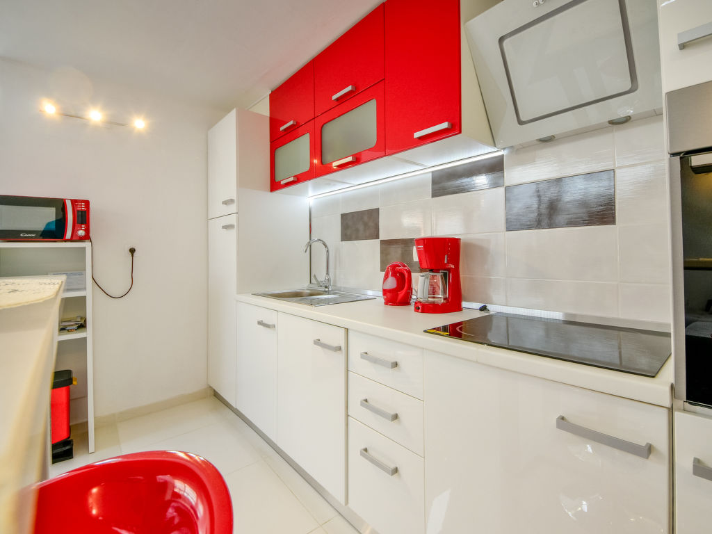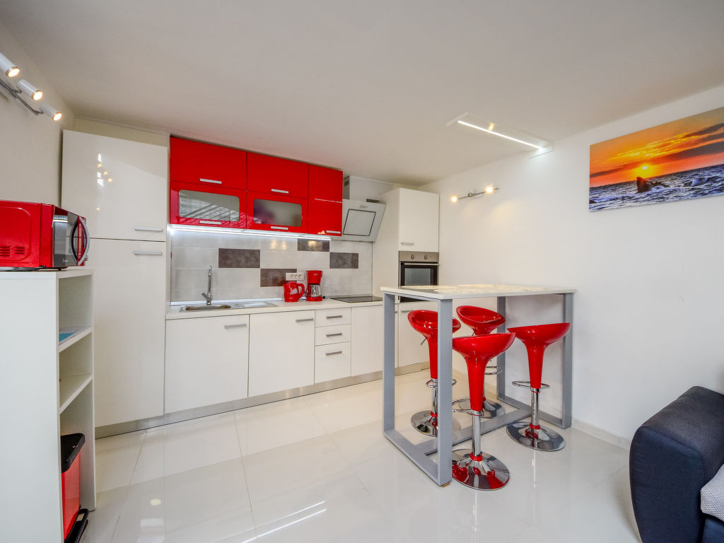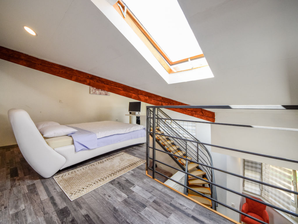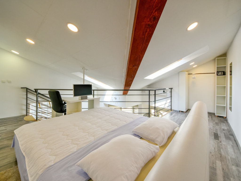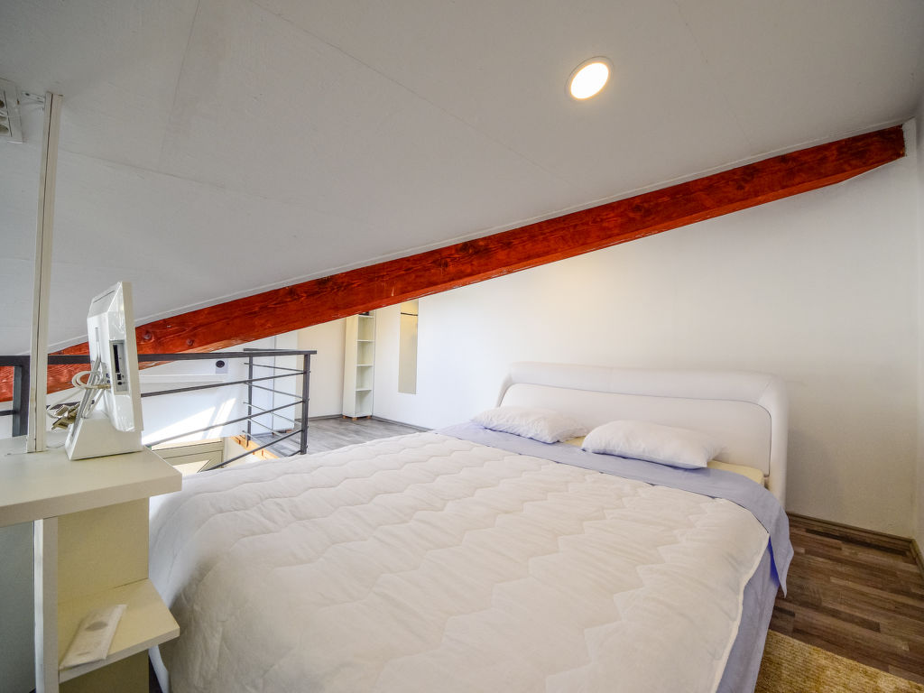 1-Zimmer-Doppelhaushälfte 45 m2 auf 2 Stockwerken. Wohn-/Esszimmer mit 1 Doppeldiwanbett (160 cm, Länge 210 cm), Sat-TV (Flachbildschirm), Stereoanlage und Klimaanlage. Offene Küche (Backofen, 4 Glaskeramikherd Platten, Mikrowelle, elektrische Kaffeemaschine). Dusche/WC, Hydromassage-Dusche. Warmluftheizung (extra). Dachgeschoss: abgeschrägte, offene Galerie, Deckenhöhe 110 - 235 cm mit Dachfenster mit 1 franz. Bett (180 cm, Länge 200 cm), Sat-TV (Flachbildschirm). Liegestühle. Zur Verfügung: Safe. Internet (Wireless LAN, gratis).