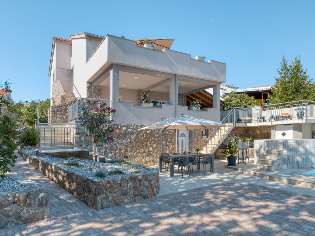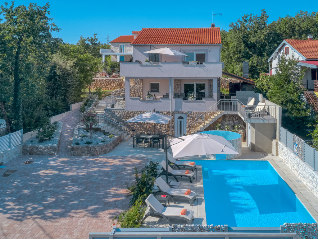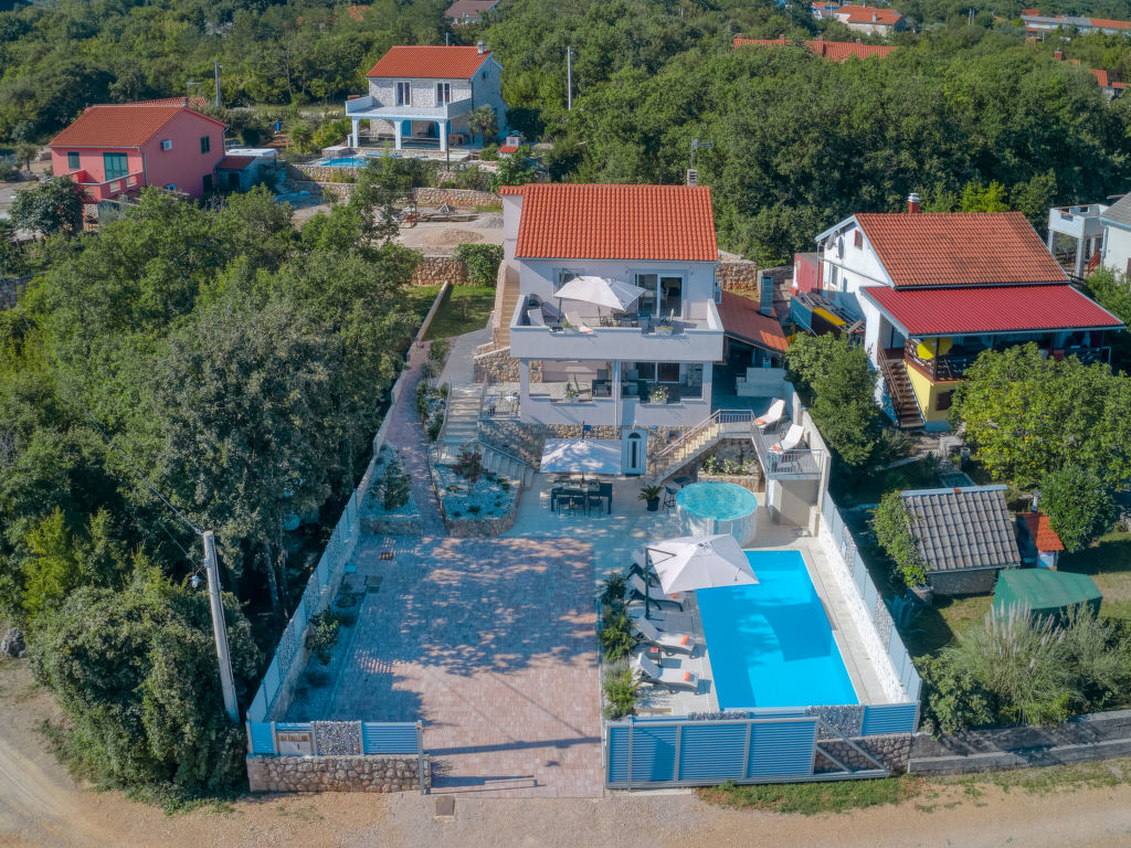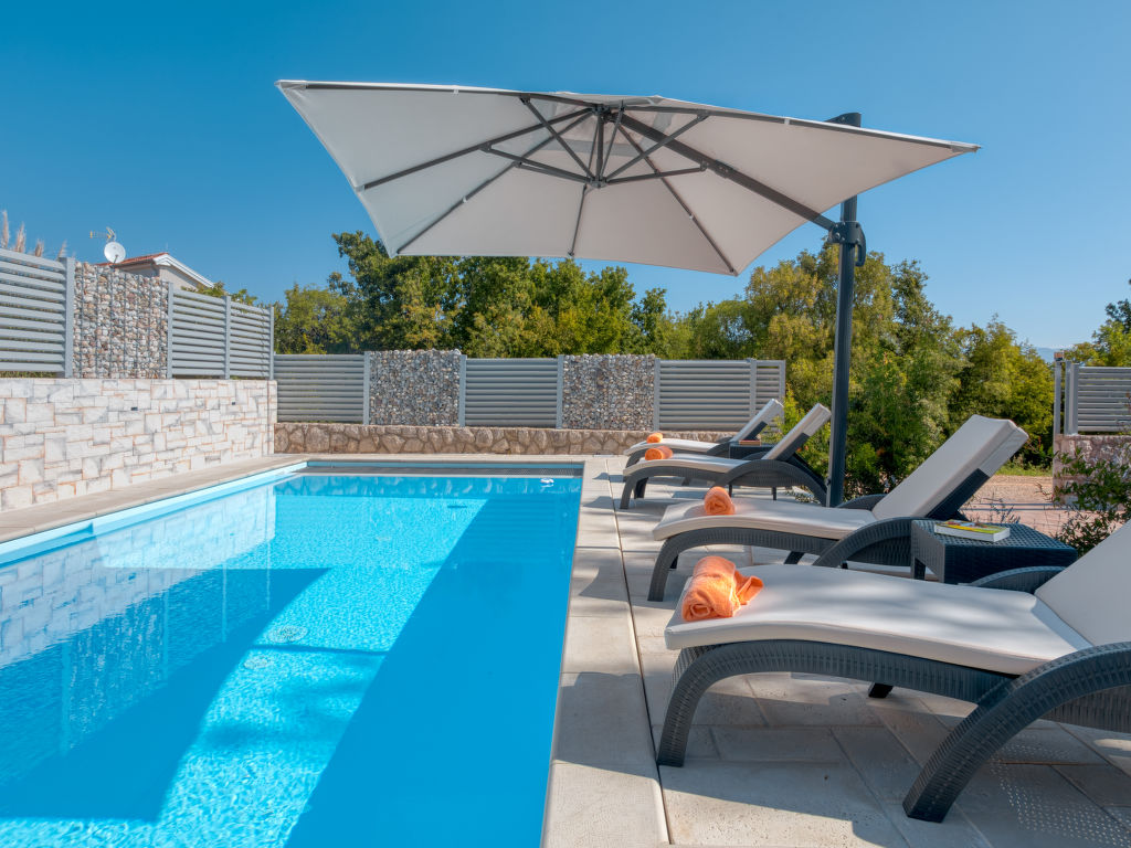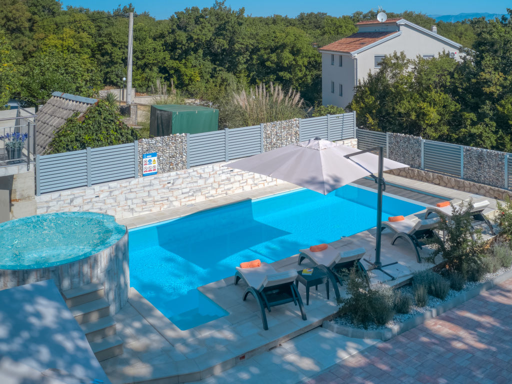Einfamilienhaus "Lavendel", auf 2 Stockwerken. Im Weiler Donja Hlapa, 12 km vom Zentrum von Malinska, 3.5 km vom Zentrum von Klimno, 16 km vom Zentrum von Krk, am Hang, 2.5 km vom Meer, 2.5 km vom Strand. Zur Alleinbenutzung: Grundstück 500 m2 mit Pflanzen und Bäumen, Schwimmbad beheizt (8 x 4 m, 150 cm tief, 15.03.-15.11.). Aussendusche, Sprudelbad. Im Hause: Internetzugang, Waschmaschine. Zufahrt bis 200 m zum Haus (Naturweg). Parkplatz (für 3 Autos) beim Haus auf dem Grundstück. Supermarkt 2 km, Sandstrand 5 km, Kieselstrand 2.5 km. Bitte beachten: Flugplatz 14 km vom Haus. Die Wohneinheit besteht aus 2 Wohnungen, die aber zusammen vermietet werden. Schwimmbad beheizt (extra).