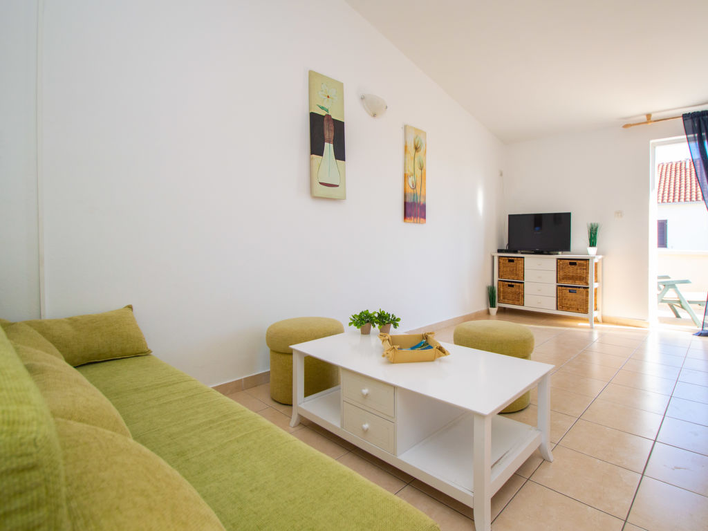 3-Zimmer-Wohnung 50 m2 im 1. Stock, Südlage. Schön und gemütlich eingerichtet: Wohn-/Esszimmer mit 1 Diwanbett (140 cm, Länge 190 cm), Sat-TV, Flachbildschirm und Klimaanlage. Ausgang zur Terrasse. 1 Zimmer mit 1 Doppelbett (2 x 80 cm, Länge 200 cm). 1 Zimmer mit 2 Betten (80 cm, Länge 200 cm). Offene Küche (2 Kochplatten, Mikrowelle, Tiefkühler, elektrische Kaffeemaschine). Dusche/WC. Terrasse 15 m2. Terrassenmöbel. 1 Haustier/Hund erlaubt.