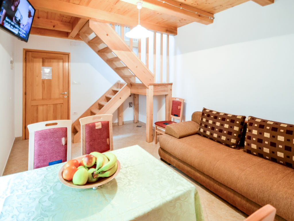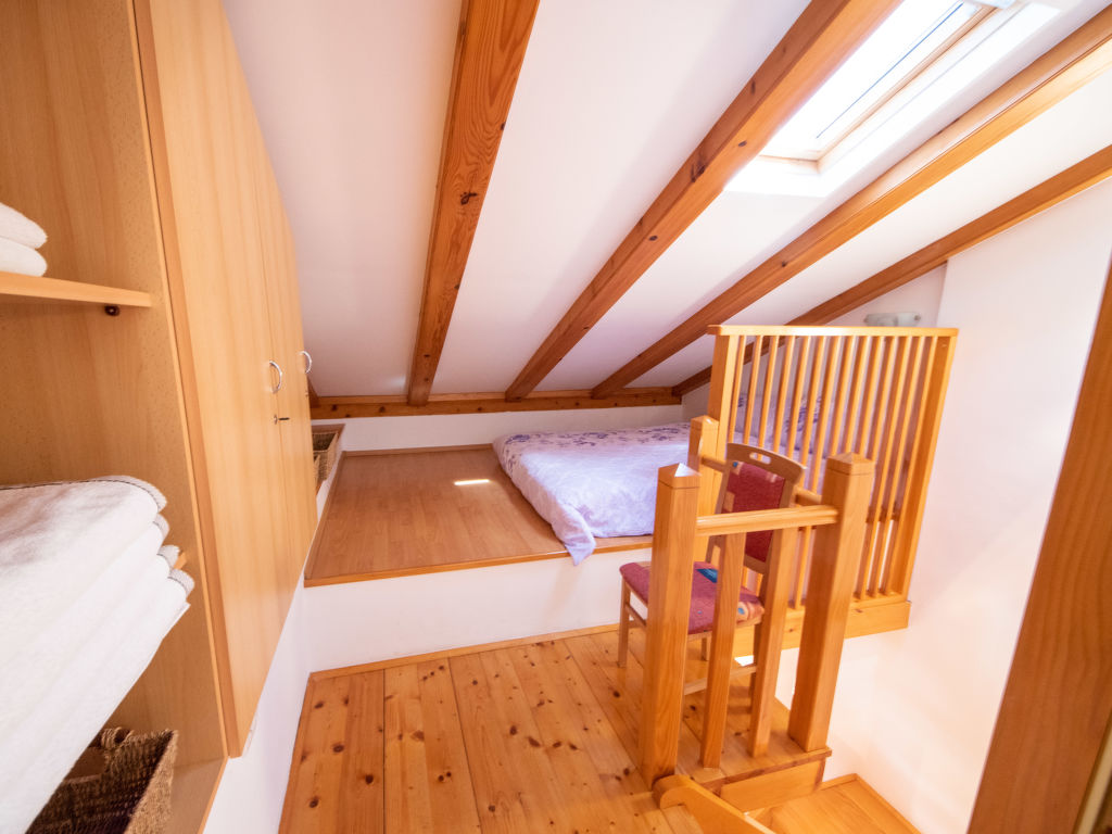 2-Zimmer-Wohnung 35 m2 auf 2 Stockwerken. Wohn-/Esszimmer mit 1 Doppeldiwanbett (160 cm, Länge 200 cm), Sat-TV (Flachbildschirm), Klimaanlage. Ausgang zur Terrasse. Offene Küche (2 Kochplatten, Mikrowelle). Dusche/WC. Obergeschoss: 1 abgeschrägtes Zimmer, Deckenhöhe 105 - 260 cm mit 1 franz. Bett (160 cm, Länge 200 cm). Zur Verfügung: Waschmaschine. Internet (Wireless LAN, gratis). Bitte beachten: eigener Eingang.