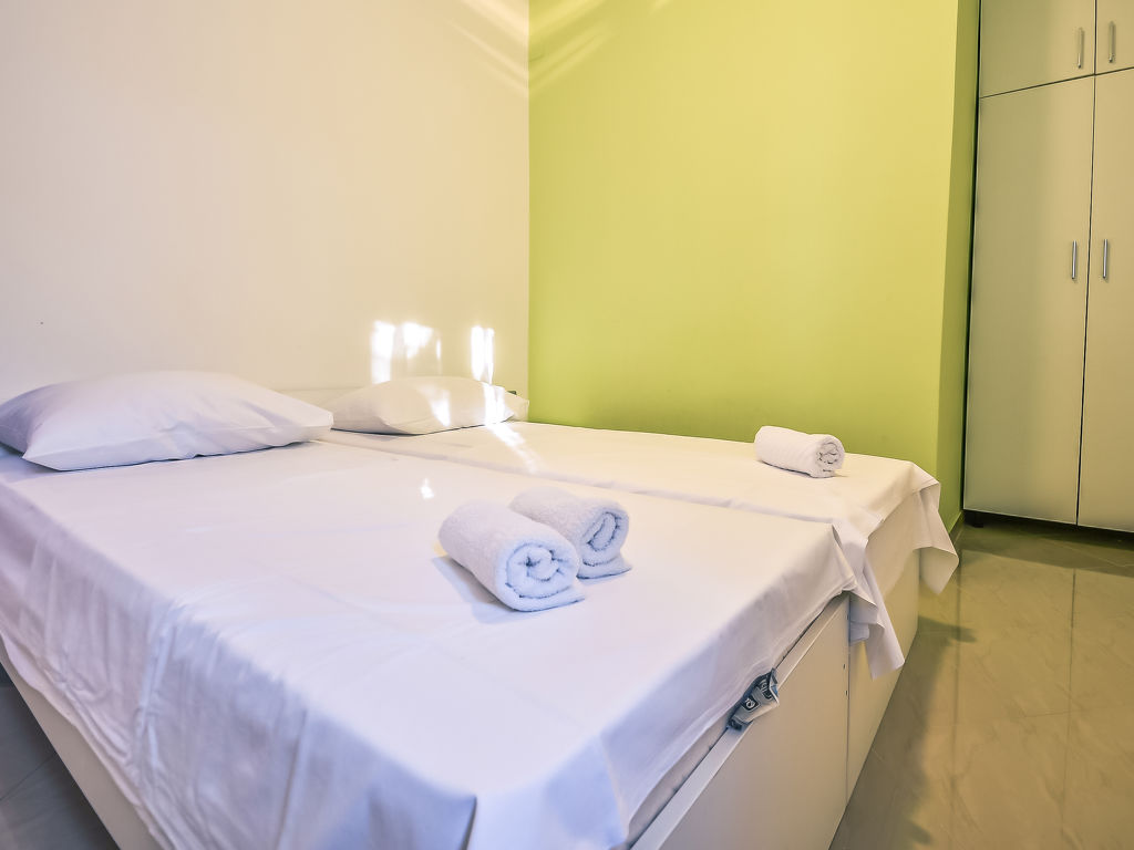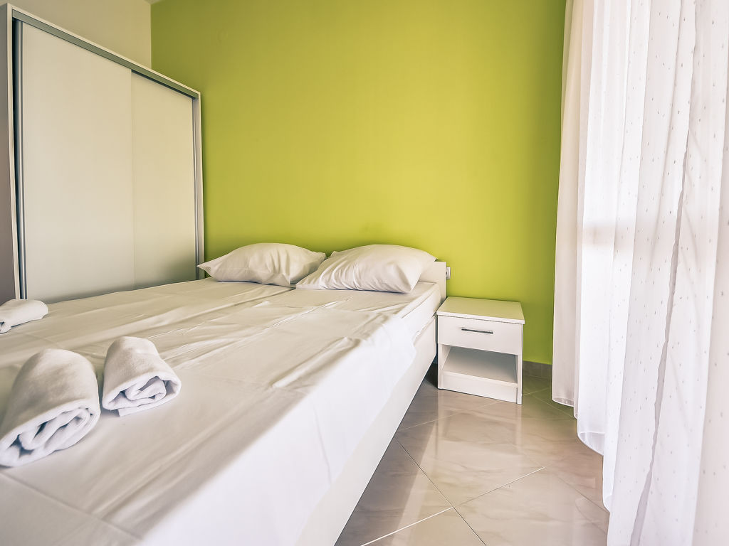 4-Zimmer-Wohnung 80 m2 im 1. Stock, Südwestlage. Wohn-/Esszimmer mit Sat-TV (Flachbildschirm), Klimaanlage. Ausgang zur Terrasse. 1 Zimmer mit 1 Doppelbett (2 x 80 cm, Länge 200 cm). Ausgang zur Terrasse. 2 Zimmer, jedes Zimmer mit 1 Doppelbett (2 x 80 cm, Länge 200 cm). Offene Küche (4 Kochplatten, Backofen, Geschirrspüler, Mikrowelle, Tiefkühler). Dusche/WC. Terrasse 25 m2, überdacht. Terrassenmöbel. Sicht auf das Meer. Zur Verfügung: Waschmaschine. Internet (Wireless LAN, gratis).