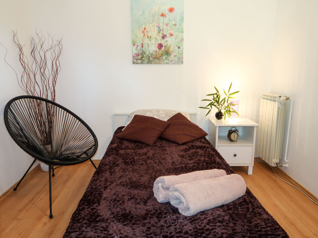 4-Zimmer-Doppelhaushälfte 90 m2 auf 2 Stockwerken. Wohn-/Esszimmer mit Sat-TV (Flachbildschirm). Ausgang zum Balkon. Eingang mit Klimaanlage. 1 Zimmer mit 1 franz. Bett. Ausgang zum Balkon. 1 Zimmer mit 1 Bett. Offene Küche (2 Kochplatten, Backofen, 2 Flammen, Toaster, Wasserkocher, Mikrowelle, Tiefkühler, elektrische Kaffeemaschine). Dusche/WC, sep. WC. Dachgeschoss: 1 abgeschrägtes, offenes Zimmer mit 1 Bett. Balkon, Terrasse überdacht. Terrassenmöbel, Gartengrill (mobil). Zur Verfügung: Internet (Wireless LAN, gratis). Bitte beachten: Nichtraucher-Haus.