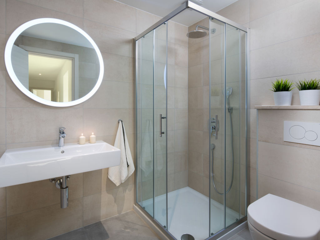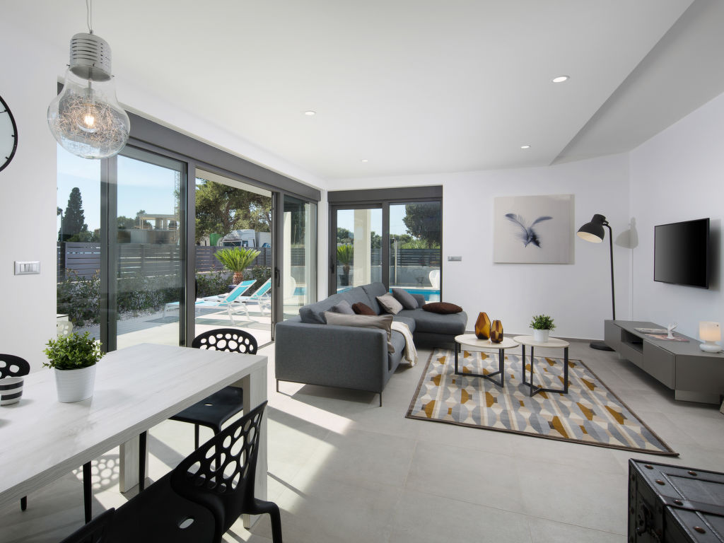 4-Zimmer-Wohnung 93 m2, im Erdgeschoss. Komfortabel und geschmackvoll eingerichtet: Wohn-/Esszimmer 30 m2 mit Sat-TV (Flachbildschirm), Klimaanlage. Ausgang zur Terrasse, zum Schwimmbad. 2 Zimmer, jedes Zimmer mit 1 franz. Bett (160 cm, Länge 200 cm), Klimaanlage. 1 Zimmer mit 2 Betten (90 cm, Länge 200 cm), Klimaanlage. Offene Küche (Backofen, Geschirrspüler, 4 Glaskeramikherd Platten, Mikrowelle, Tiefkühler, elektrische Kaffeemaschine). Dusche/WC, sep. WC. Heizung. Terrasse 30 m2, überdacht. Terrassenmöbel, Liegestühle. Sicht auf das Schwimmbad. Zur Verfügung: Waschmaschine, Safe, Babybett, Haartrockner. Internet (Wireless LAN, gratis). Bitte beachten: Nichtraucher-Unterkunft.