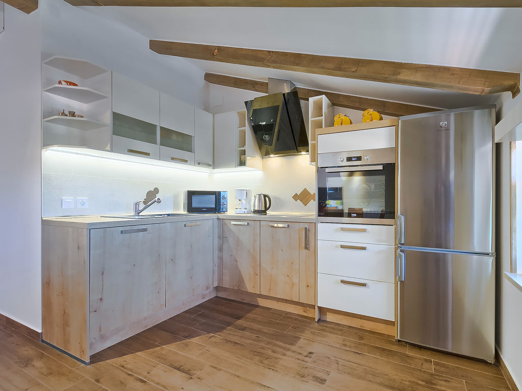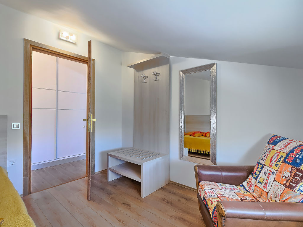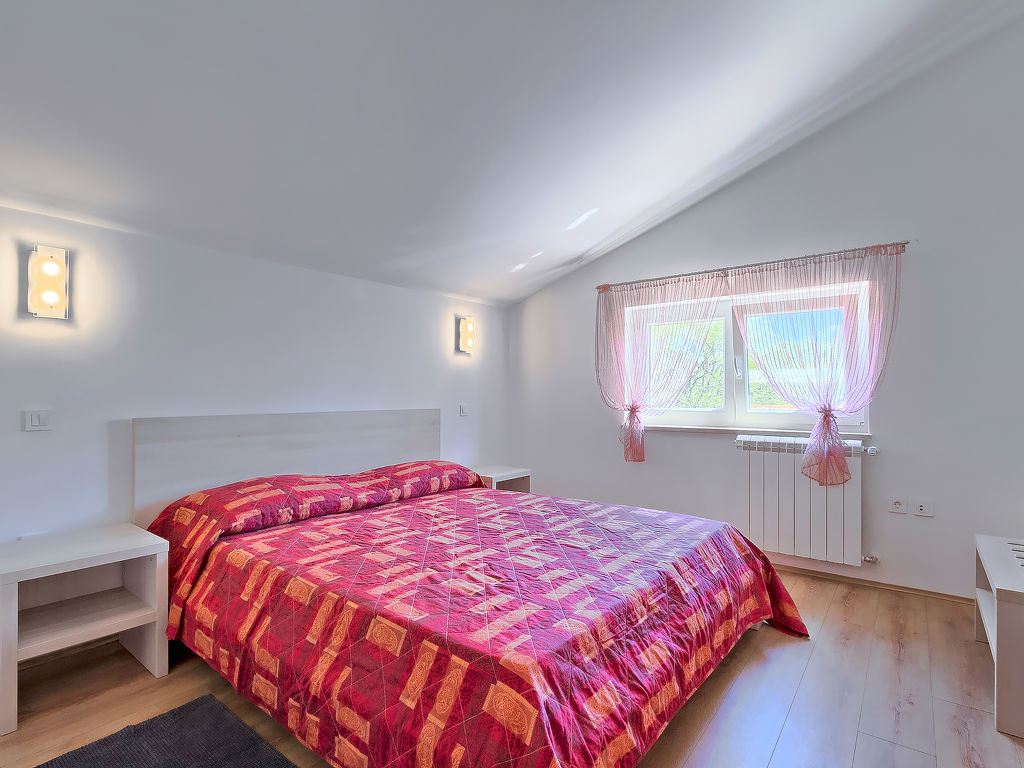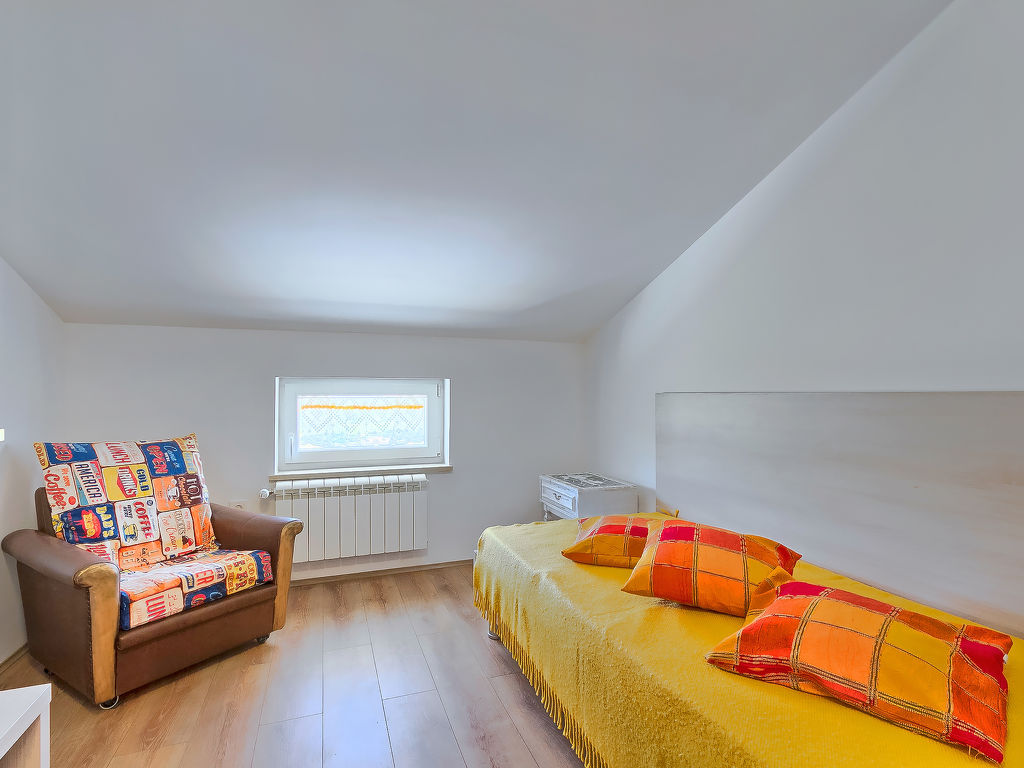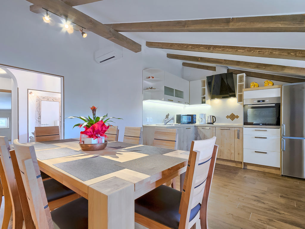 4-Zimmer-Wohnung 124 m2, im Dachgeschoss. Wohn-/Esszimmer abgeschrägtes, Deckenhöhe 150 - 300 cm mit 1 Diwanbett (160 cm, Länge 200 cm), Sat-TV (Flachbildschirm), Klimaanlage. Ausgang zur Terrasse. 2 abgeschrägte Zimmer, Deckenhöhe 150 - 300 cm, jedes Zimmer mit 1 franz. Bett (160 cm, Länge 200 cm). 1 abgeschrägtes Zimmer, Deckenhöhe 150 - 300 cm mit 1 Bett (90 cm, Länge 200 cm). Abgeschrägte, offene Küche (Backofen, Geschirrspüler, 4 Glaskeramikherd Platten, Mikrowelle, Tiefkühler, elektrische Kaffeemaschine), Deckenhöhe 150 - 300 cm. Dusche/WC, Dusche/Bidet/WC. Heizung (extra). Terrasse 20 m2. Terrassenmöbel, Liegestühle. Sicht auf das Schwimmbad. Zur Verfügung: Waschmaschine. Internet (Wireless LAN, gratis). Bitte beachten: eigener Eingang.