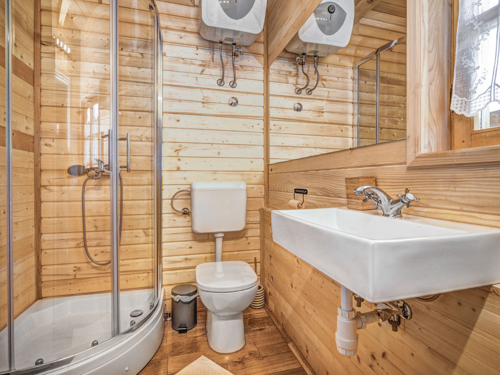 2-Zimmer-Chalet 40 m2 auf 2 Stockwerken, Nordlage. Wohn-/Esszimmer 20 m2 mit 1 Doppeldiwanbett (140 cm, Länge 200 cm), TV (Flachbildschirm), Holzofen und Klimaanlage. Offene Küche (Backofen, 2 Glaskeramikherd Platten). Dusche/WC. Holzheizung. Dachgeschoss: (steile Treppe) 1 abgeschrägtes, offenes Zimmer, Deckenhöhe 30 - 250 cm mit 1 franz. Bett (180 cm, Länge 200 cm). Zur Verfügung: Holz (gratis). Internet (Wireless LAN, gratis).