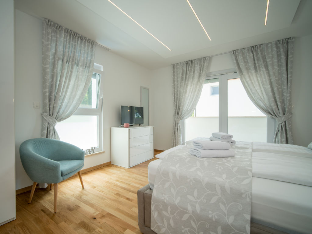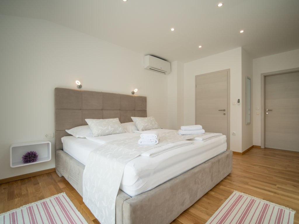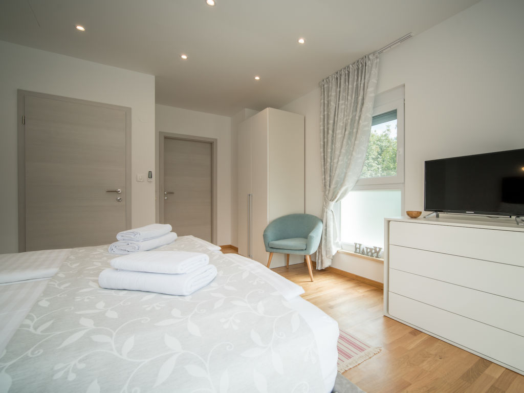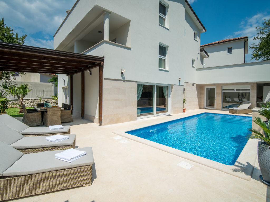 Gornja Hlapa 2 km von Dobrinj: Einfamilienhaus "Anđela", auf 3 Stockwerken, Baujahr 2018. 3 km vom Zentrum von Solin, 4 km vom Zentrum von Klimno, 12.5 km vom Zentrum von Malinska, ruhige, sonnige Lage, 2.5 km vom Meer, 2.5 km vom Strand, in einer Sackgasse. Zur Alleinbenutzung: Grundstück 570 m2 (eingezäunt) mit Rasen 22 m2, Pflanzen, Schwimmbad eckig (9 x 4 m, 140 cm tief, 01.05.-15.10.) mit Innentreppe. Aussendusche, Sprudelbad, Grill. Im Hause: Internetzugang, Sauna, Fitnessraum, Alarmanlage, Waschmaschine. Parkplatz (für 3 Autos) beim Haus auf dem Grundstück. Einkaufsgeschäft 950 m, Supermarkt 11 km, Restaurant 950 m, Kieselstrand 2.5 km, betonierter Strand 2.5 km. Jugendgruppen nur auf Anfrage. Videoüberwachung der Immobilie. Von Gruppen junger Leute wird ein doppeltes Pfand verlangt bei der Ankunft.
