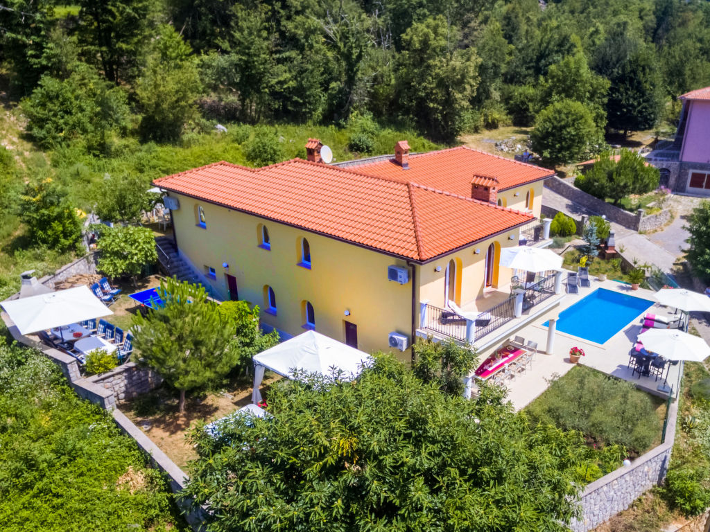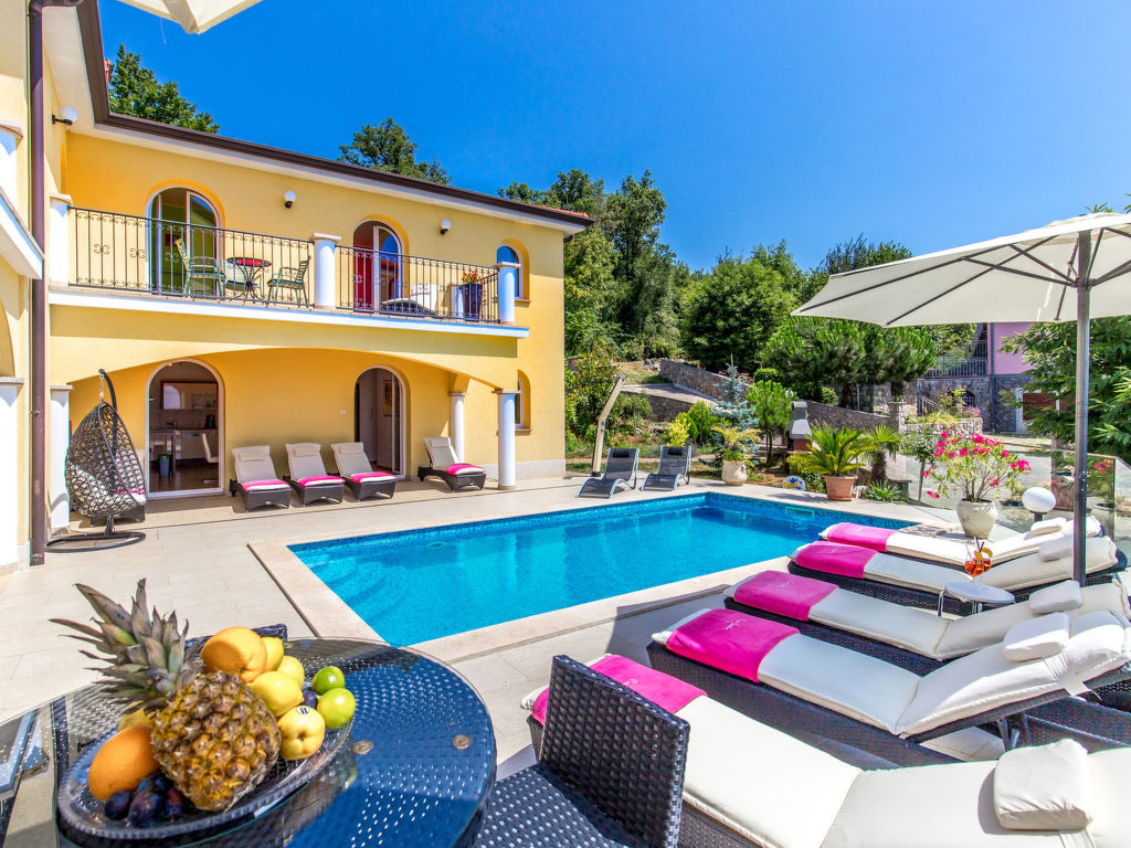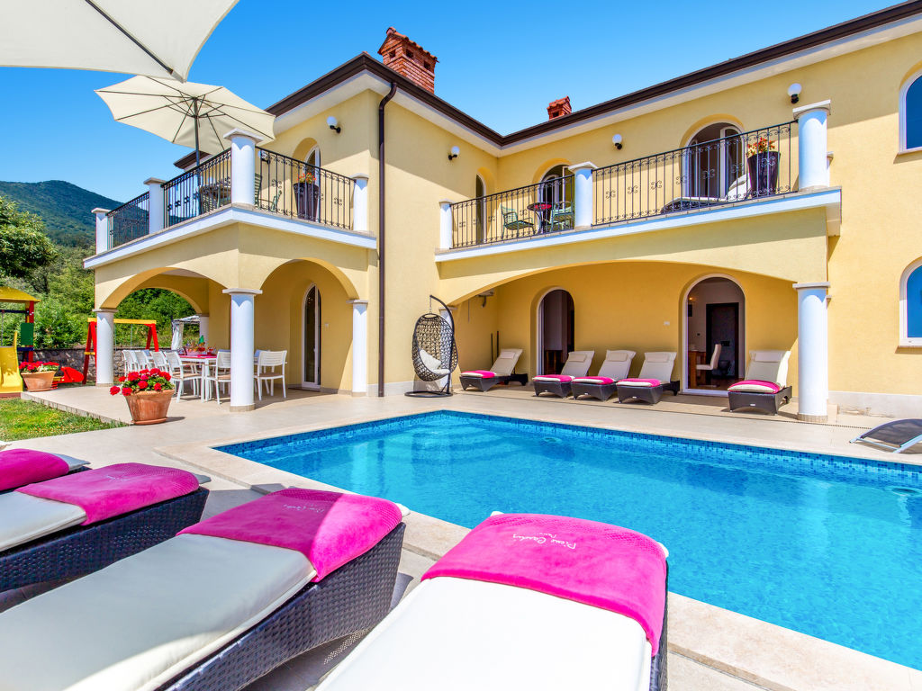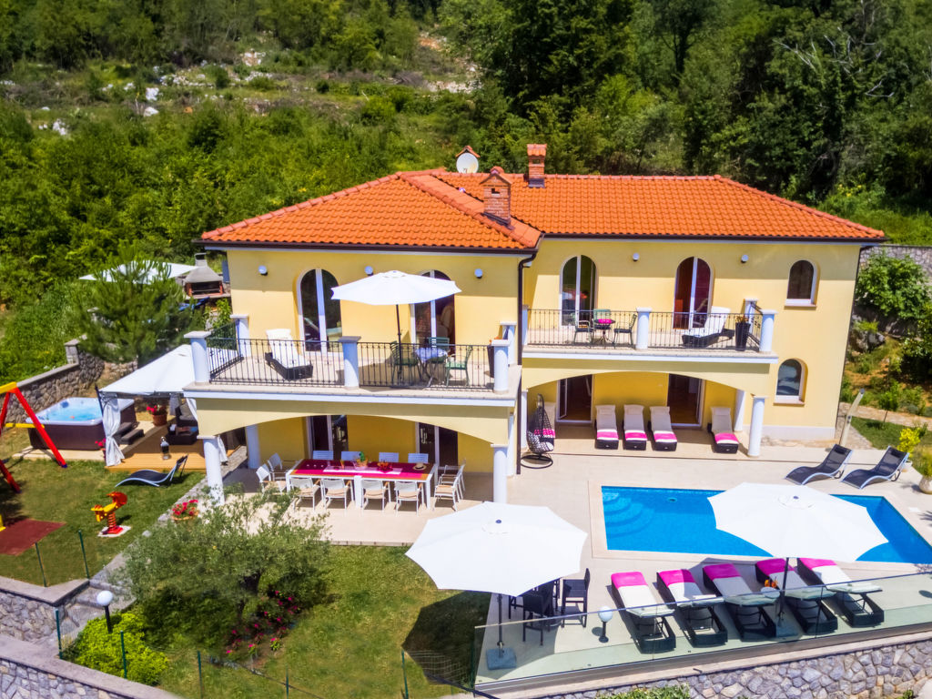 Poljane (Ičići) 8 km von Opatija: Kinderfreundliches, schönes Doppelhaus "Villa Orhidea", auf 2 Stockwerken. 5.5 km vom Zentrum von Ičići, sonnige, erhöhte Lage, 5.5 km vom Meer, im Grünen. Zur Alleinbenutzung: Rasen 110 m2, Schwimmbad eckig (7 x 3 m, 24 m2, 140 cm tief, 20.04.-12.10.) mit Innentreppe. Aussendusche, Sprudelbad, Tischtennis, Gartenmöbel, Grill, Kinderspielplatz (Rutschbahn, Schaukel). Im Hause: Internetzugang, Billard, Waschmaschine, Wäschetrockner. Parkplatz (für 6 Autos) beim Haus auf dem Grundstück. Einkaufsgeschäft 600 m, Restaurant 1.4 km, Bushaltestelle 100 m, Steinstrand 5.5 km, Strandbad 5.5 km, betonierter Strand 5.5 km. Tennis 4 km. Nahe gelegene Sehenswürdigkeiten: Nature park Učka 8 km. Jugendgruppen nur auf Anfrage. Sprudelbad im Freien, mit Wassertemperatur bis 40 °C.
