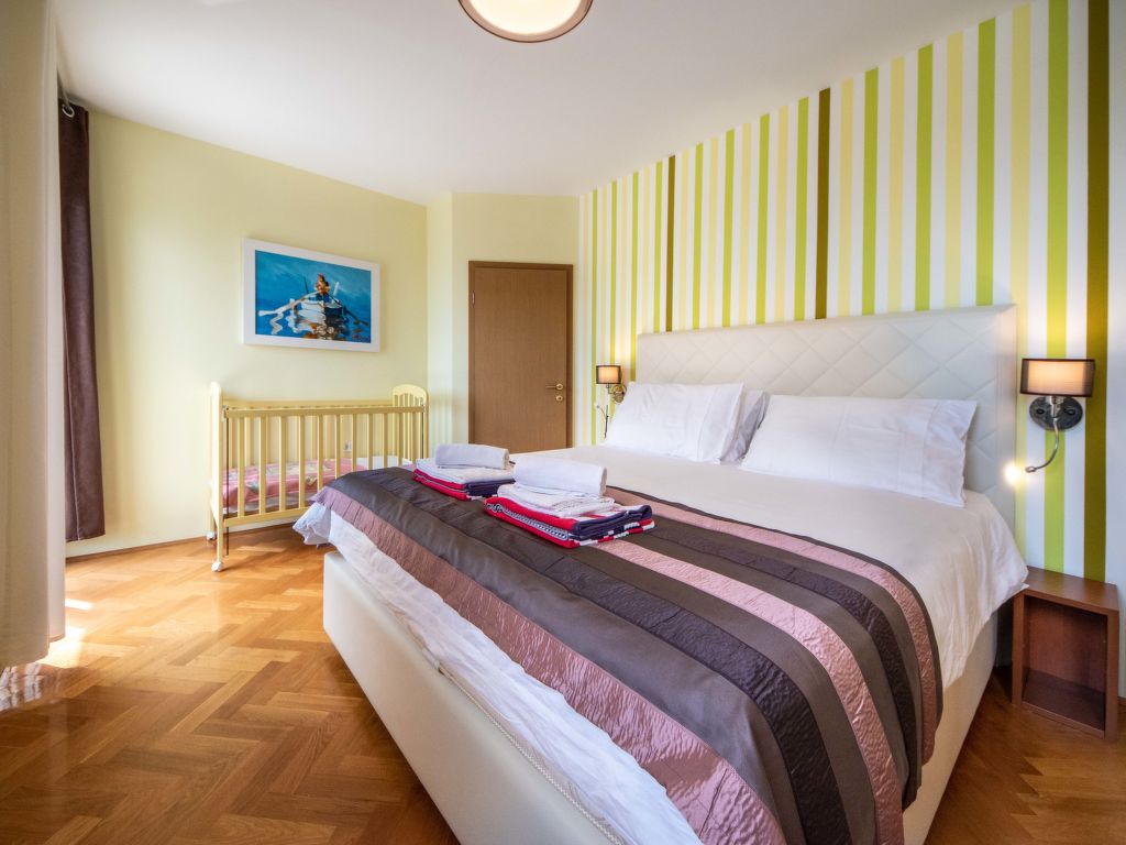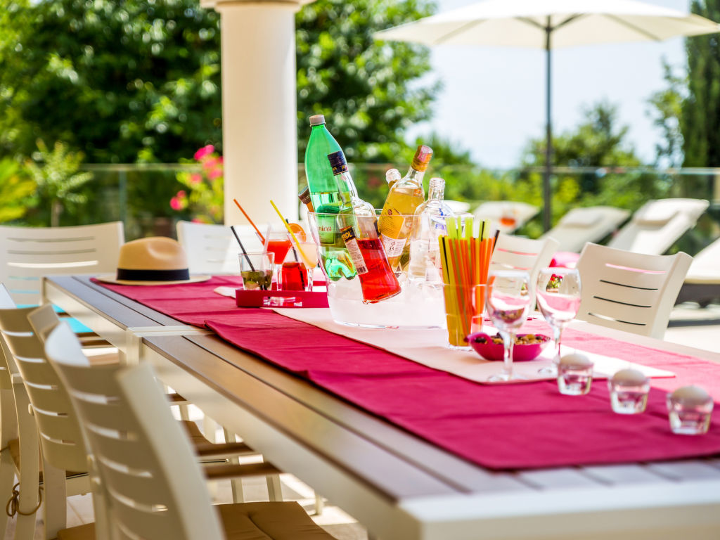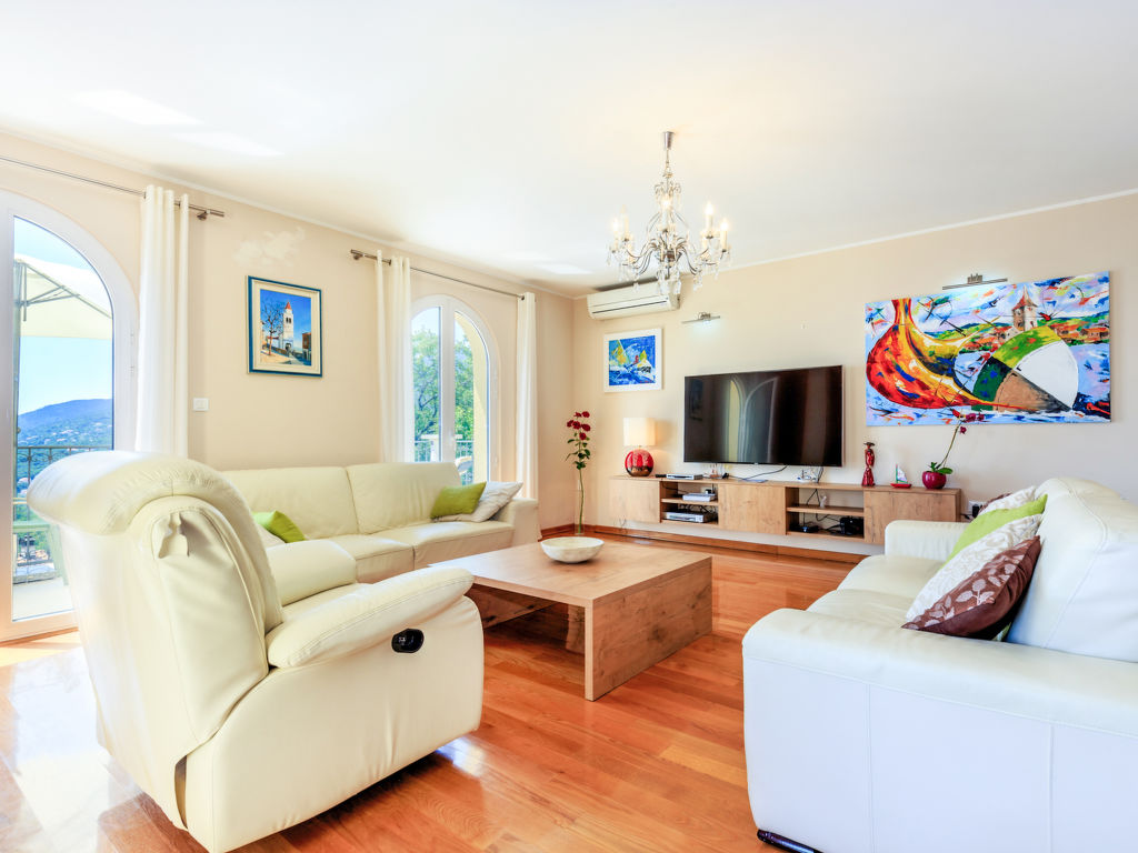 9-Zimmer-Doppelhaushälfte 245 m2 auf 2 Stockwerken, Südlage. Geschmackvoll eingerichtet: Wohnzimmer 30 m2 mit Sat-TV (Flachbildschirm), DVD und Klimaanlage. Ausgang zur Terrasse. 2 Zimmer, jedes Zimmer mit 1 Doppelbett (2 x 80 cm, Länge 200 cm), TV (Flachbildschirm). 1 Zimmer 16 m2 mit 1 Doppelbett (2 x 90 cm, Länge 200 cm), TV (Flachbildschirm). 1 Zimmer mit 1 Bett (90 cm, Länge 200 cm). Esszimmer 31 m2 mit Klimaanlage. Ausgang zur Terrasse. Offene Küche (4 Kochplatten, Backofen, Geschirrspüler, Mikrowelle, Tiefkühler). 2 Duschen/Bidet/WC. Obergeschoss: (Aussentreppe) Wohn-/Esszimmer 60 m2 mit Sat-TV (Flachbildschirm), DVD und Klimaanlage. Ausgang zum Balkon. 1 Zimmer mit 1 franz. Bett (180 cm, Länge 210 cm), TV (Flachbildschirm). Ausgang zum Balkon. 1 Zimmer mit 1 Doppelbett (2 x 80 cm, Länge 200 cm), TV (Flachbildschirm). 1 Zimmer mit 1 Bett (90 cm, Länge 200 cm). Ausgang zum Balkon. Offene Küche (4 Kochplatten, Backofen, Geschirrspüler, Tiefkühler, elektrische Kaffeemaschine). Bad/Bidet/WC, sep. WC. 2 Balkone 18 m2, Terrasse 20 m2, überdacht, Terrasse 19 m2, überdacht. Terrassenmöbel, Gartengrill, Liegestühle (12), Abstellkammer. Panoramasicht auf das Meer und die Landschaft. Zur Verfügung: Kinderhochstuhl, Babybett. Internet (Wireless LAN, gratis). 1 kleines Haustier/Hund erlaubt.