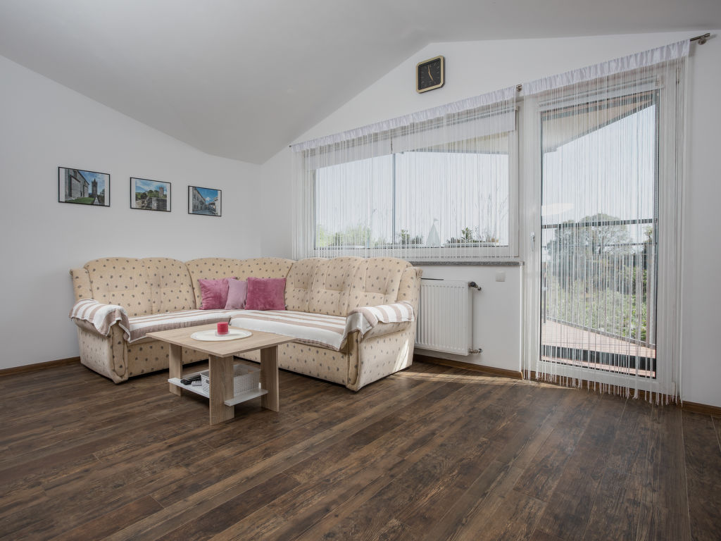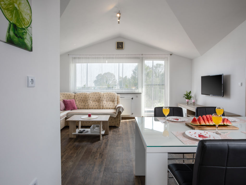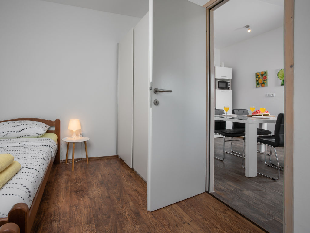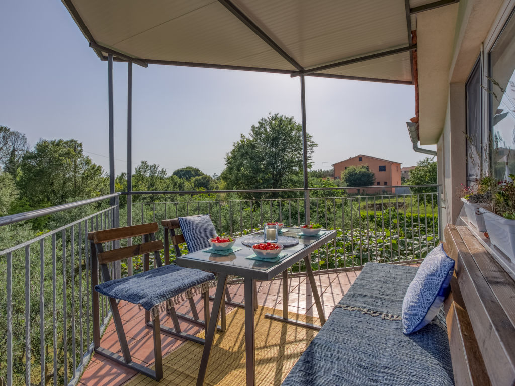 3-Zimmer-Wohnung 60 m2 im 1. Stock. Schön eingerichtet: Wohn-/Esszimmer mit 1 Diwanbett (160 cm, Länge 200 cm), Sat-TV (Flachbildschirm), Klimaanlage. Ausgang zur Terrasse. 1 Zimmer mit 1 franz. Bett (160 cm, Länge 200 cm). 1 Zimmer mit 2 Betten (90 cm, Länge 200 cm). Offene Küche (2 Kochplatten, Backofen, Mikrowelle, Tiefkühler, elektrische Kaffeemaschine). Dusche/WC. Terrasse 8 m2. Terrassenmöbel. Sicht auf den Garten und die Landschaft. Zur Verfügung: Haartrockner. Internet (Wireless LAN, gratis). 1 Haustier/Hund erlaubt.
