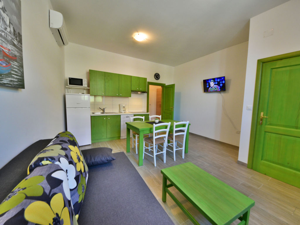 2-Zimmer-Wohnung 42 m2, im Erdgeschoss, Südlage. Vollständig renoviert im Jahre 2017: Wohn-/Esszimmer 20 m2 mit 1 Doppeldiwanbett (160 cm, Länge 200 cm), Sat-TV (Flachbildschirm), Klimaanlage. 1 Zimmer mit 1 Doppelbett (2 x 80 cm, Länge 200 cm). Offene Küche (Geschirrspüler, 3 Glaskeramikherd Platten, Mikrowelle, Tiefkühler, elektrische Kaffeemaschine). Dusche/WC. Terrasse 25 m2. Terrassenmöbel. Eingeschränkte Sicht auf das Meer. Zur Verfügung: Waschmaschine, Safe, Bügeleisen. Internet (Wireless LAN, gratis).