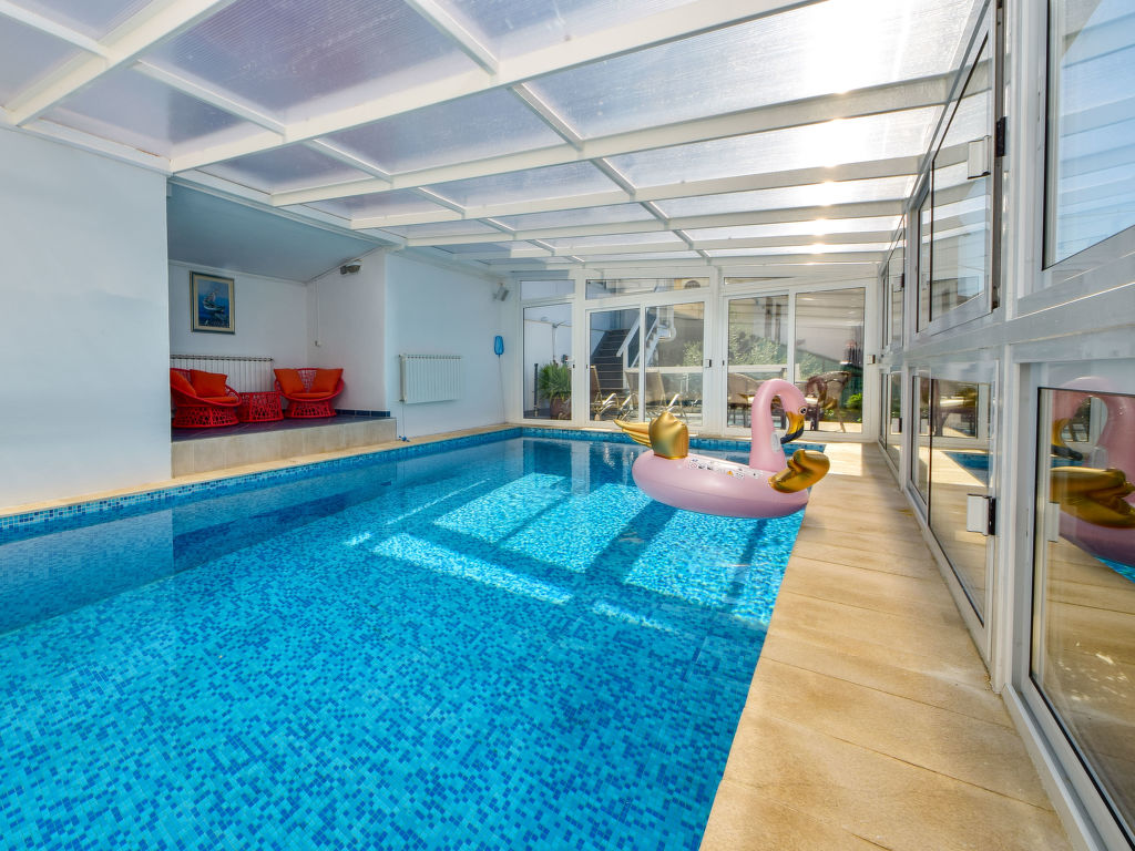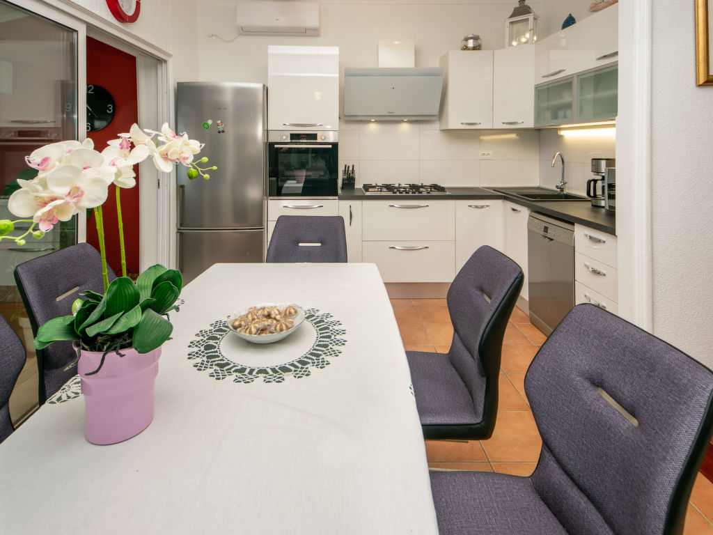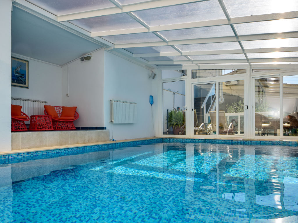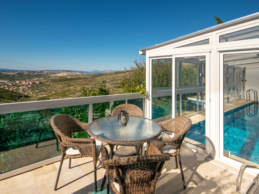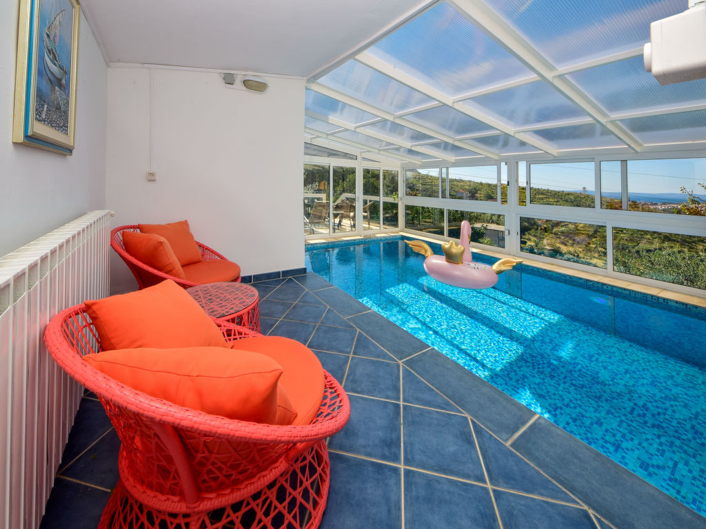 Einfamilienhaus "Ksenija", auf 2 Stockwerken. 2 km vom Zentrum von Žrnovnica, 10 km vom Zentrum von Split, ruhige, sonnige, erhöhte Lage, 4.5 km vom Meer, 4.5 km vom Strand. Zur Alleinbenutzung: Grundstück 650 m2 (eingezäunt), Garten mit Pflanzen, Hallenbad eckig, beheizt (9 x 4 m, 40 m2, 175 cm tief, 15.04.-15.10.). Aussendusche, Terrasse (12 m2), Gartenmöbel, Grill, Kinderspielplatz (Rutschbahn, Schaukel). Im Hause: Internetzugang, Trampolin, Waschmaschine. Parkplatz beim Haus auf dem Grundstück, Einzelgarage. Einkaufsgeschäft 2 km, Restaurant 2 km, Kieselstrand 4.5 km. Jacht-Hafen 5 km, Golfplatz 5 km, Tennis 7 km, Wanderwege ab Haus 100 m. Schwimmbad beheizt (extra).
