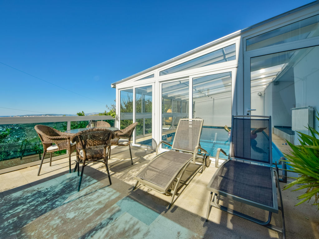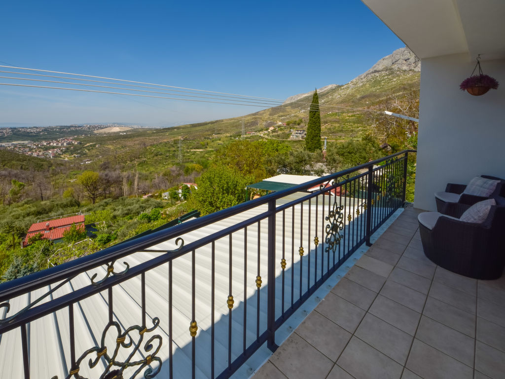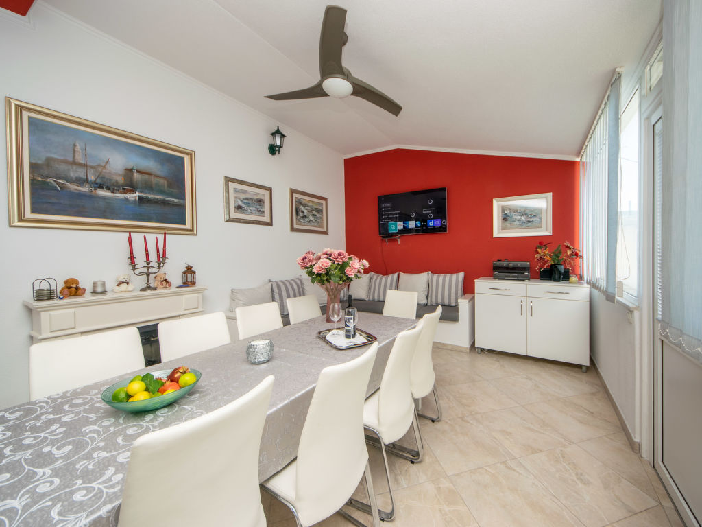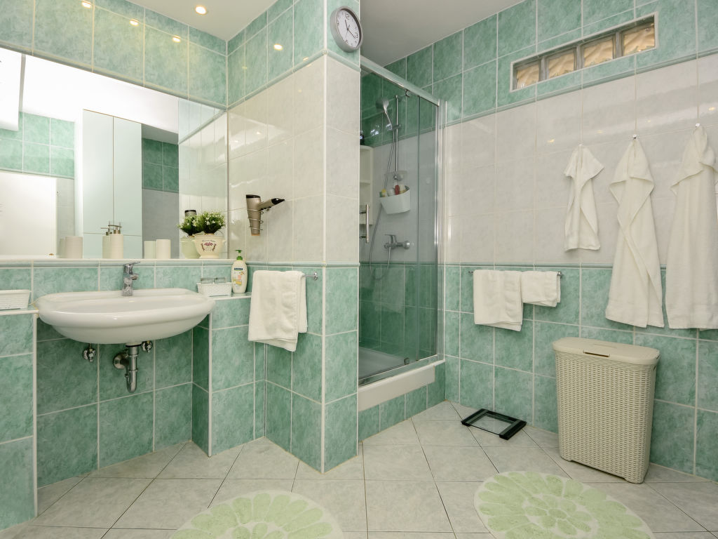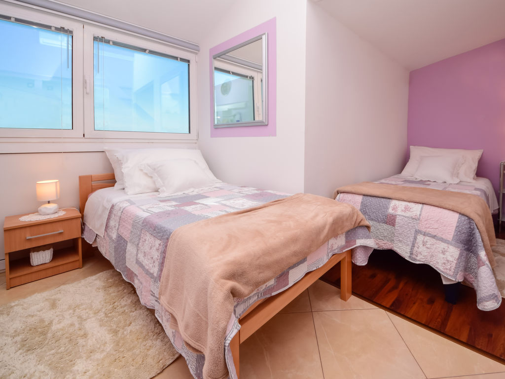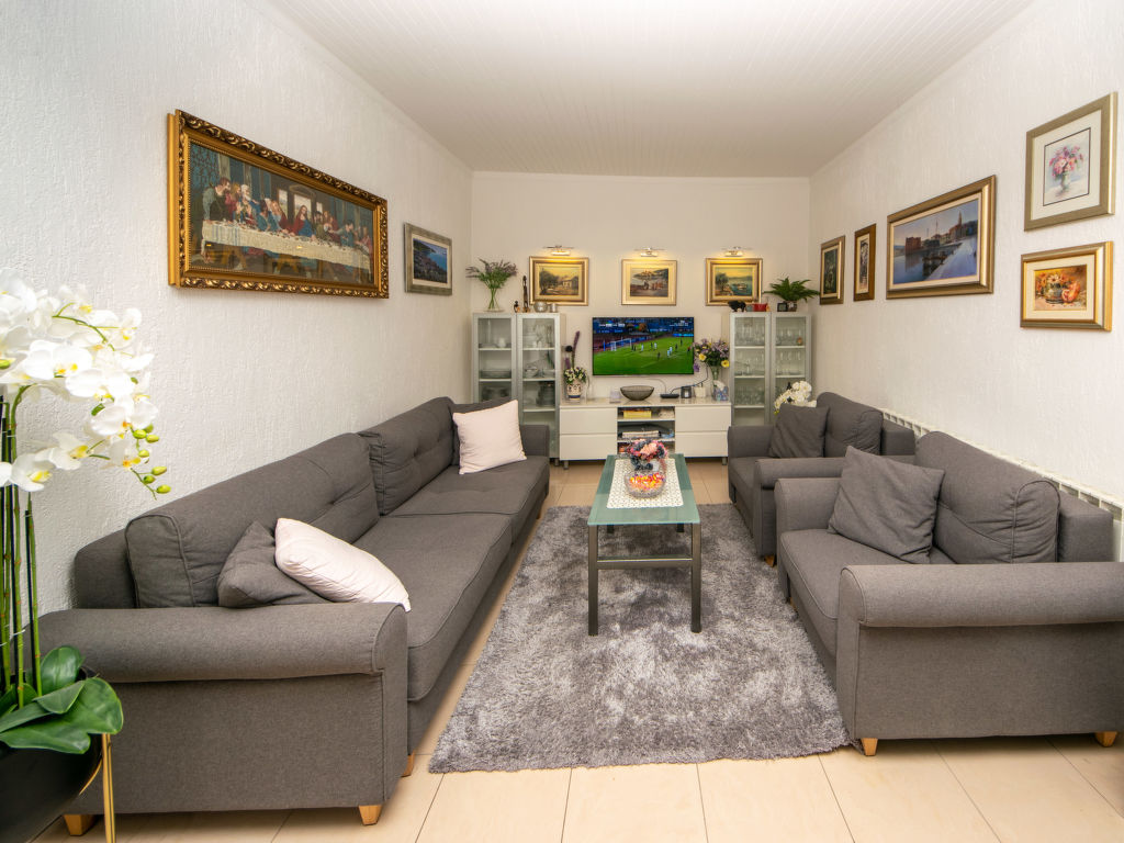 Einfamilienhaus "Ksenija", auf 2 Stockwerken. 2 km vom Zentrum von Žrnovnica, 10 km vom Zentrum von Split, ruhige, sonnige, erhöhte Lage, 4.5 km vom Meer, 4.5 km vom Strand. Zur Alleinbenutzung: Grundstück 650 m2 (eingezäunt), Garten mit Pflanzen, Hallenbad eckig, beheizt (9 x 4 m, 40 m2, 175 cm tief, 15.04.-15.10.). Aussendusche, Terrasse (12 m2), Gartenmöbel, Grill, Kinderspielplatz (Rutschbahn, Schaukel). Im Hause: Internetzugang, Trampolin, Waschmaschine. Parkplatz beim Haus auf dem Grundstück, Einzelgarage. Einkaufsgeschäft 2 km, Restaurant 2 km, Kieselstrand 4.5 km. Jacht-Hafen 5 km, Golfplatz 5 km, Tennis 7 km, Wanderwege ab Haus 100 m. Schwimmbad beheizt (extra).