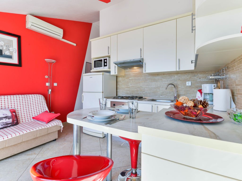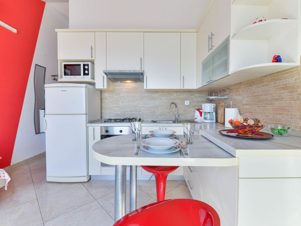2-Zimmer-Wohnung 27 m2 im 2. Stock. Wohn-/Esszimmer mit 1 Diwanbett, Sat-TV und Klimaanlage. Ausgang zum Balkon. 1 Zimmer mit 1 Doppelbett. Offene Küche (4 Kochplatten, Backofen, Mikrowelle). Dusche/WC. Balkon 10 m2. Balkonmöbel. Sicht auf das Meer und das Schwimmbad. Zur Verfügung: Internet (Wireless LAN, gratis).