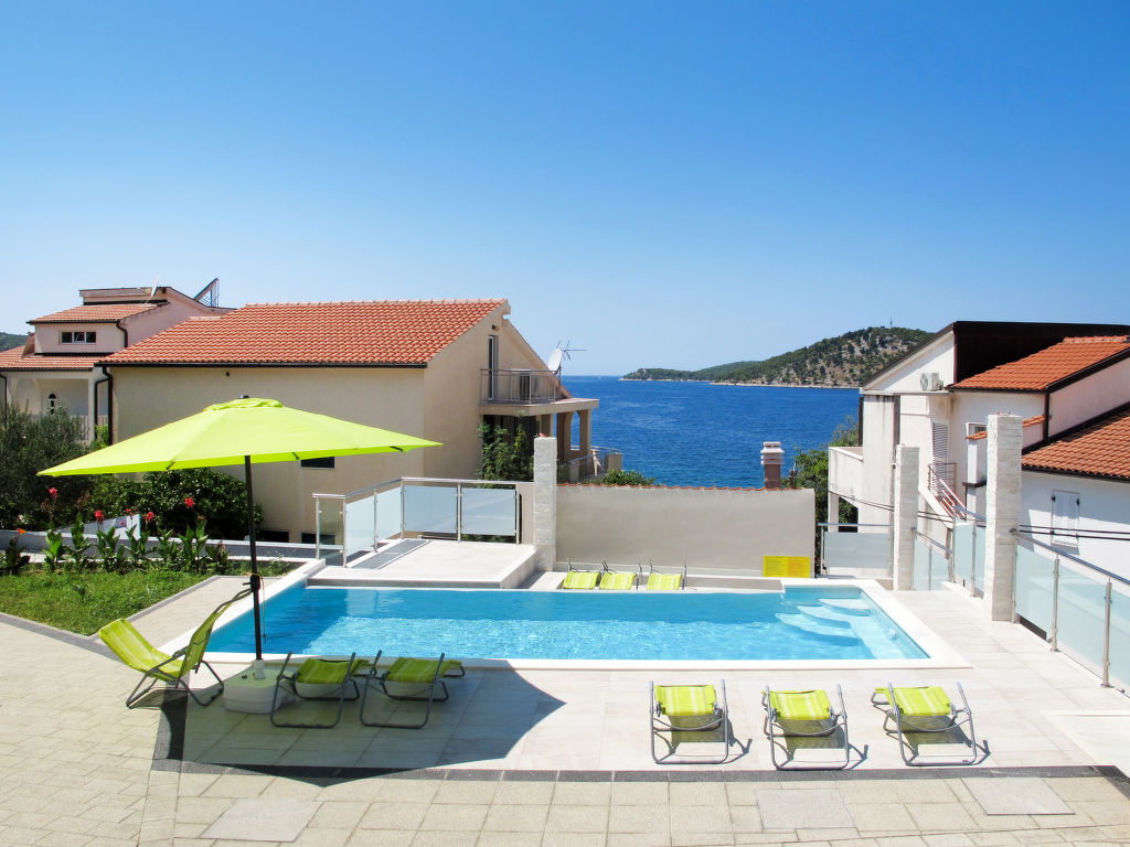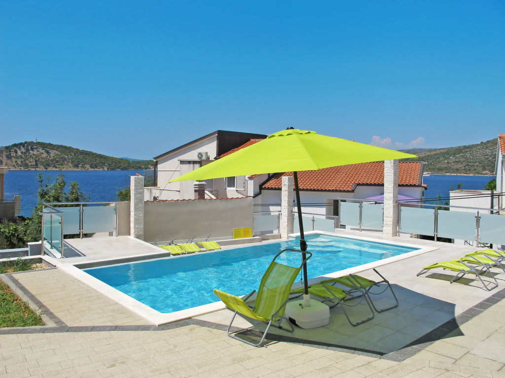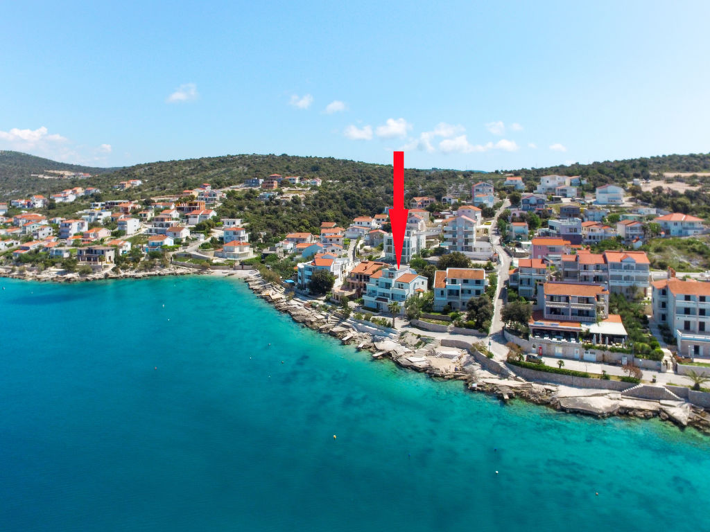 Appartementhaus "Galeb". 10 km vom Zentrum von Rogoznica, 700 m vom Zentrum von Ražanj, 10 m vom Meer, 10 m vom Strand. Zur Mitbenutzung: Grundstück 800 m2 mit Pflanzen und Bäumen, Schwimmbad beheizt (8 x 4 m, 150 cm tief, saisonale Verfügbarkeit: 01.Mai.-01.Okt.) mit Innentreppe. Aussendusche, Sitzplatz, Grill. Im Hause: Internetzugang, Waschmaschine, Wäschetrockner (zur Mitbenutzung, extra). Parkplatz beim Haus. Einkaufsgeschäft 30 m, Supermarkt 700 m, Felsstrand 10 m. Bitte beachten: private Bootsanlegestelle, auf Anfrage. Der Besitzer wohnt im selben Haus. Das Schwimmbad zur Mitbenutzung befindet sich auf dem Nachbargrundstück.