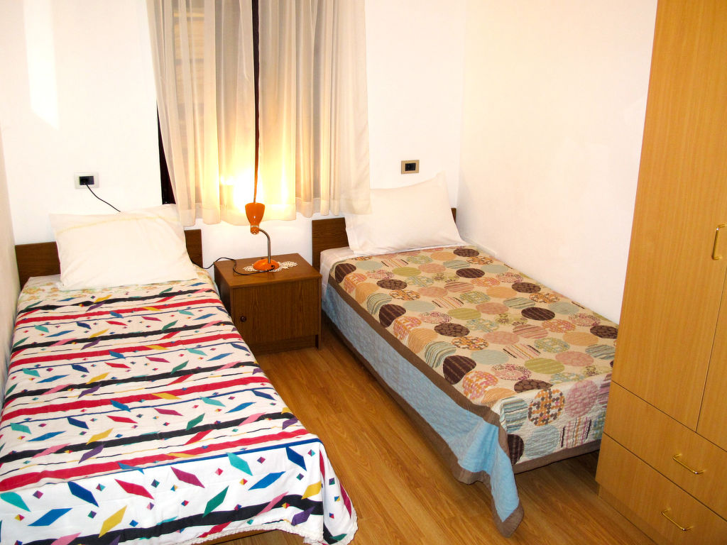 3-Zimmer-Wohnung, 2. Etage, ca. 55 m². Zugang über Außentreppe. Wohn-/Schlafraum mit Doppelbettcouch, Essplatz, Küchenzeile (3 Flammen, 1 Platte, Backofen, Mikrowelle, Geschirrspüler, Kühlschrank, Kaffeemaschine, Wasserkocher, Toaster), Balkonausgang. Schlafzimmer mit franz. Bett (1,50 m breit). Zweibettzimmer. Dusche/WC.