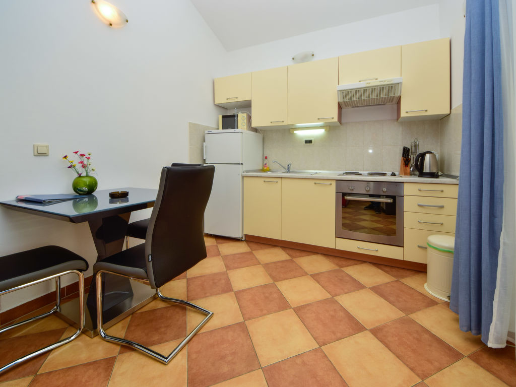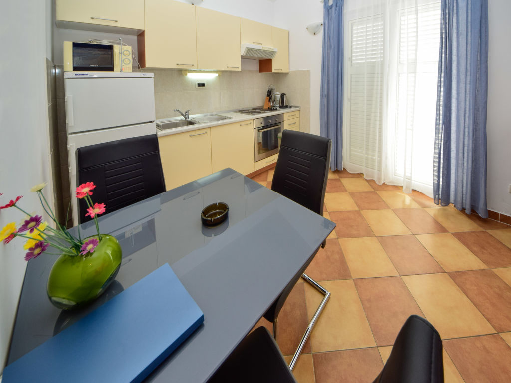2-Zimmer-Wohnung 32 m2 im 3. Stock, Westlage. Wohn-/Esszimmer mit 1 Diwanbett, Sat-TV, DVD und Klimaanlage. Ausgang zur Terrasse. Abgeschrägt 1 Zimmer mit 1 franz. Bett (160 cm, Länge 200 cm). Offene Küche (4 Kochplatten, Backofen, Mikrowelle, Tiefkühler). Dusche/WC. Terrasse 9 m2. Terrassenmöbel. Sicht auf das Meer und die Ortschaft. Zur Verfügung: Waschmaschine. Internet (Wireless LAN, gratis).
