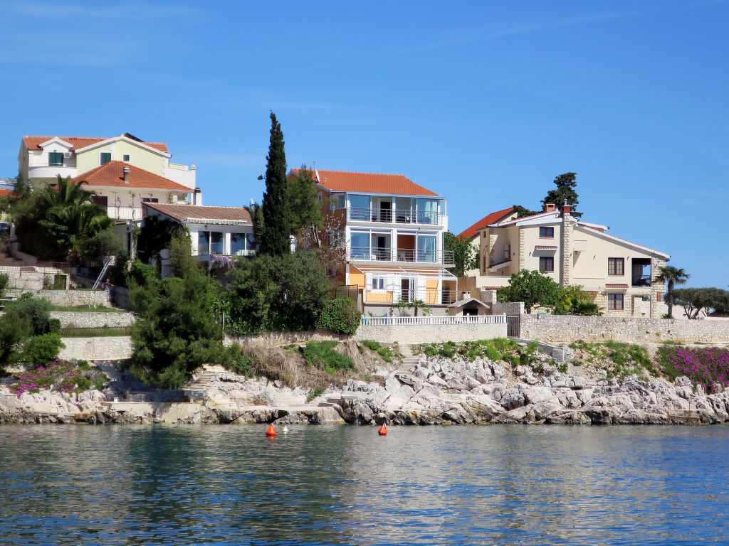 Okrug Gornji (Čiovo): Dreifamilienhaus "Giljo". 1.5 km vom Zentrum von Okrug Gornji, 5 km vom Zentrum von Trogir, am Hang, 10 m vom Meer, 10 m vom Strand, in einer Sackgasse. Zur Mitbenutzung: Grundstück 400 m2. Im Hause: Internetzugang. 70 m lange holprige Zufahrt. Einkaufsgeschäft 300 m, Supermarkt 2 km, Felsstrand 10 m.