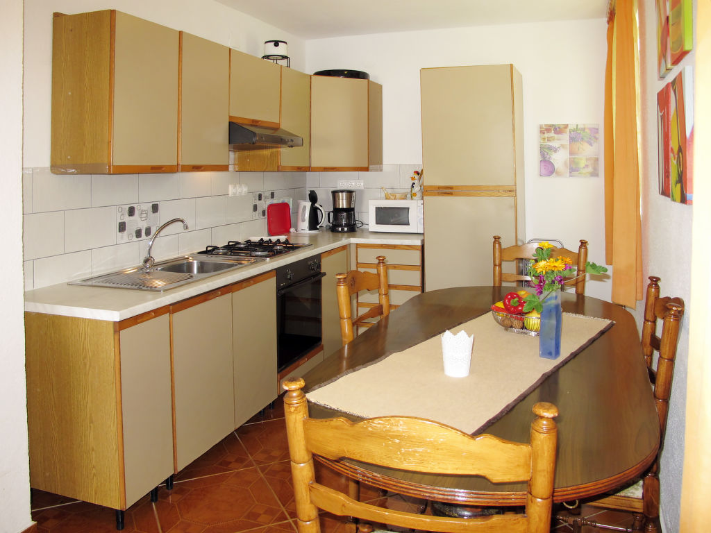 4-Zimmer-Haus, 2 Ebenen, ca. 90 m². Erdgeschoss: Wohnraum mit Sitzcouch, Essplatz, Küchenzeile (4 Flammen, Backofen, Kühl-/Gefrierkombination, Kaffeemaschine, Wasserkocher, Toaster), Holzofen, Terrassenausgang. Schlafzimmer mit franz. Bett. Dusche. Sep.WC. Vom Wohnraum Treppe ins Obergeschoss (Dachschräge, teilweise eingeschränkte Stehhöhe): Schlafzimmer mit franz. Bett. Schlafzimmer mit Doppelausziehbett (unterschiedliche Liegehöhe). Bad/WC.