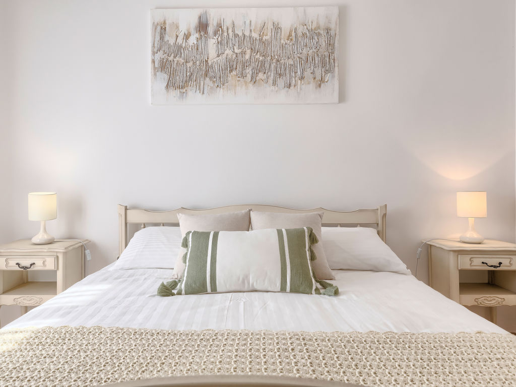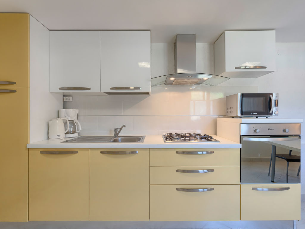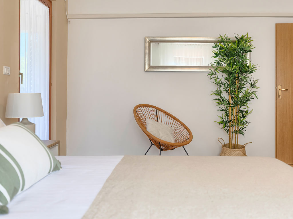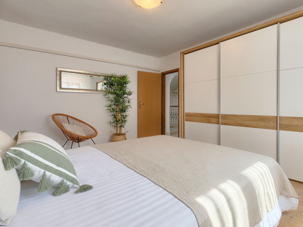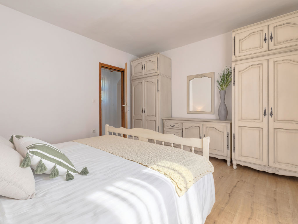4-Zimmer-Doppelhaushälfte 120 m2 auf 2 Stockwerken. Küche (4 Kochplatten, Backofen, Geschirrspüler, Toaster, Wasserkocher, Mikrowelle, Tiefkühler, elektrische Kaffeemaschine) mit Esstisch. Dusche/WC. Obergeschoss: 1 Zimmer mit 1 franz. Bett und Klimaanlage. Ausgang zur Terrasse. 2 Zimmer, jedes Zimmer mit 1 franz. Bett. 1 abgeschrägtes Zimmer mit 1 Bett. Bad/WC. Terrasse 20 m2 teilweise überdacht Terrasse überdacht. Terrassenmöbel, Liegestühle, Abstellkammer. Zur Verfügung: Bügeleisen, Babybett. Internet (Wireless LAN, gratis). Maximal 2 kleine Haustiere/Hunde erlaubt. Abstellraum nur von aussen zugänglich.