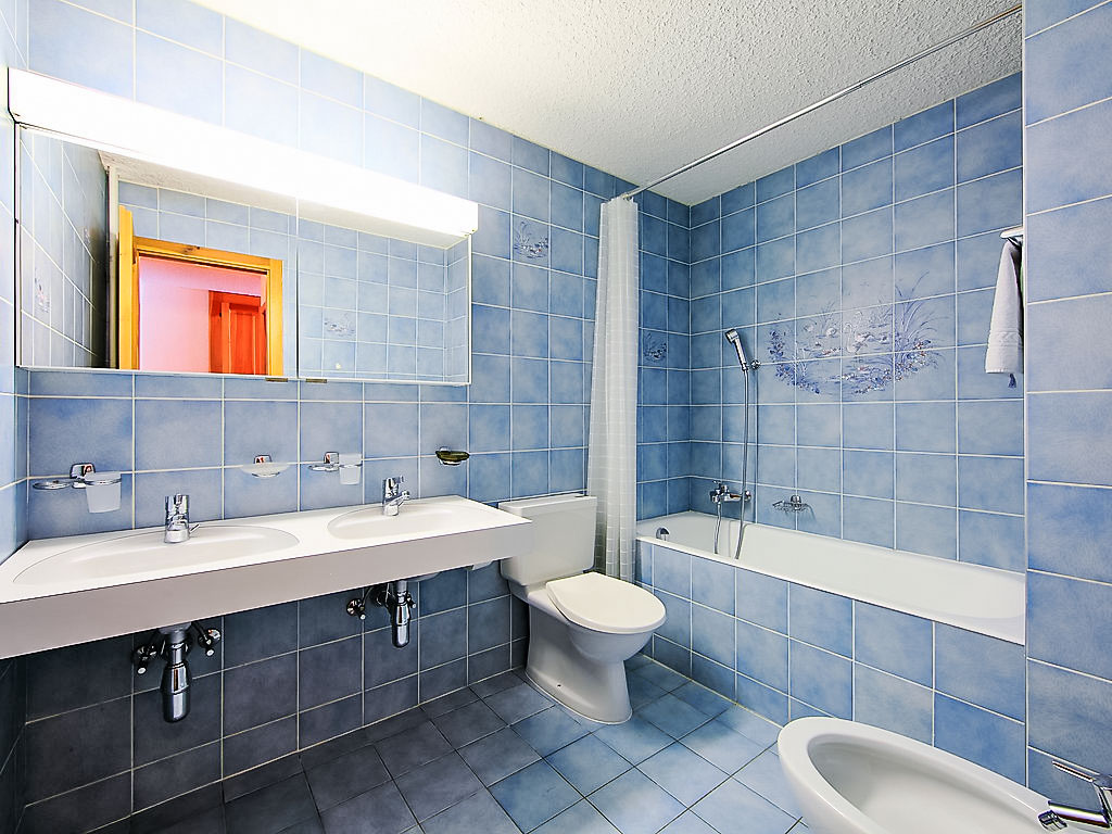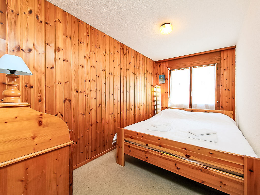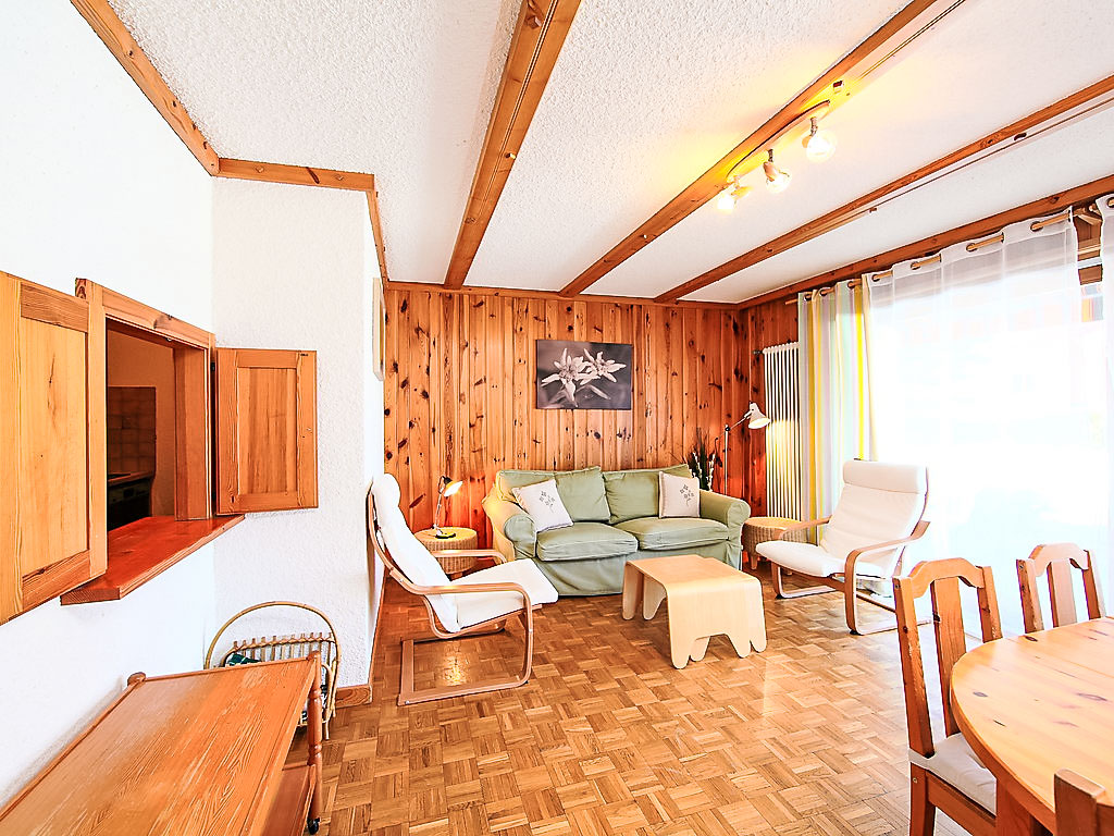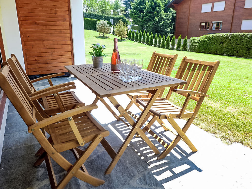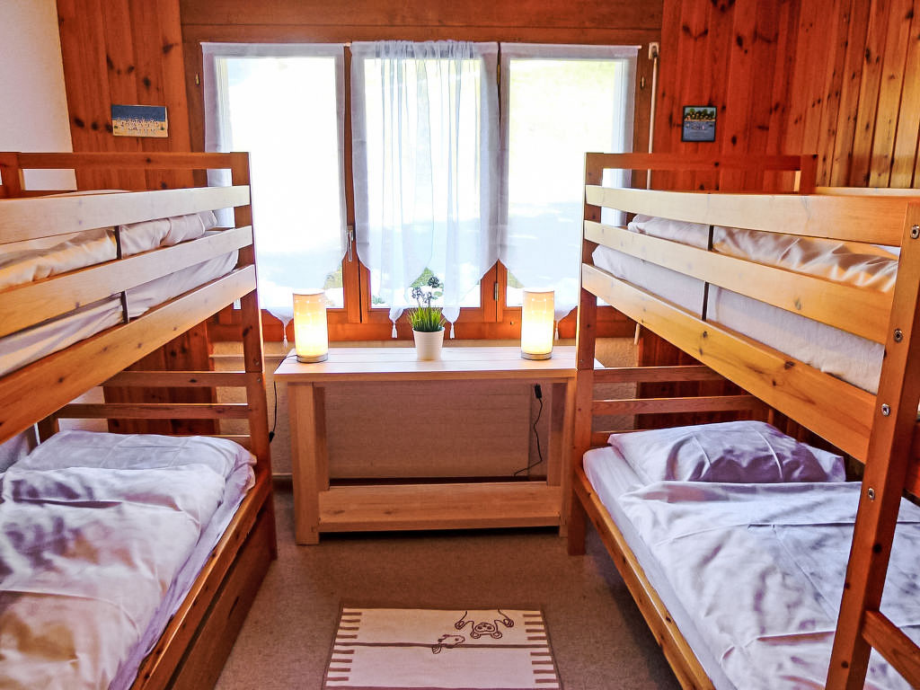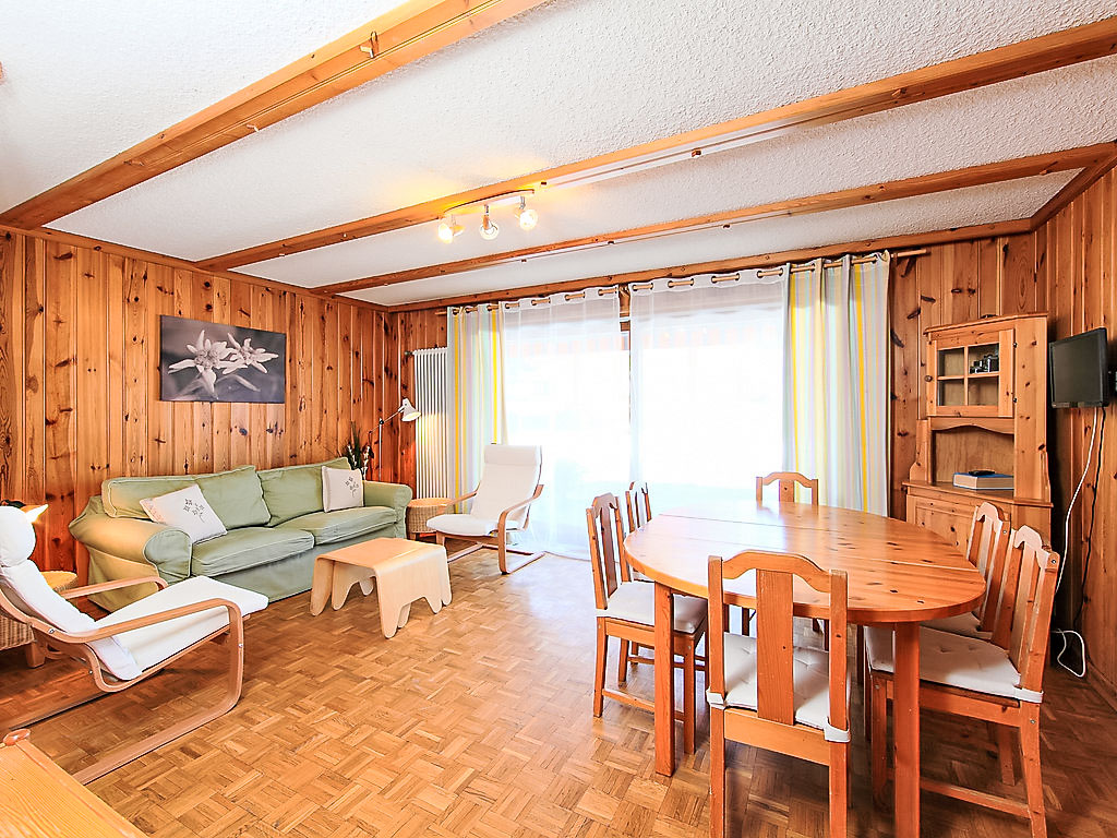 3-Zimmer-Wohnung 80 m2, im Erdgeschoss, Südlage. Zweckmässig und schön eingerichtet: Wohn-/Esszimmer mit Kabel-TV. Ausgang zum Garten, zur Terrasse. 1 Zimmer mit 1 Doppelbett (160 cm, Länge 200 cm). 1 Zimmer mit 2 x 2 Etagenbetten (80 cm, Länge 190 cm). Kleine Küche (Backofen, Geschirrspüler, 4 Glaskeramikherd Platten, Toaster, Wasserkocher, Mikrowelle, Tiefkühler, elektrische Kaffeemaschine, Racletteofen) mit Durchreiche. Bad/Bidet/WC, Dusche/WC. Parkettböden, Teppichboden. Terrasse. Terrassenmöbel. Schöne Sicht. Zur Verfügung: Internet (Wireless LAN, gratis). Garage Nr. 18.