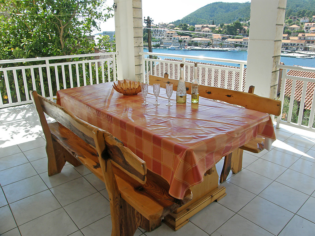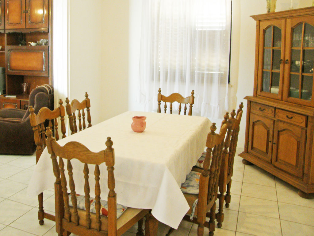 4-Zimmer-Wohnung 140 m2 im 1. Stock, Westlage. Wohn-/Esszimmer mit 1 Doppeldiwanbett (160 cm, Länge 190 cm), Sat-TV. Ausgang zur Terrasse. 1 Zimmer mit 1 franz. Bett (160 cm, Länge 200 cm), Dusche/WC. 1 Zimmer mit 1 franz. Bett (160 cm, Länge 200 cm), Dusche/WC. 1 Zimmer mit 1 franz. Bett (160 cm, Länge 200 cm). Ausgang zur Terrasse. Offene Küche (4 Kochplatten, Backofen, Tiefkühler). Ausgang zur Terrasse. Dusche/WC. Terrasse 24 m2, überdacht. Terrassenmöbel. Herrliche Sicht auf das Meer und die Ortschaft. 1 kleines Haustier/Hund erlaubt.