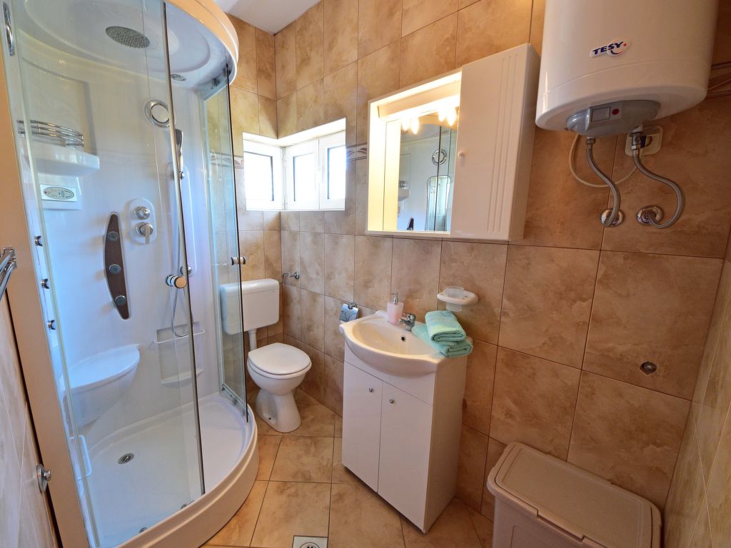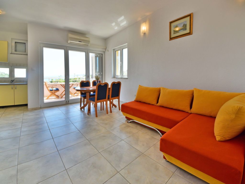 2-Zimmer-Wohnung 40 m2 im 1. Stock, Südostlage. Wohn-/Esszimmer 20 m2 mit 1 Doppeldiwanbett (140 cm, Länge 200 cm), Sat-TV (Flachbildschirm), Klimaanlage. Ausgang zum Balkon. 1 Zimmer mit 1 franz. Bett (160 cm, Länge 200 cm). Ausgang zum Balkon. Offene Küche (4 Kochplatten, Backofen). Dusche/WC, Hydromassage-Dusche. Klimaanlage (extra). Balkon 6 m2, kleiner Balkon 2 m2. Balkonmöbel. Fernsicht auf das Meer. Zur Verfügung: Internet (Wireless LAN, gratis). Parkplatz (1 Auto).