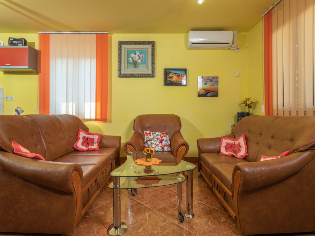 Das Ferienhaus ANA, an ein weiteres Haus angrenzend, liegt idyllisch und sonnig am Waldrand im kleinen Ort Zupanje auf der Insel Krk. Einkaufsmöglichkeit 1,4 km. Silo und Kiesstrand, jeweils 3 km. Sandstrand 4 km. Malinska 12 km. Vrbnik 13 km. Krk Stadt 18 km. Durch Mauer abgeschlossenes, ca. 250 m² großes, angelegtes Grundstück mit Einfahrtstor. Pool (3 x 5 m, 1,20 m tief, gesamte Saison geöffnet) mit gefliester Poolterrasse, 4 Sonnenliegen und Außendusche zur alleinigen Nutzung. Überdachte Terrasse mit Mobiliar. Freisitz, Hollywoodschaukel und gemauerter Grill. 3 Parkmöglichkeiten in Hausnähe (ca. 10 m, abschließbar). Geschmackvolle, ansprechende Einrichtung. Fliesen-, Laminat- und Steinböden. 3x Sat-TV (deutsche Programme). CD, Radio. Internetzugang (WLAN, inklusive). Waschmaschine. Bügeleisen/-brett. Safe. Fliegengitter. Klimaanlage mit Kühl-/Heizfunktion im Wohnraum. Elektro-Zustellheizung. Hinweis: Rauchen ist im Haus nicht gestattet.