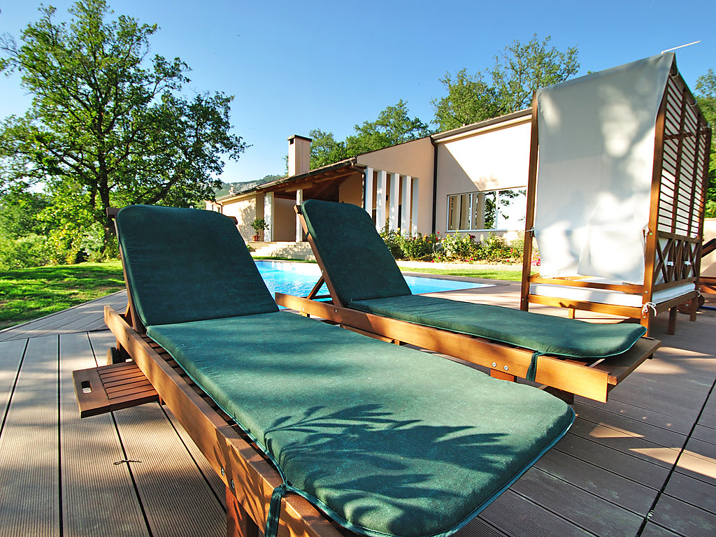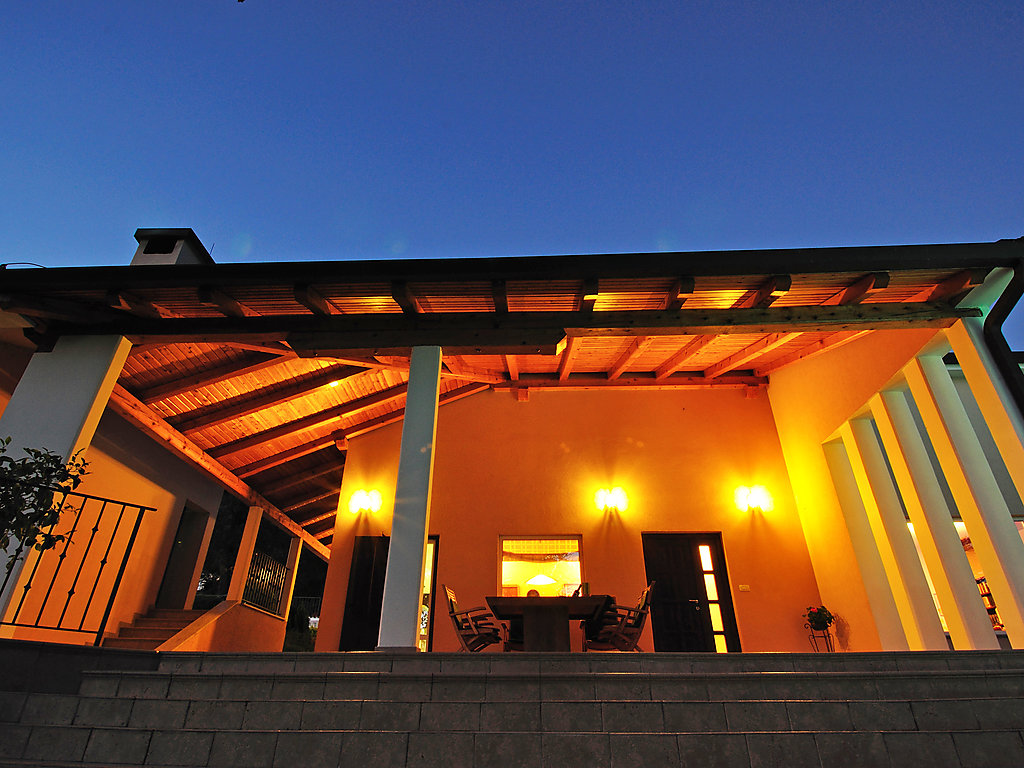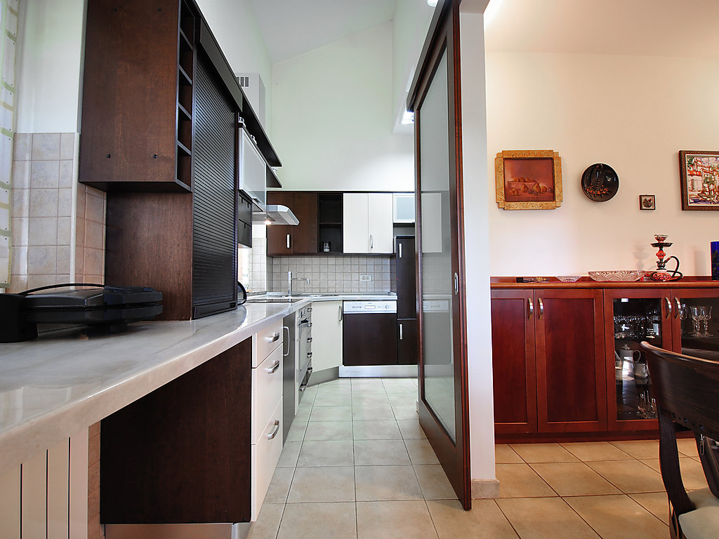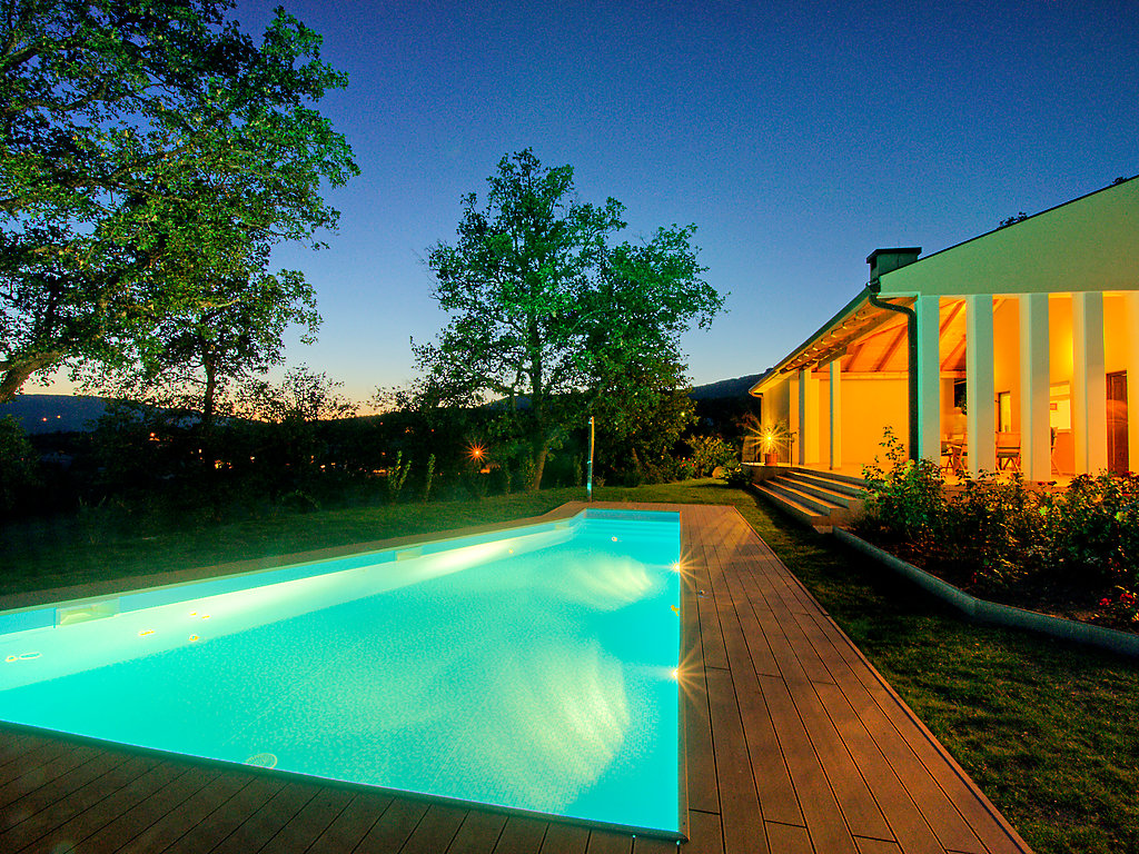 6-Zimmer-Villa 300 m2 auf 2 Stockwerken. Komfortabel und geschmackvoll eingerichtet: Wohnzimmer mit Panoramafenster mit Sat-TV (Flachbildschirm), DVD und Klimaanlage. Esszimmer mit Sat-TV (Flachbildschirm). Ausgang zur Terrasse. Offene Küche (4 Kochplatten, Backofen, Geschirrspüler, Mikrowelle). Sep. WC. Obergeschoss: 1 abgeschrägtes Zimmer, Deckenhöhe 160 - 250 cm mit 1 franz. Bett (160 cm, Länge 200 cm), Bad/Dusche/WC, Hydromassage-Dusche und Sprudelbad. 1 abgeschrägtes Zimmer, Deckenhöhe 160 - 250 cm mit 1 Doppelbett (2 x 80 cm, Länge 200 cm), Dusche/WC und Klimaanlage. Ausgang zur Terrasse. 1 abgeschrägtes Zimmer, Deckenhöhe 160 - 250 cm mit 1 Doppelbett (2 x 80 cm, Länge 200 cm), Klimaanlage. 1 abgeschrägtes Zimmer, Deckenhöhe 160 - 250 cm mit Dachfenster mit 2 Betten (80 cm, Länge 190 cm). Dusche/WC. Terrasse 55 m2, überdacht Terrasse 6 m2. Terrassenmöbel, Gartengrill (mobil), Liegestühle. Sicht auf das Schwimmbad und die Landschaft. Zur Verfügung: Babybett. Internet (Wireless LAN, gratis). Garage (2 Autos). 1 kleines Haustier/Hund erlaubt. Im Erdgeschoss: Taverne mit Grill, Sat-TV (Flachbildschirm).