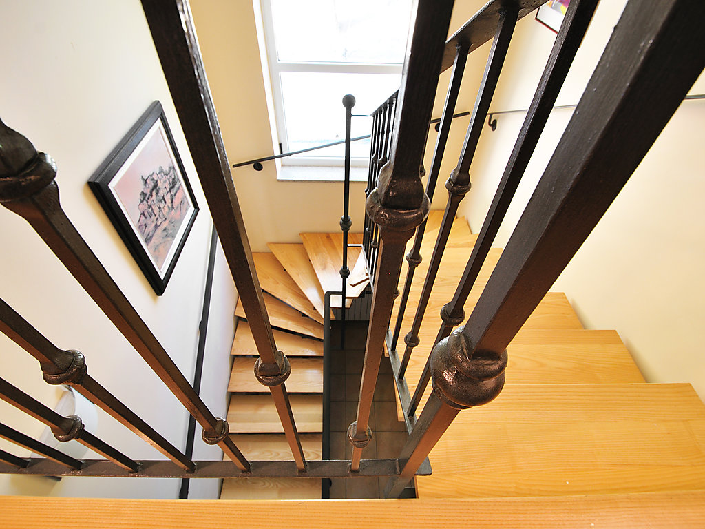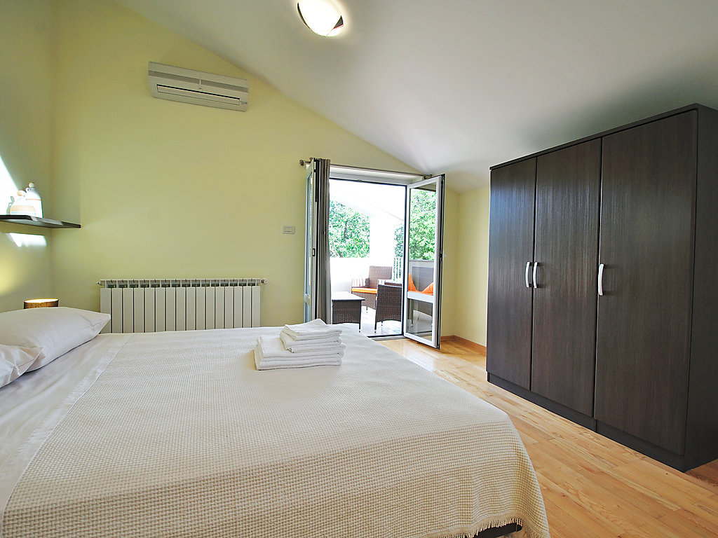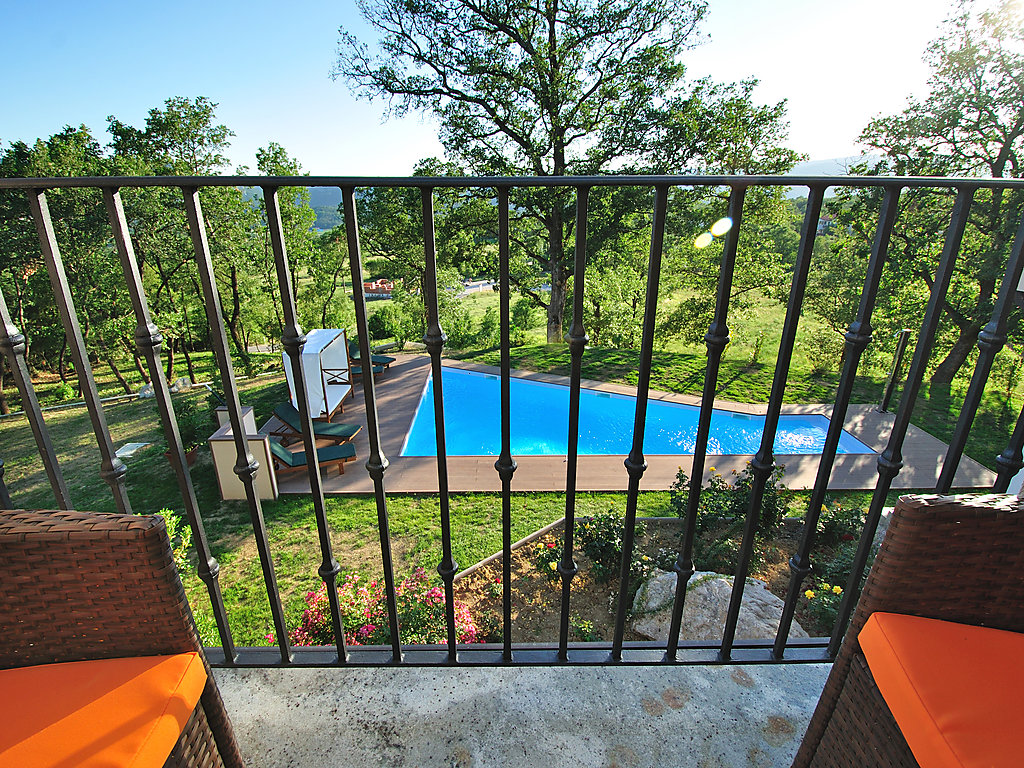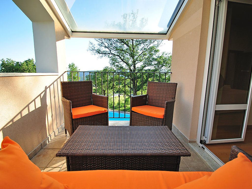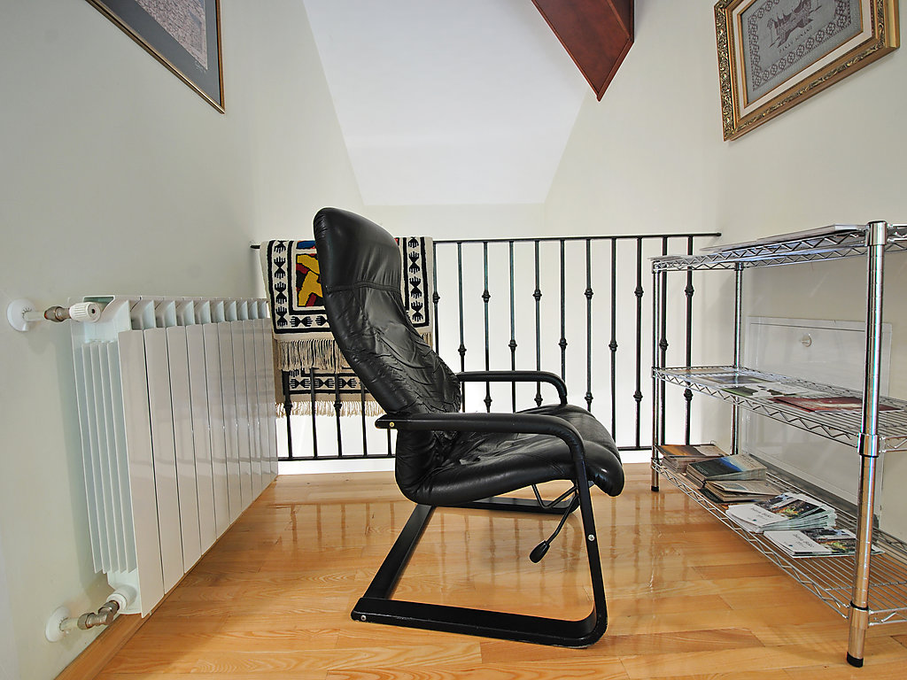 6-Zimmer-Villa 300 m2 auf 2 Stockwerken. Komfortabel und geschmackvoll eingerichtet: Wohnzimmer mit Panoramafenster mit Sat-TV (Flachbildschirm), DVD und Klimaanlage. Esszimmer mit Sat-TV (Flachbildschirm). Ausgang zur Terrasse. Offene Küche (4 Kochplatten, Backofen, Geschirrspüler, Mikrowelle). Sep. WC. Obergeschoss: 1 abgeschrägtes Zimmer, Deckenhöhe 160 - 250 cm mit 1 franz. Bett (160 cm, Länge 200 cm), Bad/Dusche/WC, Hydromassage-Dusche und Sprudelbad. 1 abgeschrägtes Zimmer, Deckenhöhe 160 - 250 cm mit 1 Doppelbett (2 x 80 cm, Länge 200 cm), Dusche/WC und Klimaanlage. Ausgang zur Terrasse. 1 abgeschrägtes Zimmer, Deckenhöhe 160 - 250 cm mit 1 Doppelbett (2 x 80 cm, Länge 200 cm), Klimaanlage. 1 abgeschrägtes Zimmer, Deckenhöhe 160 - 250 cm mit Dachfenster mit 2 Betten (80 cm, Länge 190 cm). Dusche/WC. Terrasse 55 m2, überdacht Terrasse 6 m2. Terrassenmöbel, Gartengrill (mobil), Liegestühle. Sicht auf das Schwimmbad und die Landschaft. Zur Verfügung: Babybett. Internet (Wireless LAN, gratis). Garage (2 Autos). 1 kleines Haustier/Hund erlaubt. Im Erdgeschoss: Taverne mit Grill, Sat-TV (Flachbildschirm).