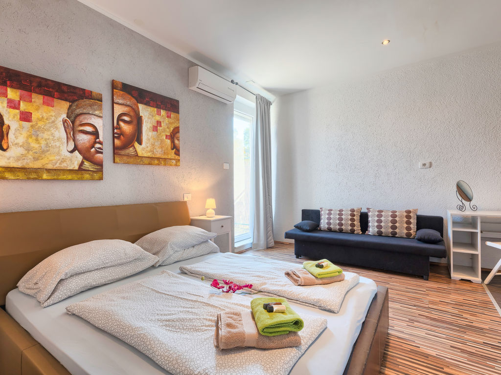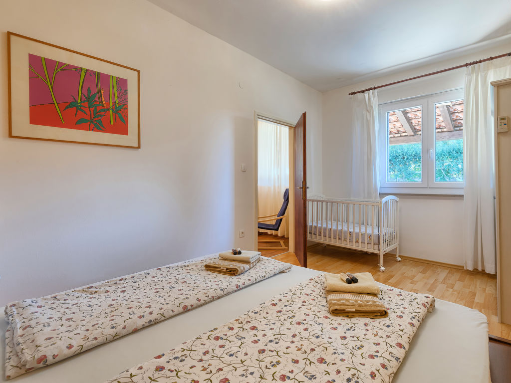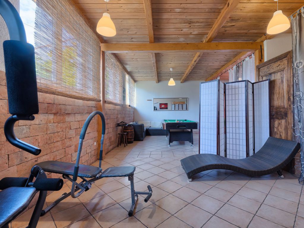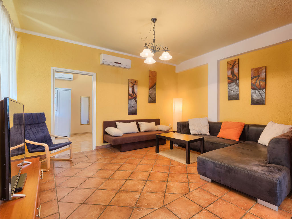 7-Zimmer-Haus 300 m2. Wohn-/Esszimmer mit 1 Doppeldiwanbett, Sat-TV, DVD und Klimaanlage. Ausgang zur Terrasse. Wohnzimmer mit Sat-TV. Ausgang zur Terrasse, zum Schwimmbad. 1 Zimmer mit 1 Doppelbett (2 x 80 cm, Länge 200 cm), Klimaanlage. 3 Zimmer, jedes Zimmer mit 1 franz. Bett (160 cm, Länge 200 cm), Dusche/WC, Sat-TV und Klimaanlage. 1 Zimmer mit 1 franz. Bett (160 cm, Länge 200 cm). Offene Küche (4 Kochplatten, Backofen, Geschirrspüler, Mikrowelle, Tiefkühler). Bad/WC, 2 sep. WC's. Terrasse 15 m2, überdacht, Terrasse 20 m2, überdacht. Terrassenmöbel, Gartengrill. Sicht auf den Garten. Zur Verfügung: Babybett. Internet (Wireless LAN, gratis). 2 Haustiere/Hunde erlaubt.