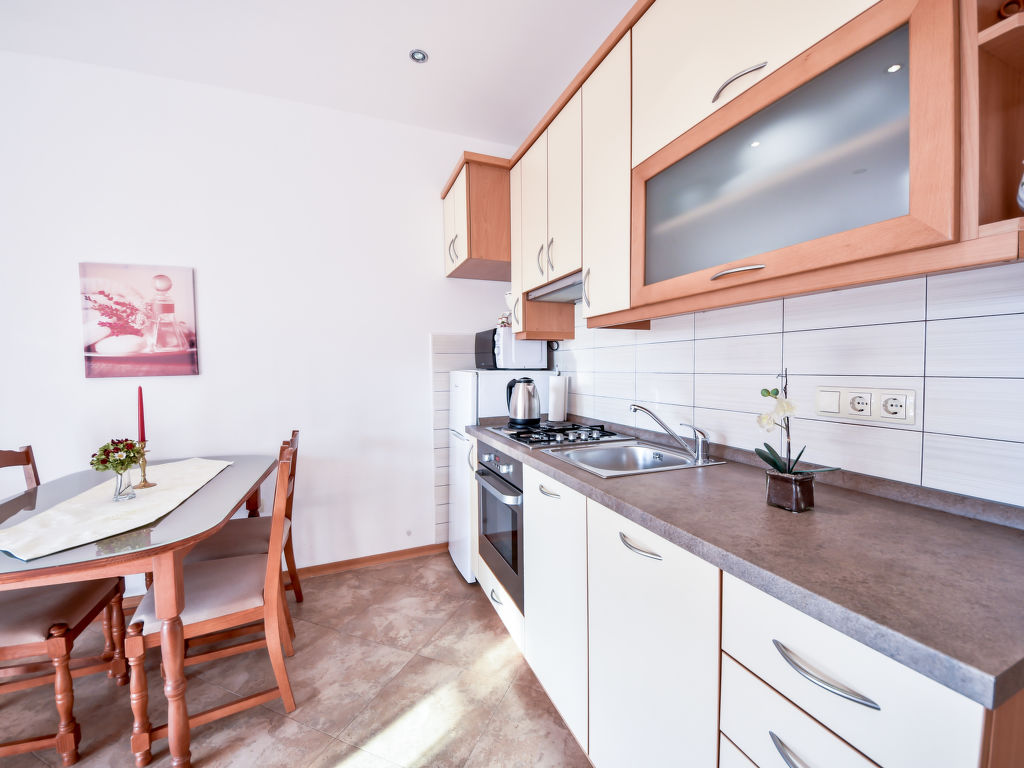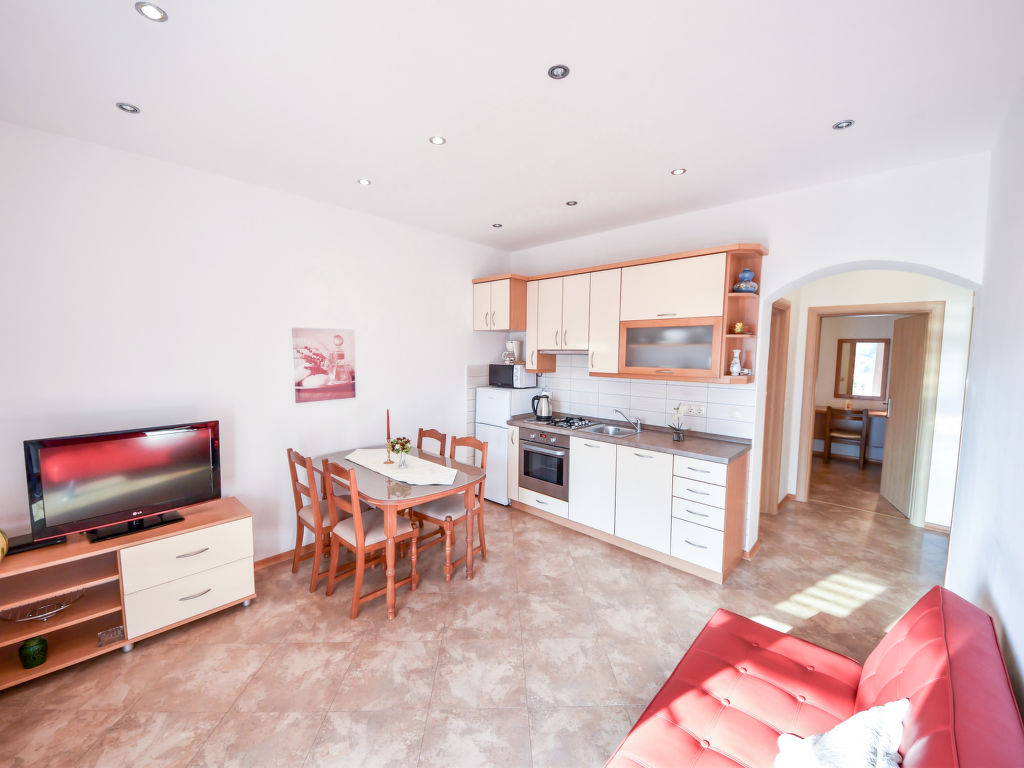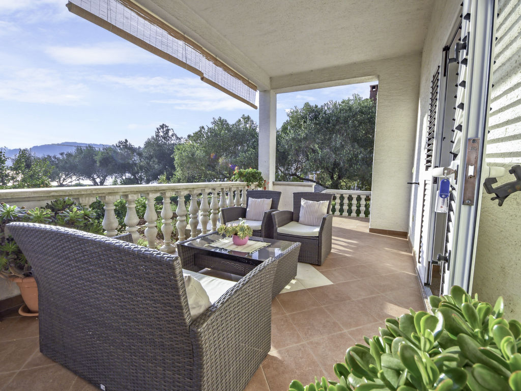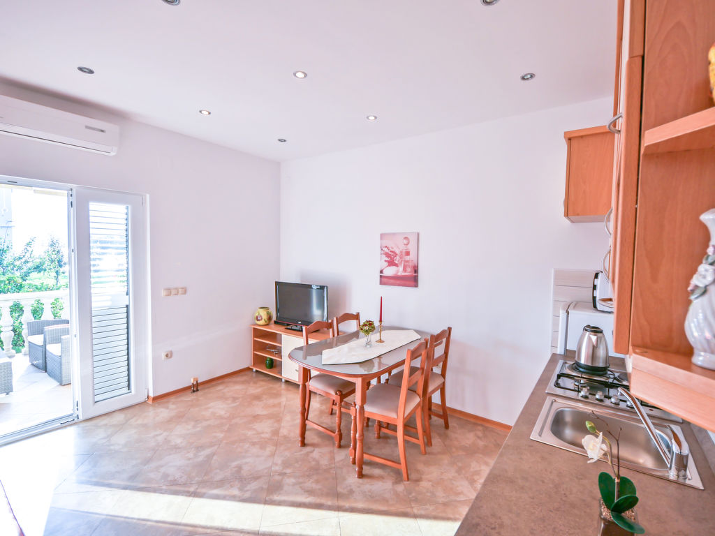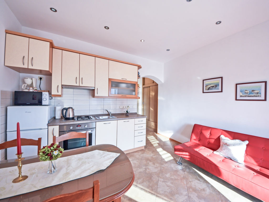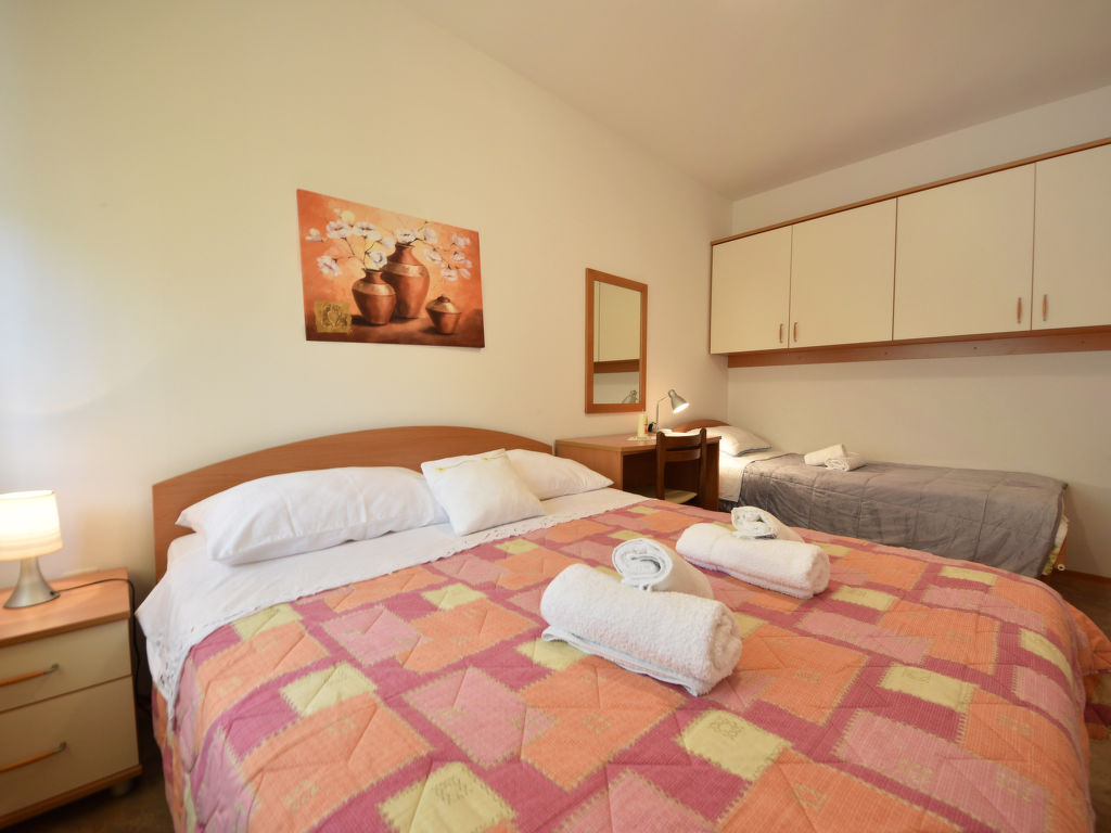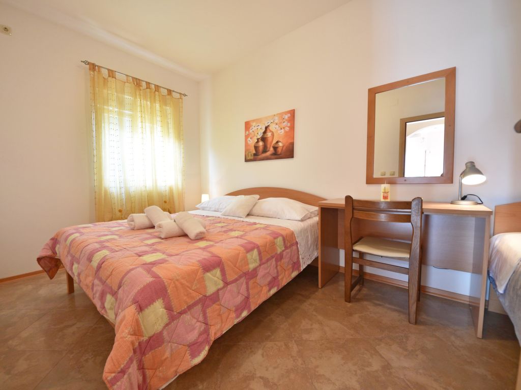 2-Zimmer-Wohnung 35 m2, im Erdgeschoss. Wohn-/Esszimmer mit 1 Diwanbett und Sat-TV (Flachbildschirm), Klimaanlage. Ausgang zur Terrasse. 1 Zimmer mit 1 Bett (90 cm, Länge 200 cm), 1 franz. Bett (160 cm, Länge 200 cm). Offene Küche (4 Kochplatten, Backofen, Tiefkühler). Dusche/WC. Terrasse 16 m2, überdacht. Terrassenmöbel. Eingeschränkte Sicht auf das Meer. Zur Verfügung: Waschmaschine. Internet (Wireless LAN, gratis).