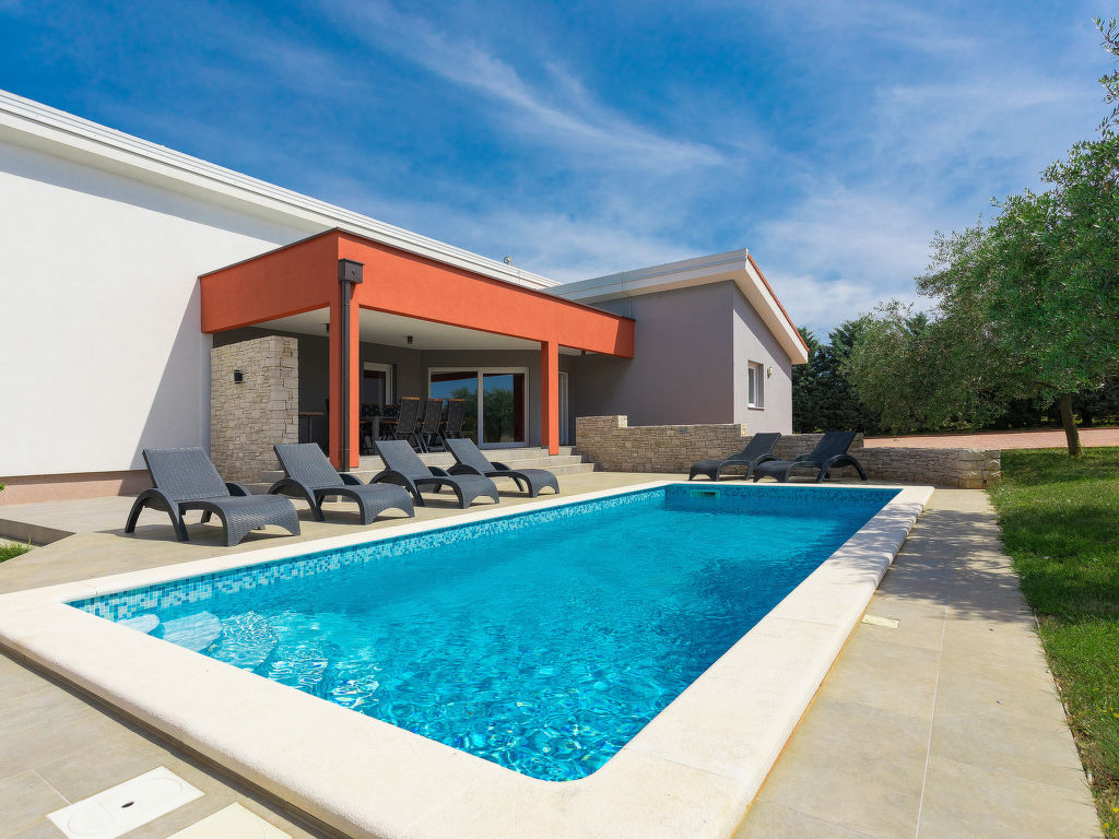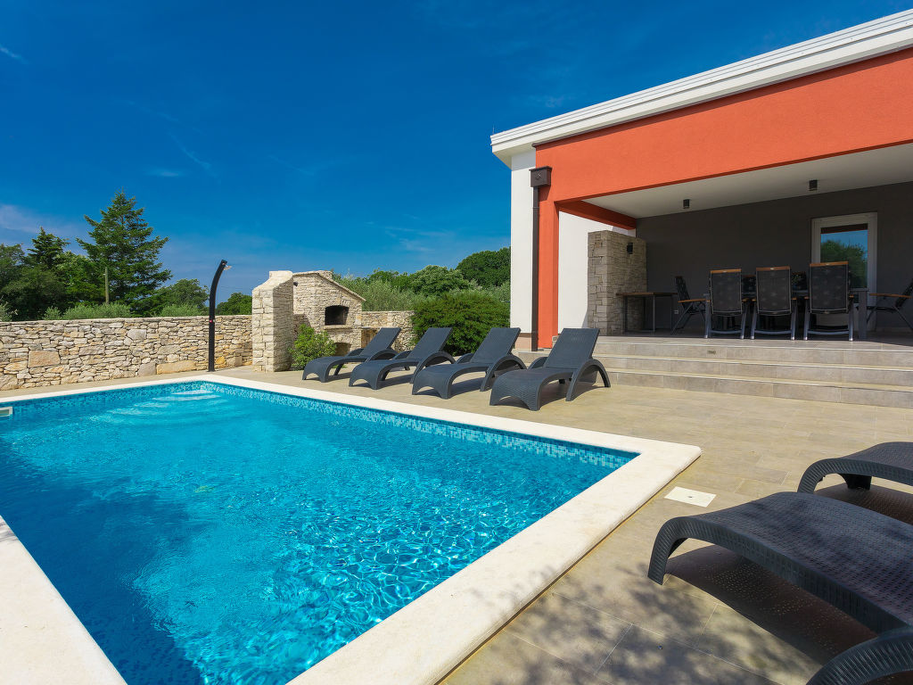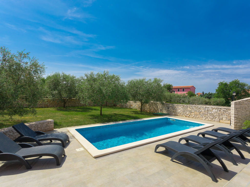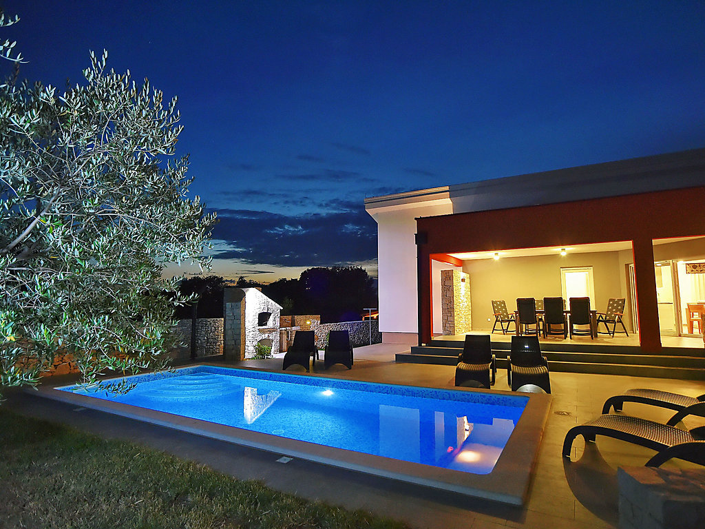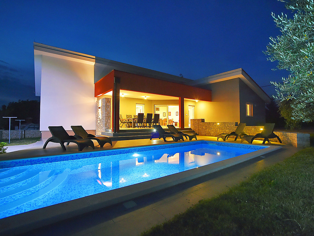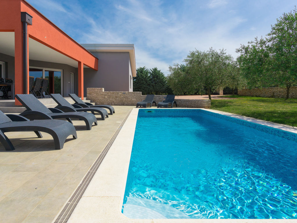 Krnica 22 km von Pula: Moderne, schöne Villa "Krnica". Ruhige, sonnige Lage, 2.5 km vom Meer, 2.5 km vom Strand. Zur Mitbenutzung: Grundstück, Wiese 3'500 m2. (Schaukel). Zur Alleinbenutzung: Grundstück 1'000 m2 (eingezäunt), Garten mit Rasen und Bäumen, Schwimmbad eckig (8 x 3 m, 24 m2, 140 cm tief, 11.05.-21.09.) mit Innentreppe. Aussendusche, Grill. Im Hause: Internetzugang, Waschmaschine. Parkplatz (für 3 Autos) beim Haus auf dem Grundstück. Einkaufsgeschäft, Restaurant 200 m, Kieselstrand 5 km, Felsstrand 2.5 km, Hallenbad 5 km. Tennis 5 km, Reitstall 6 km, Sportzentrum 5 km, Wanderwege ab Haus 3 km, Radweg 3 km.