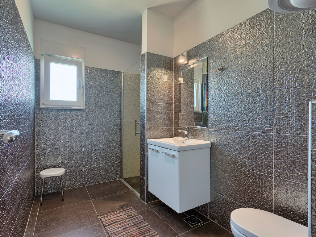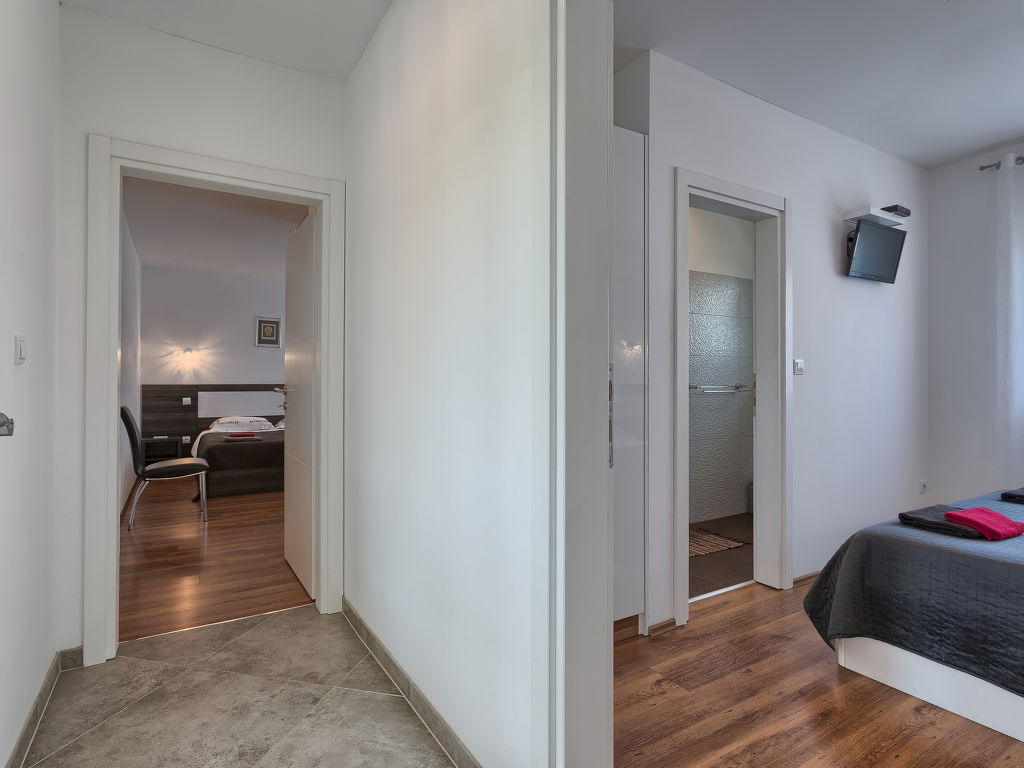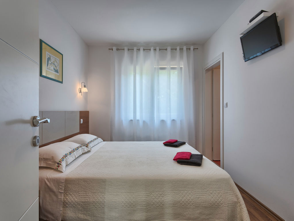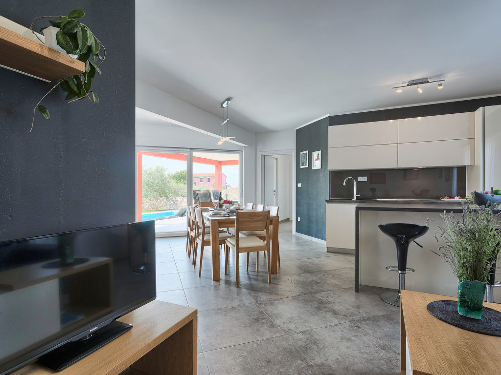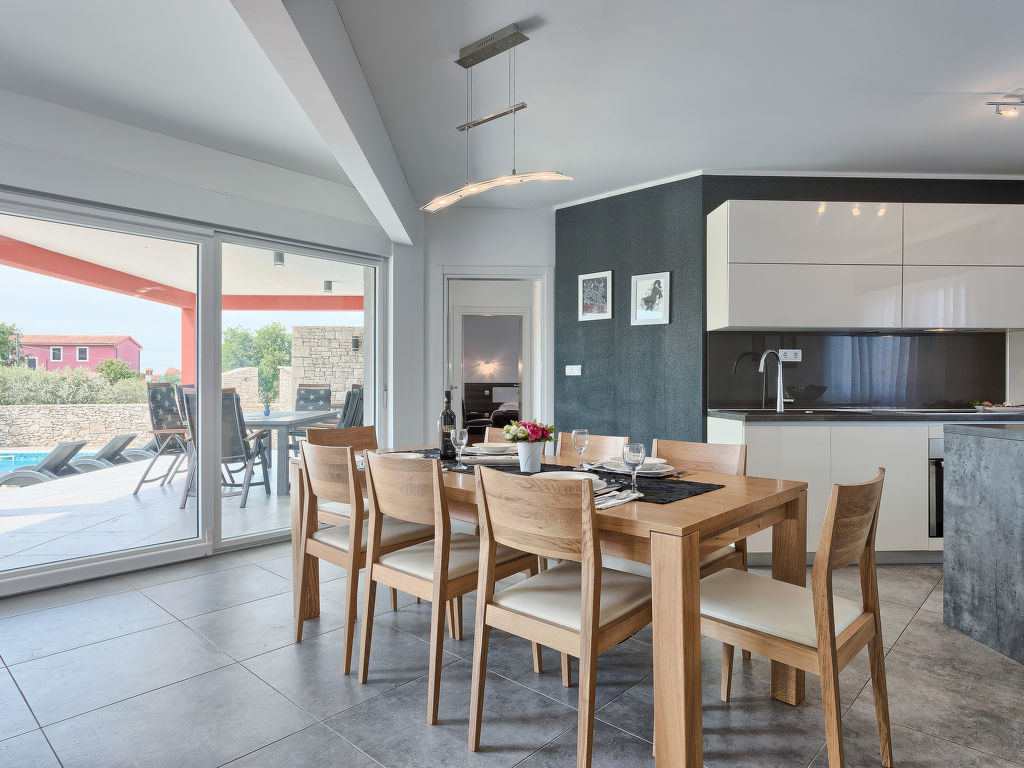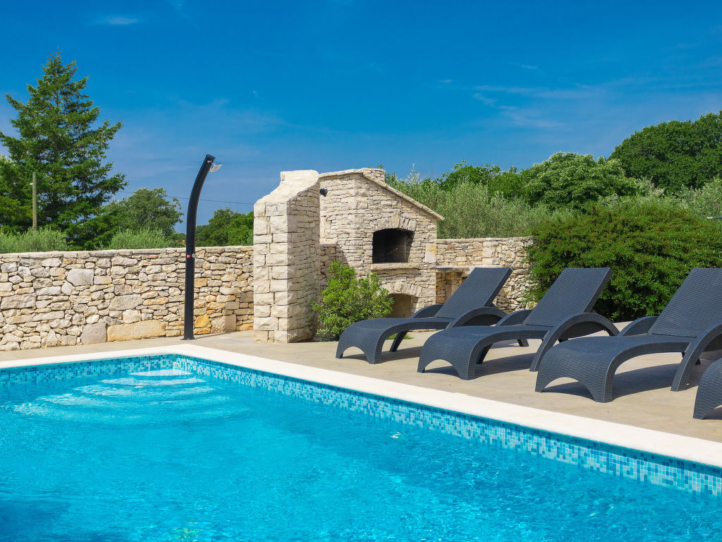 Krnica 22 km von Pula: Moderne, schöne Villa "Krnica". Ruhige, sonnige Lage, 2.5 km vom Meer, 2.5 km vom Strand. Zur Mitbenutzung: Grundstück, Wiese 3'500 m2. (Schaukel). Zur Alleinbenutzung: Grundstück 1'000 m2 (eingezäunt), Garten mit Rasen und Bäumen, Schwimmbad eckig (8 x 3 m, 24 m2, 140 cm tief, 11.05.-21.09.) mit Innentreppe. Aussendusche, Grill. Im Hause: Internetzugang, Waschmaschine. Parkplatz (für 3 Autos) beim Haus auf dem Grundstück. Einkaufsgeschäft, Restaurant 200 m, Kieselstrand 5 km, Felsstrand 2.5 km, Hallenbad 5 km. Tennis 5 km, Reitstall 6 km, Sportzentrum 5 km, Wanderwege ab Haus 3 km, Radweg 3 km.