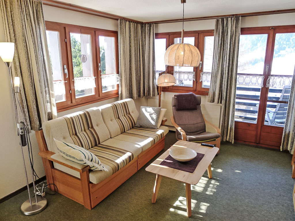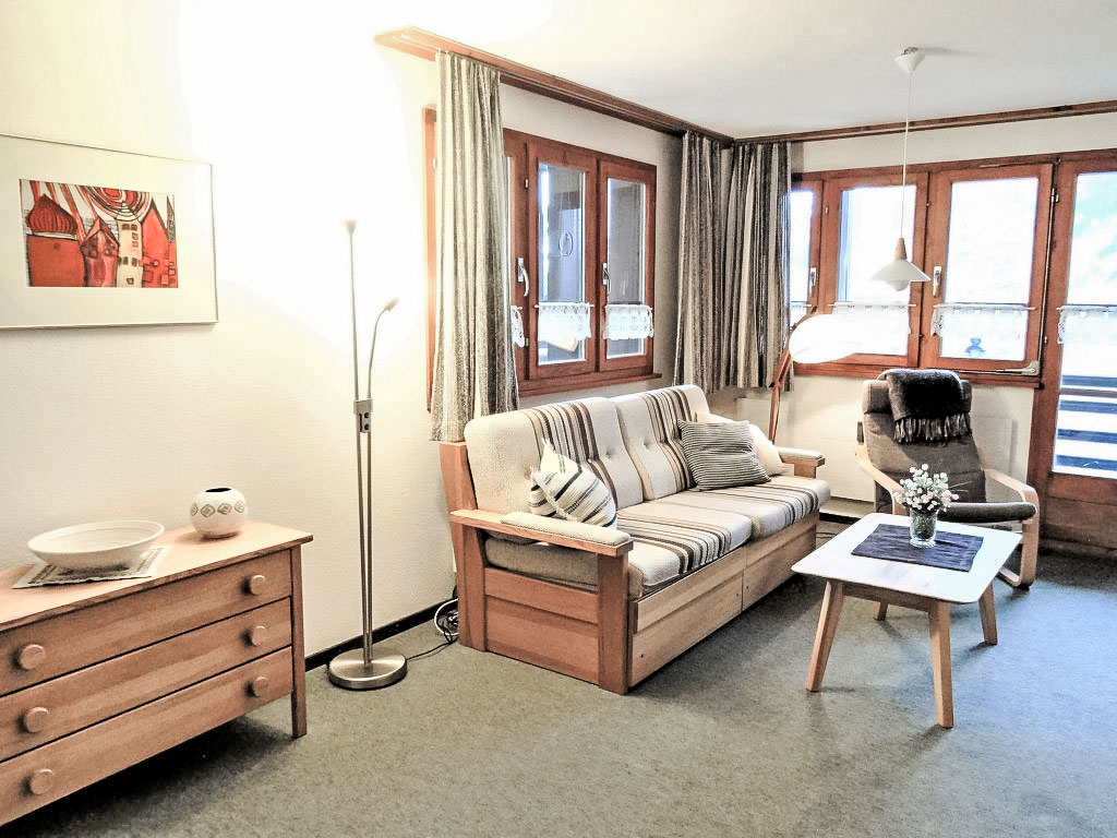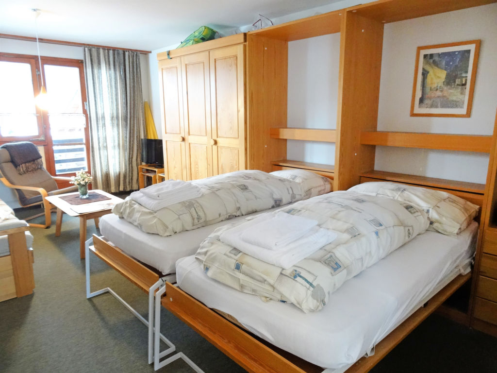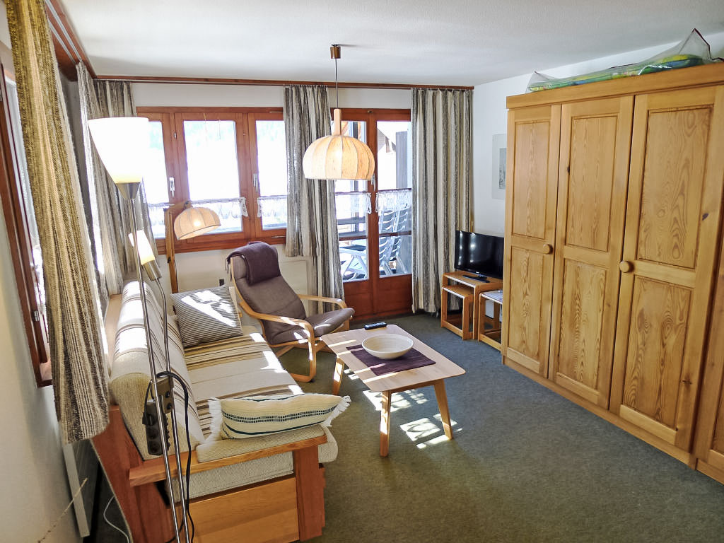 1-Zimmer-Wohnung 38 m2. Gemütlich eingerichtet: Wohn-/Schlafzimmer mit 1 Diwanbett, 2 Wandschrankbetten und Kabel-TV (Flachbildschirm), Radio. Offene Küche (Backofen). Bad/WC. Balkon. Terrassenmöbel. Sehr schöne Sicht auf die Berge. Zur Verfügung: Internet (Wireless LAN). Bitte beachten: Nichtraucher-Unterkunft.