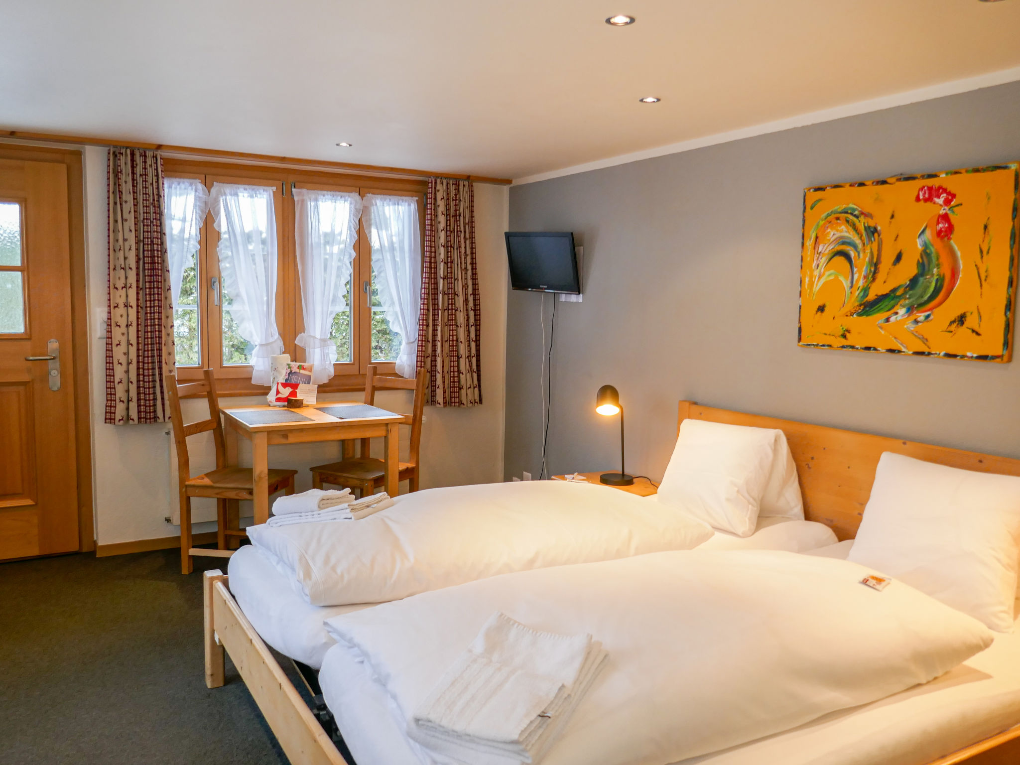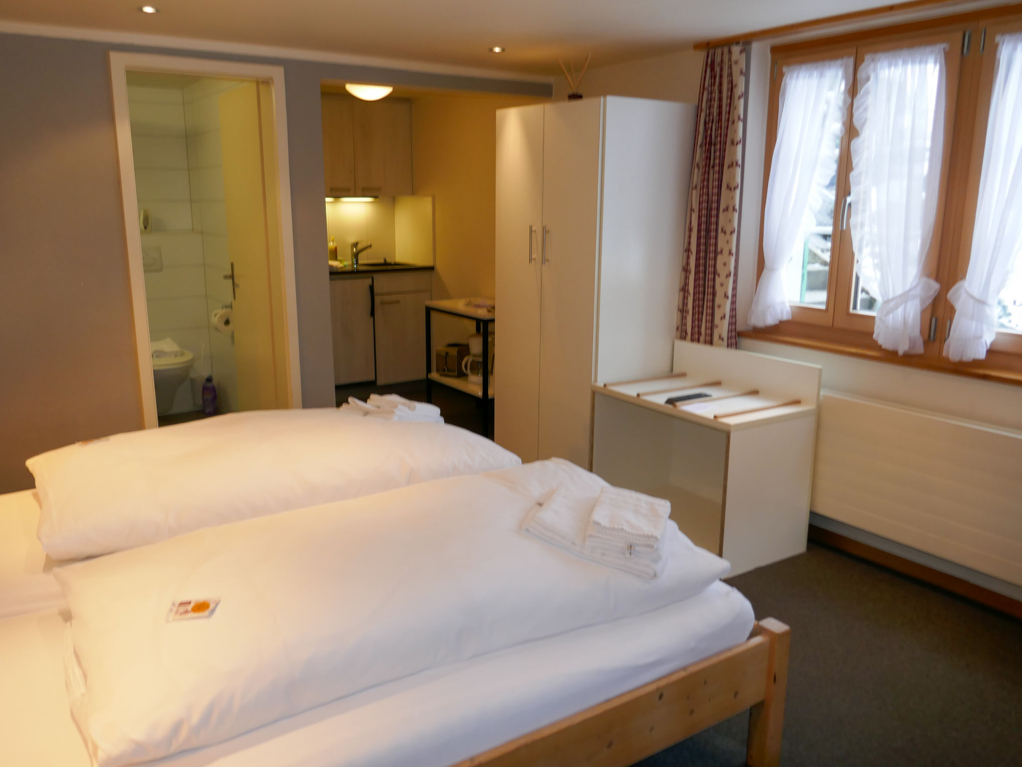 "Schwendihus", 1-Zimmer-Wohnung 25 m2, im Erdgeschoss, Südlage. Zweckmässig und gemütlich eingerichtet: Wohn-/Schlafzimmer mit 1 Doppelbett (2 x 90 cm, Länge 200 cm), Kabel-TV (Flachbildschirm). Ausgang zum Gartensitzplatz, Richtung Süden. Kochnische (2 Kochplatten, Toaster, Wasserkocher, elektrische Kaffeemaschine). Dusche/WC. Sicht auf die Berge. Zur Verfügung: Haartrockner. Internet (Wireless LAN, gratis). Parkplatz beim Haus. Bitte beachten: Wohnung auf Strassenseite. Maximal 1 Haustier/Hund erlaubt. Feuerlöscher.