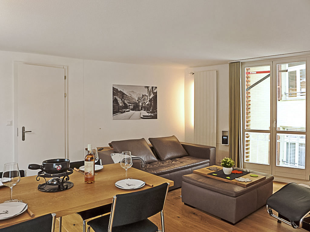 2-Zimmer-Wohnung 40 m2 im 2. Stock. Modern und geschmackvoll eingerichtet: Wohn-/Esszimmer mit TV. 1 Zimmer mit 1 Doppelbett (2 x 90 cm, Länge 200 cm). Offene Küche (Backofen, Geschirrspüler, 4 Glaskeramikherd Platten, Toaster, Wasserkocher, Mikrowelle, elektrische Kaffeemaschine, Kapseln für die Kaffeemaschine (Nespresso) extra, Racletteofen, Fondue Set (Käse)). Dusche/WC. Holzböden. Kleiner Balkon. Balkonmöbel. Schöne Sicht auf die Berge und die Ortschaft. Zur Verfügung: Haartrockner. Internet (Wireless LAN, gratis). Bitte beachten: nicht geeignet für Kinder unter 8 Jahren. Nichtraucher-Unterkunft.