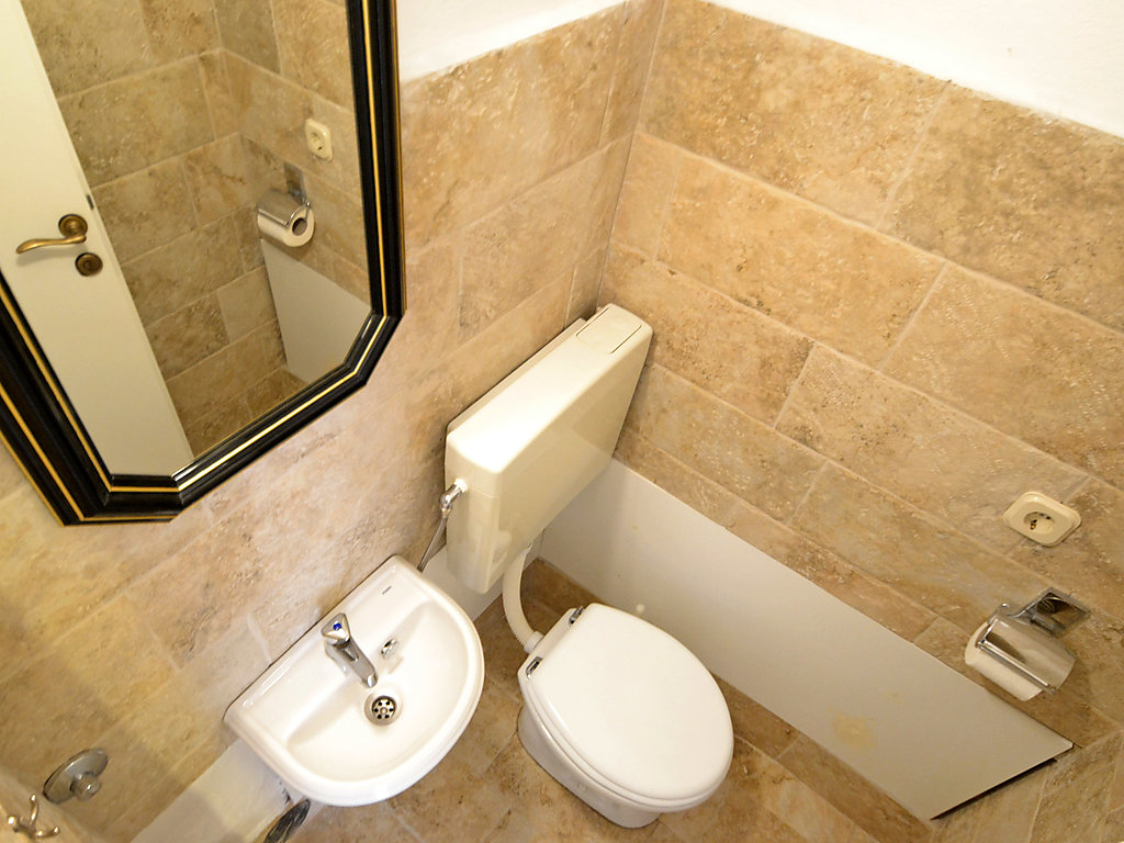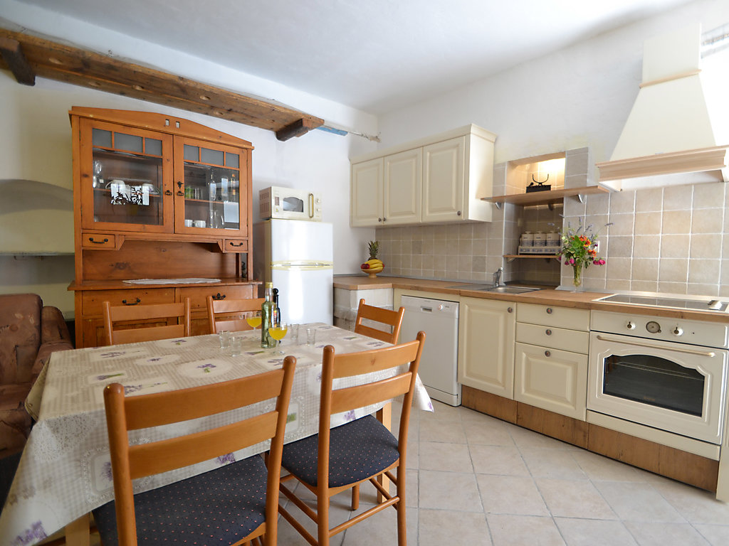 3-Zimmer-Reihenhaus 100 m2 auf 4 Stockwerken, Südlage. Wohnzimmer mit Sat-TV und DVD. Esszimmer. Offene Küche (4 Kochplatten, Backofen, Geschirrspüler, elektrische Kaffeemaschine). Sep. WC. Obergeschoss: 1 Zimmer mit 1 franz. Bett (160 cm, Länge 190 cm), 1 Ausziehbett (Länge 190 cm). Dusche/WC. 2. Obergeschoss: 1 Zimmer mit 1 Bett (90 cm, Länge 200 cm), 1 franz. Bett (160 cm, Länge 200 cm), Klimaanlage. Dusche/WC. Dachgeschoss: Esszimmer abgeschrägtes, Deckenhöhe 140 - 210 cm mit Dachfenster mit Küchenblock. Ausgang zur Terrasse. Terrasse 15 m2. Terrassenmöbel. Eingeschränkte Sicht auf das Meer und die Ortschaft. Zur Verfügung: Safe. Internet (Wireless LAN, gratis). Parkplatz (eingezäunt) in 500 m.