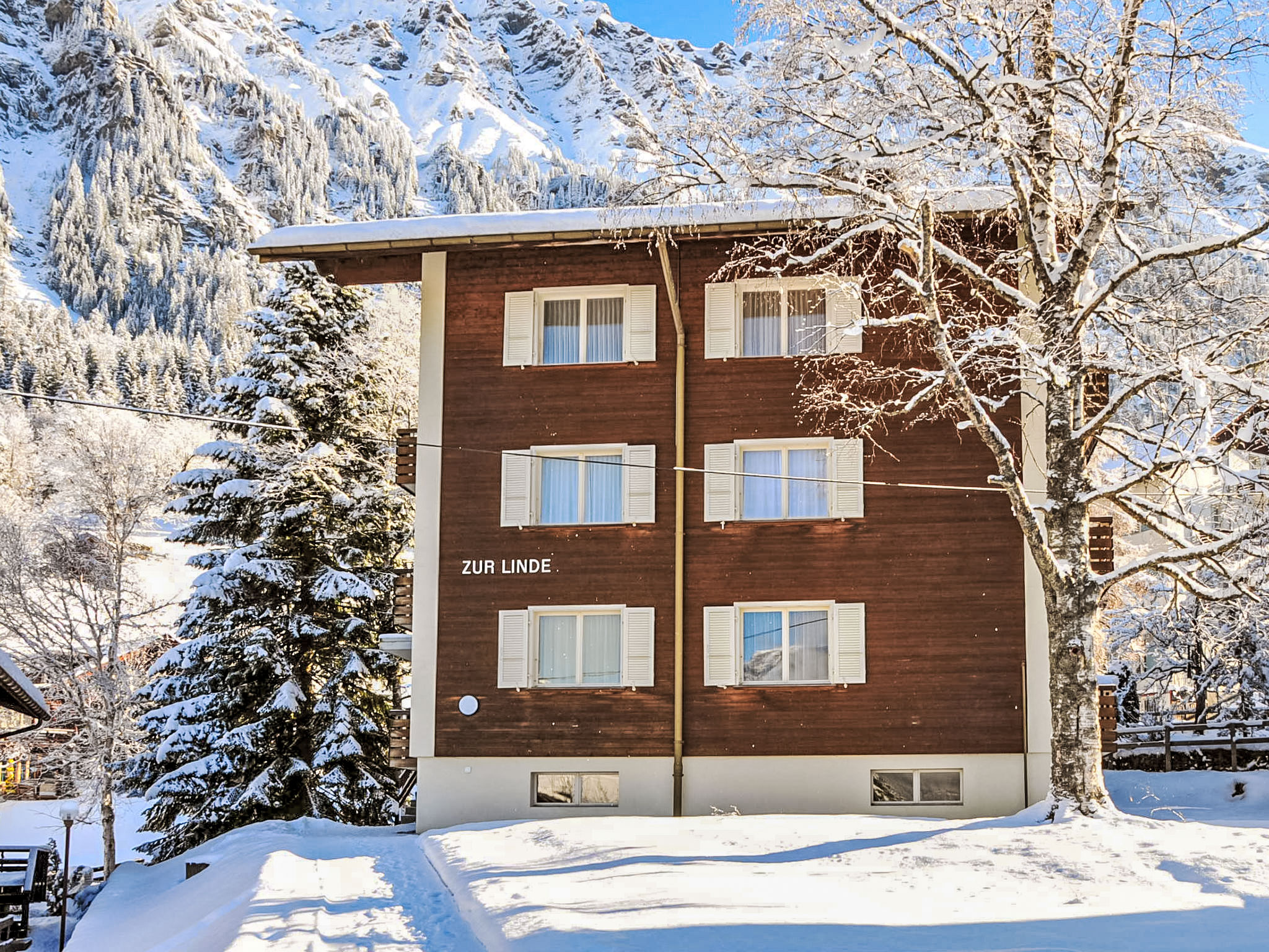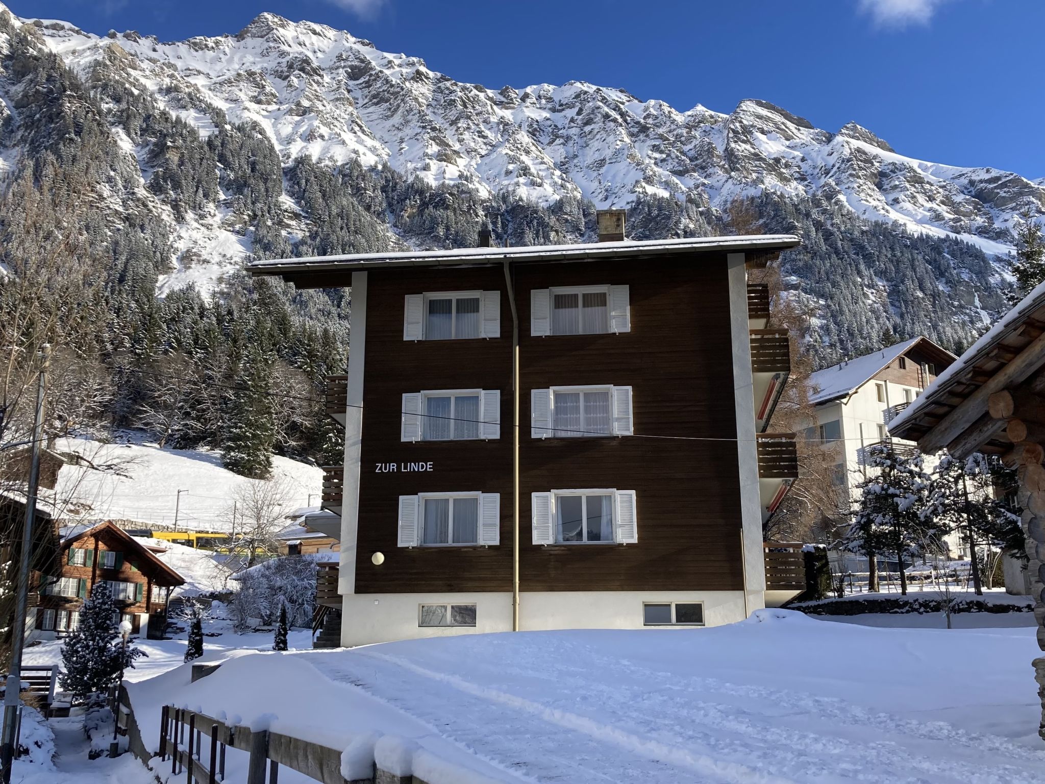 Appartementhaus "Zur Linde". Oberhalb von Wengen, 800 m vom Zentrum, ruhige, sonnige Lage. Im Hause: Zentralheizung. Einkaufsservice vor Anreise möglich. 30 m Fussweg bis zum Haus. Einkaufsgeschäft, Supermarkt 800 m, Restaurant 700 m, Bar, Bäckerei 800 m, Zentrum zu Fuss in 8 Minuten erreichbar, Bahnstation "Wengen" 800 m, Freibad 600 m. Luftseilbahn, Skisportanlagen 800 m, Skipisten 10 m. Bitte beachten: autofreie Ferienanlage. Bei guter Schneelage Zufahrt mit den Skiern bis zum Haus. Die Anreise erfolgt mit der Bergbahn. Anreise ist nur mit dem Zug ab Lauterbrunnen möglich – 14 Min. Fahrzeit.