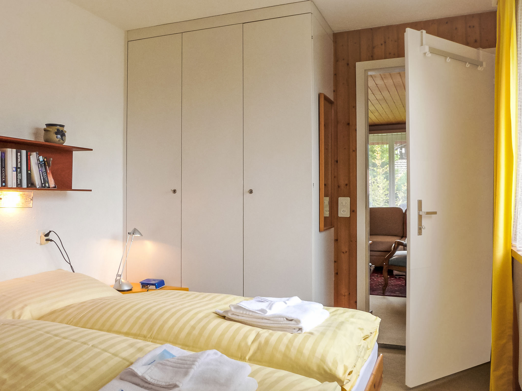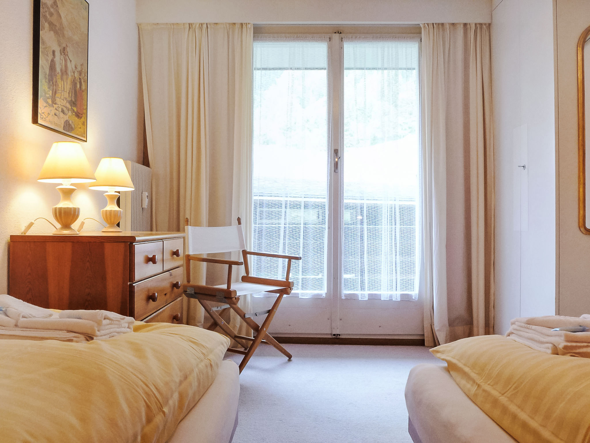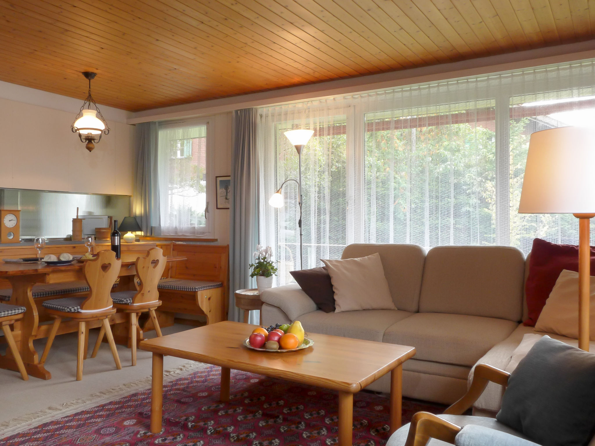 3-Zimmer-Wohnung 70 m2, im Erdgeschoss. Rustikal und gemütlich eingerichtet: Wohn-/Esszimmer mit Esstisch, Sat-TV, Radio, CD und DVD. 1 Zimmer mit 1 Doppelbett (2 x 90 cm, Länge 200 cm). 1 Zimmer mit 2 Betten (90 cm, Länge 200 cm). Küche (Backofen, Geschirrspüler, 4 Glaskeramikherd Platten, Toaster, Wasserkocher, Mikrowelle, elektrische Kaffeemaschine, Kapseln für die Kaffeemaschine (Nespresso) extra, Racletteofen, Fondue Set (Käse)). Sep. WC, Bad/Dusche/WC. Balkon. Balkonmöbel. Schöne Sicht auf die Berge. Zur Verfügung: Haartrockner. Internet (Wireless LAN, gratis). Bitte beachten: Nichtraucher-Unterkunft.