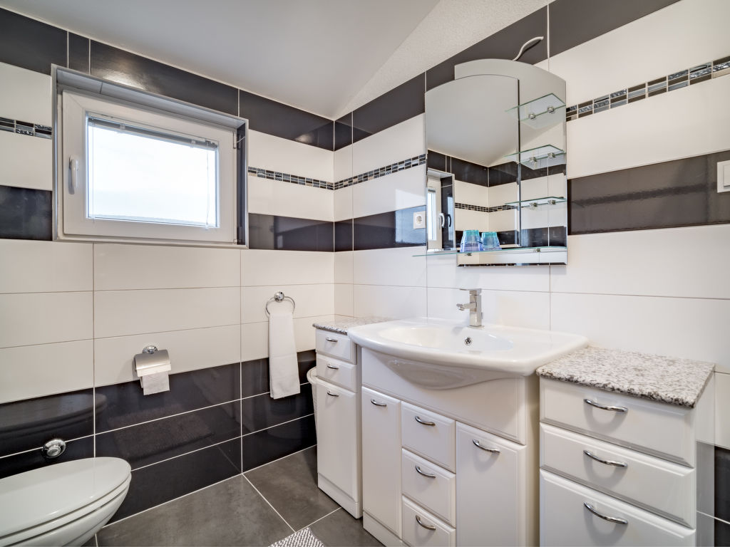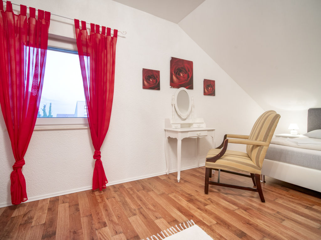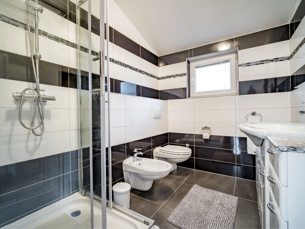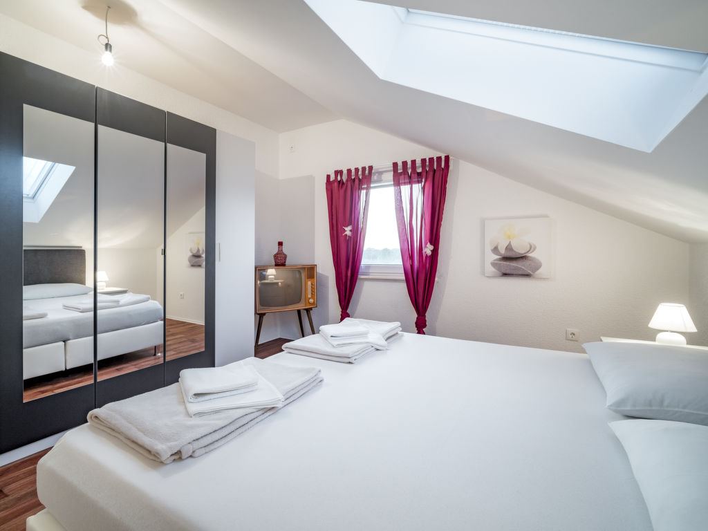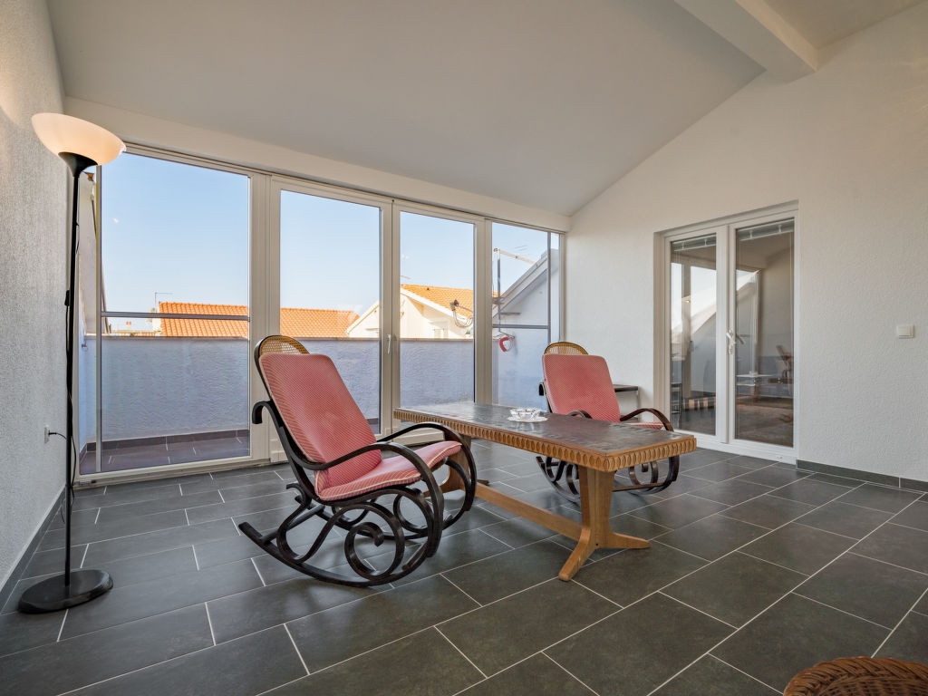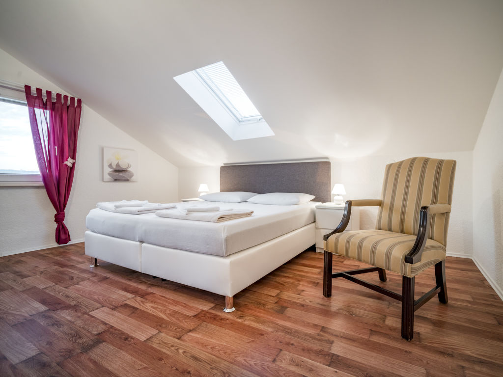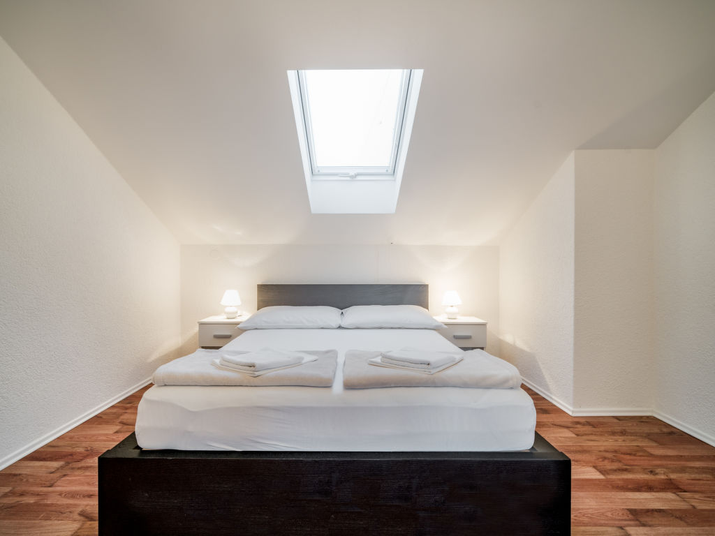 4-Zimmer-Wohnung 135 m2, im Dachgeschoss, Südwestlage. Abgeschrägtes Wohn-/Esszimmer 40 m2, Deckenhöhe 120 - 250 cm mit Sat-TV (Flachbildschirm), Klimaanlage. 3 abgeschrägte Zimmer, Deckenhöhe 120 - 250 cm, jedes Zimmer mit 1 franz. Bett (160 cm, Länge 200 cm), Sat-TV. Abgeschrägte Küche (4 Kochplatten, Backofen, Geschirrspüler, Tiefkühler, elektrische Kaffeemaschine), Deckenhöhe 180 - 250 cm. Dusche/Bidet/WC. Terrasse 7 m2. Terrassenmöbel. Eingeschränkte Sicht auf das Meer. Zur Verfügung: Waschmaschine. Internet (Wireless LAN, gratis). 1 Haustier/Hund erlaubt.