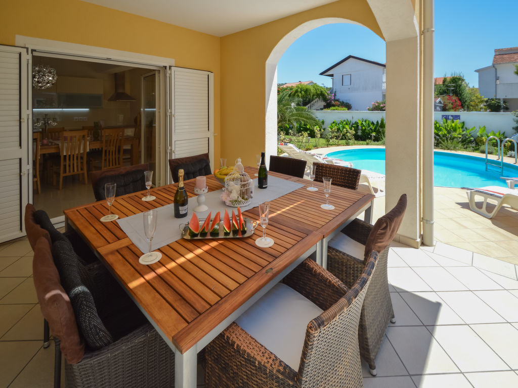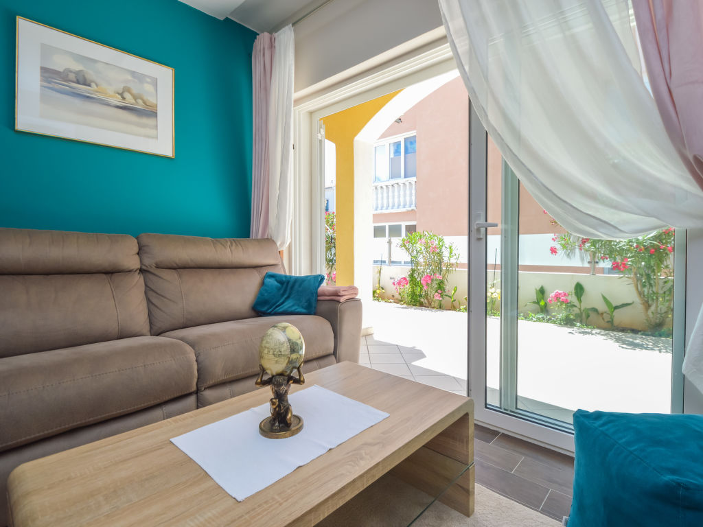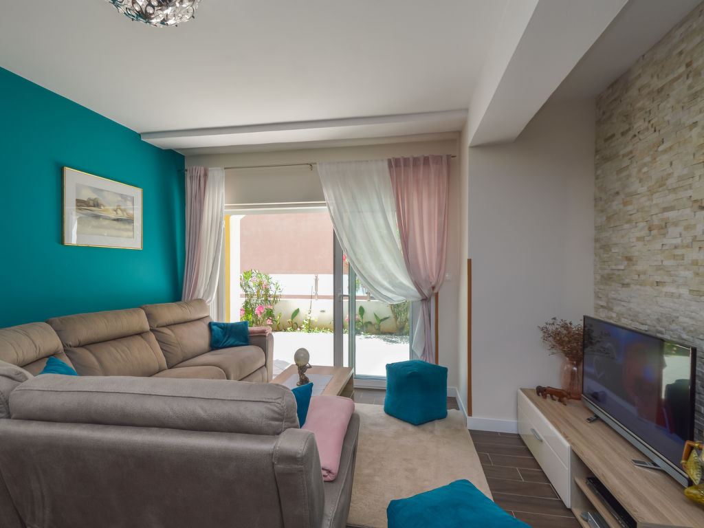 6-Zimmer-Doppelhaushälfte 170 m2 auf 2 Stockwerken. Komfortabel und modern eingerichtet: Wohn-/Esszimmer 50 m2 mit Sat-TV (Flachbildschirm), DVD und Klimaanlage. Ausgang zur Terrasse. 1 Zimmer mit 1 franz. Bett (180 cm, Länge 200 cm). 1 Zimmer mit 1 franz. Bett (180 cm, Länge 200 cm). Ausgang zur Terrasse. 1 Zimmer mit 2 Betten (90 cm, Länge 200 cm). Ausgang zur Terrasse. Offene Küche (Backofen, Geschirrspüler, 4 Glaskeramikherd Platten, Mikrowelle, Tiefkühler, elektrische Kaffeemaschine). Dusche/WC. Obergeschoss: 1 Zimmer 10 m2 mit 1 franz. Bett (160 cm, Länge 200 cm), Dusche/WC und Sat-TV (Flachbildschirm), Klimaanlage. Ausgang zur Terrasse. 1 Zimmer mit 1 franz. Bett (160 cm, Länge 200 cm). Küche (2 Glaskeramikherd Platten) mit Esstisch. Dusche/WC. Terrasse 20 m2 teilweise überdacht, 3 Terrassen 4 m2. Terrassenmöbel. Sicht auf das Schwimmbad. Zur Verfügung: Babybett. Internet (Wireless LAN, gratis).