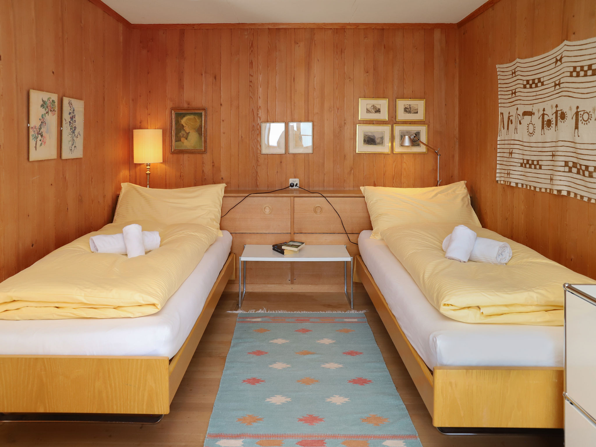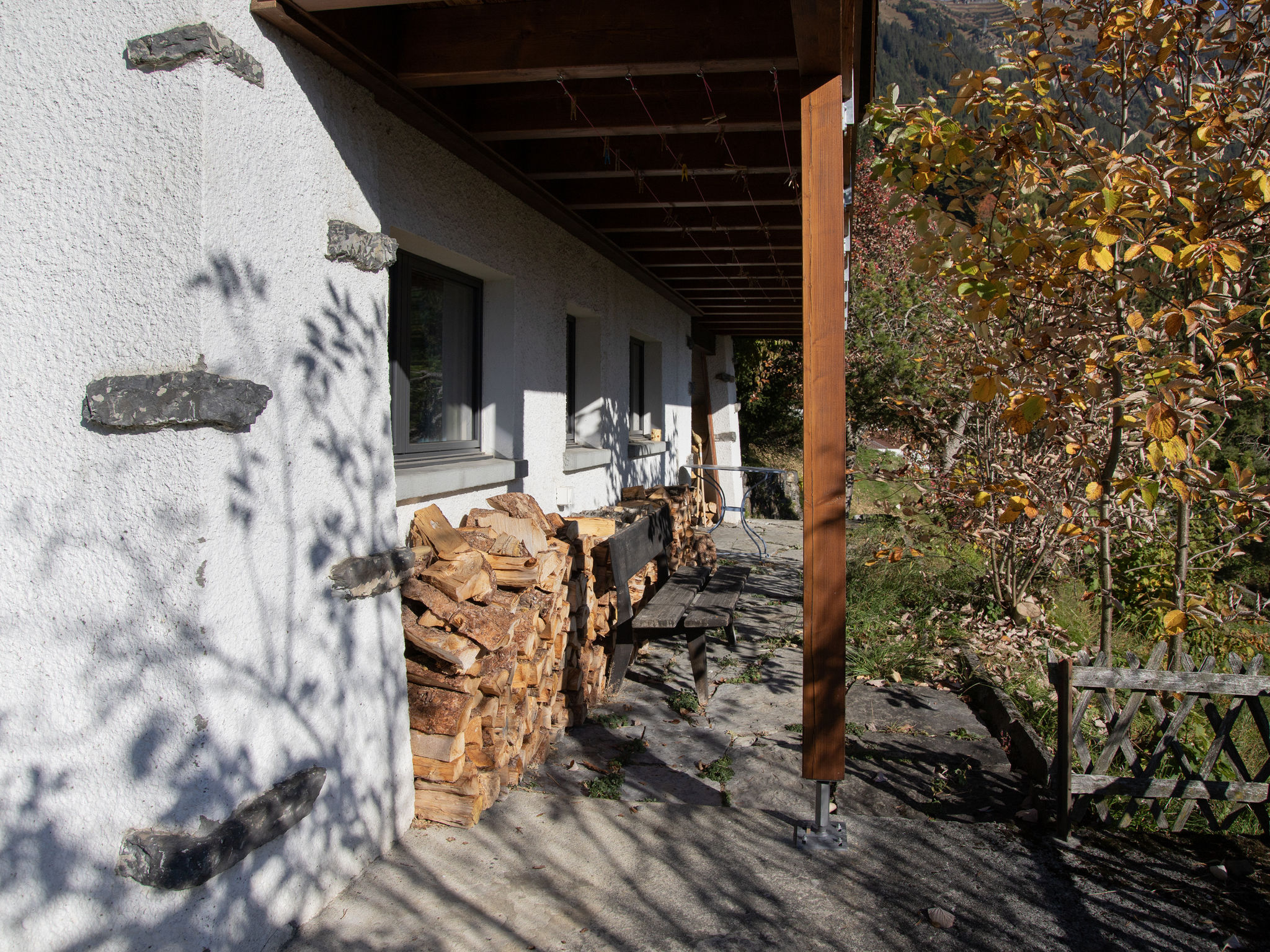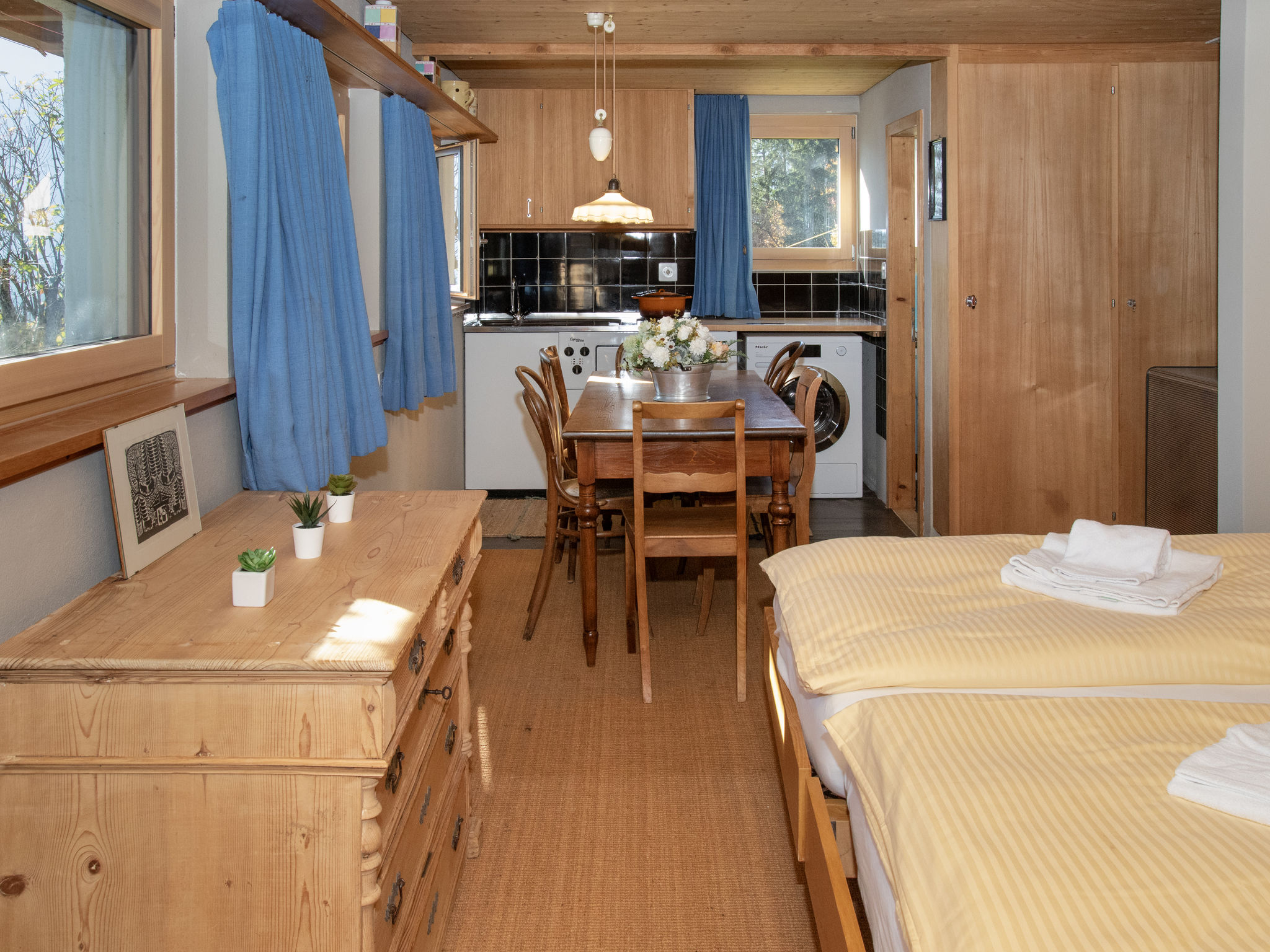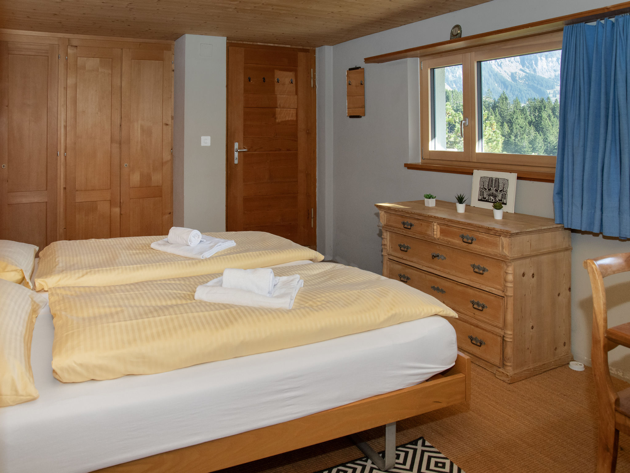 3-Zimmer-Chalet 75 m2. Geräumig, teilweise renoviert, modern und geschmackvoll eingerichtet: Wohn-/Esszimmer 30 m2 mit 1 Bett (90 cm, Länge 190 cm), Esstisch, Kabel-TV und Internationale TV-Sender (Flachbildschirm), Radio und CD. Ausgang zum Balkon, Richtung Süden. 1 Zimmer 14 m2 mit 2 Betten (90 cm, Länge 190 cm), Bad/WC. Offene Küche (Backofen, Geschirrspüler, 4 Glaskeramikherd Platten, Toaster, Wasserkocher, elektrische Kaffeemaschine, Kapseln für die Kaffeemaschine (Nespresso) extra). Unteres Geschoss: (Aussentreppe) 25 m2, 1 Zimmer mit 2 Betten (90 cm, Länge 200 cm), sep. WC. Ausgang zum Gartensitzplatz. Balkonmöbel, Liegestühle (2). Herrliche Panoramasicht auf die Berge und das Tal. Zur Verfügung: Waschmaschine, Wäschetrockner (extra). Internet (Wireless LAN, gratis). Bitte beachten: ein Doppelzimmer liegt außerhalb der Wohnung. Nichtraucher-Haus. Maximal 1 Haustier/Hund erlaubt. Keine interne Verbindung zwischen den Etagen.